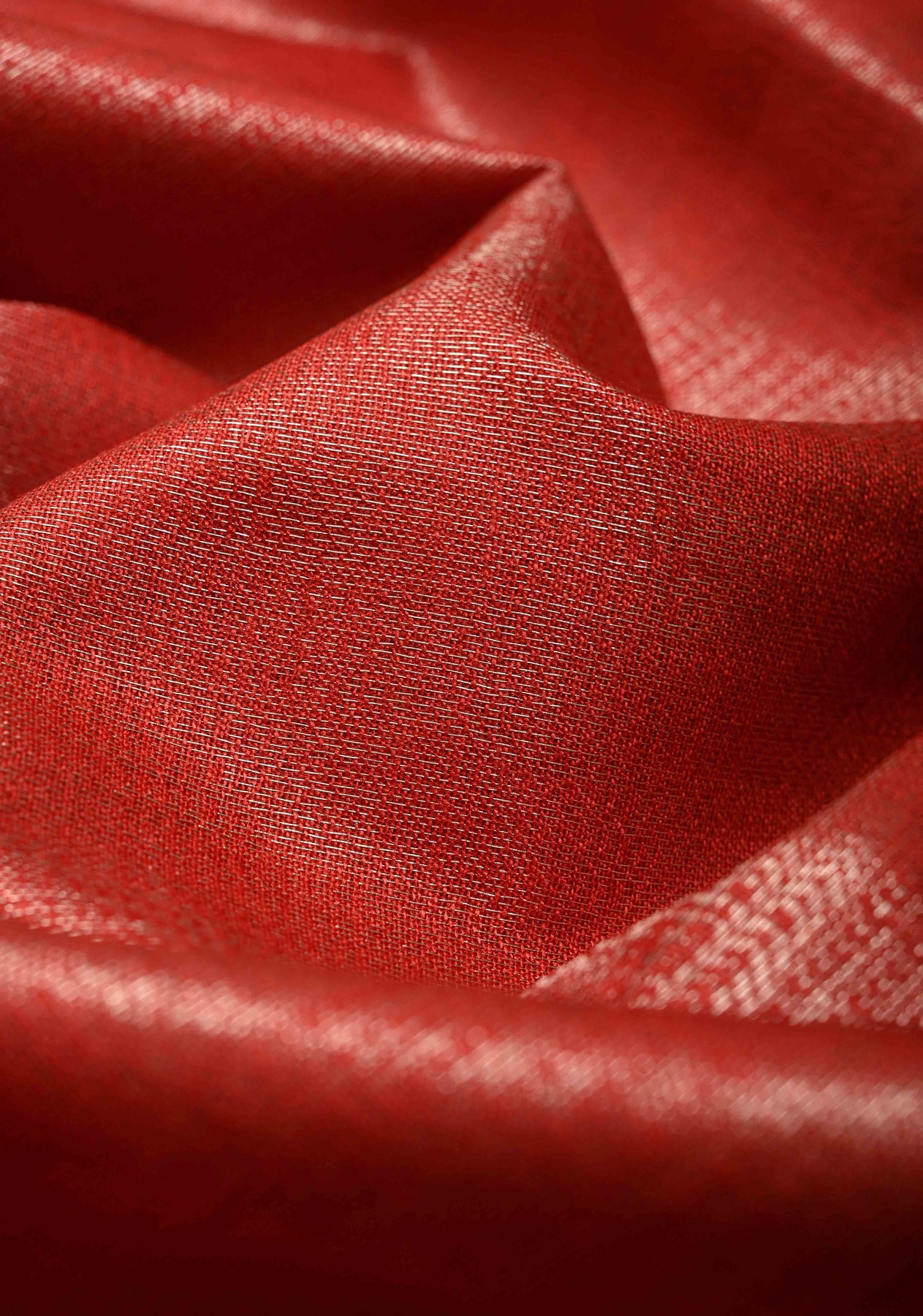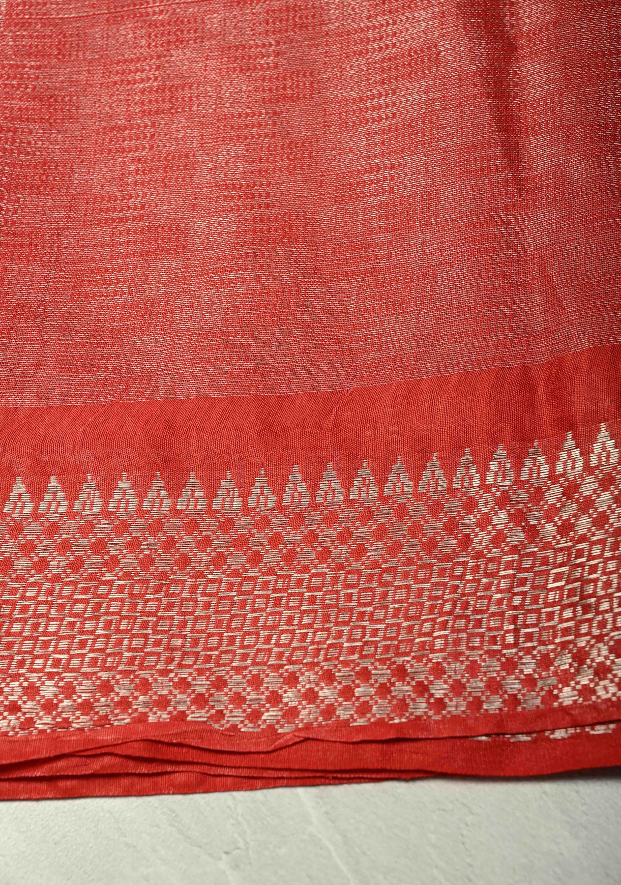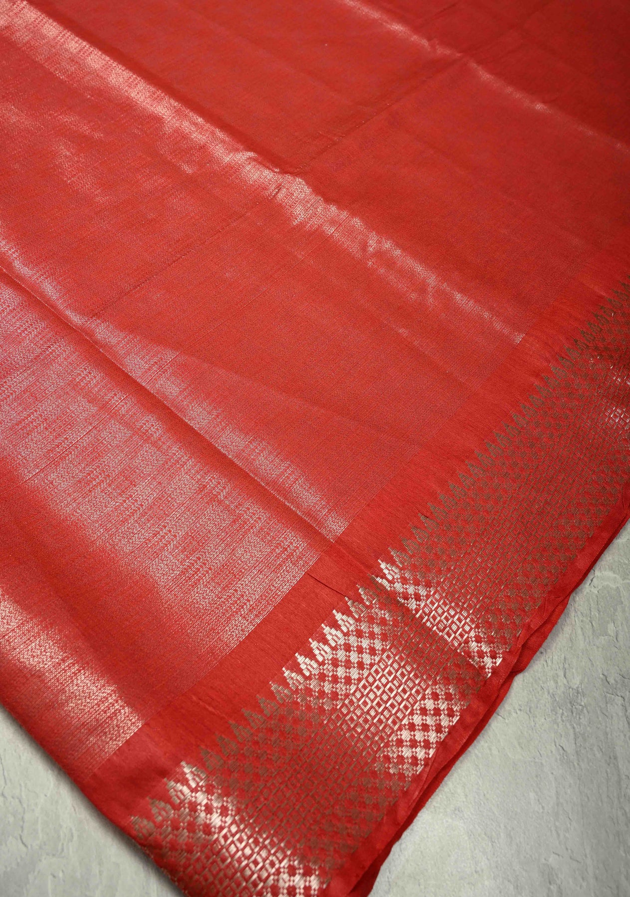 Radiate festive charm with this Red Semi Tussar Tissue Saree, crafted with a lustrous texture that adds a soft, elegant sheen to every drape. The vibrant red body exudes and celebration, while the beautifully woven temple silver zari border enhances the saree with a touch of traditional artistry. Lightweight, graceful, and visually striking, this saree is perfect for weddings, festive gatherings, and cultural occasions. A stunning blend of modern shimmer and timeless heritage.
