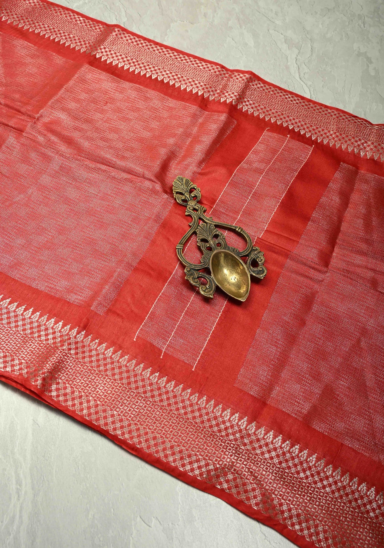 Red Semi Tussar Tissue Saree with Temple Silver Zari Border