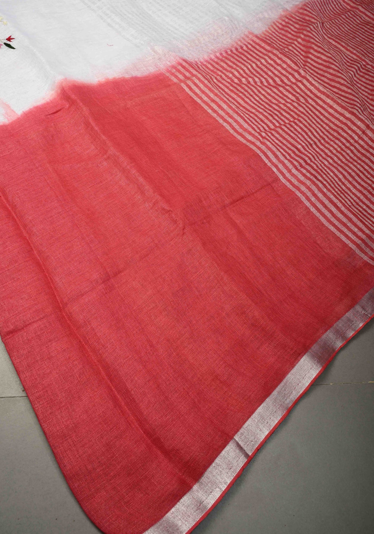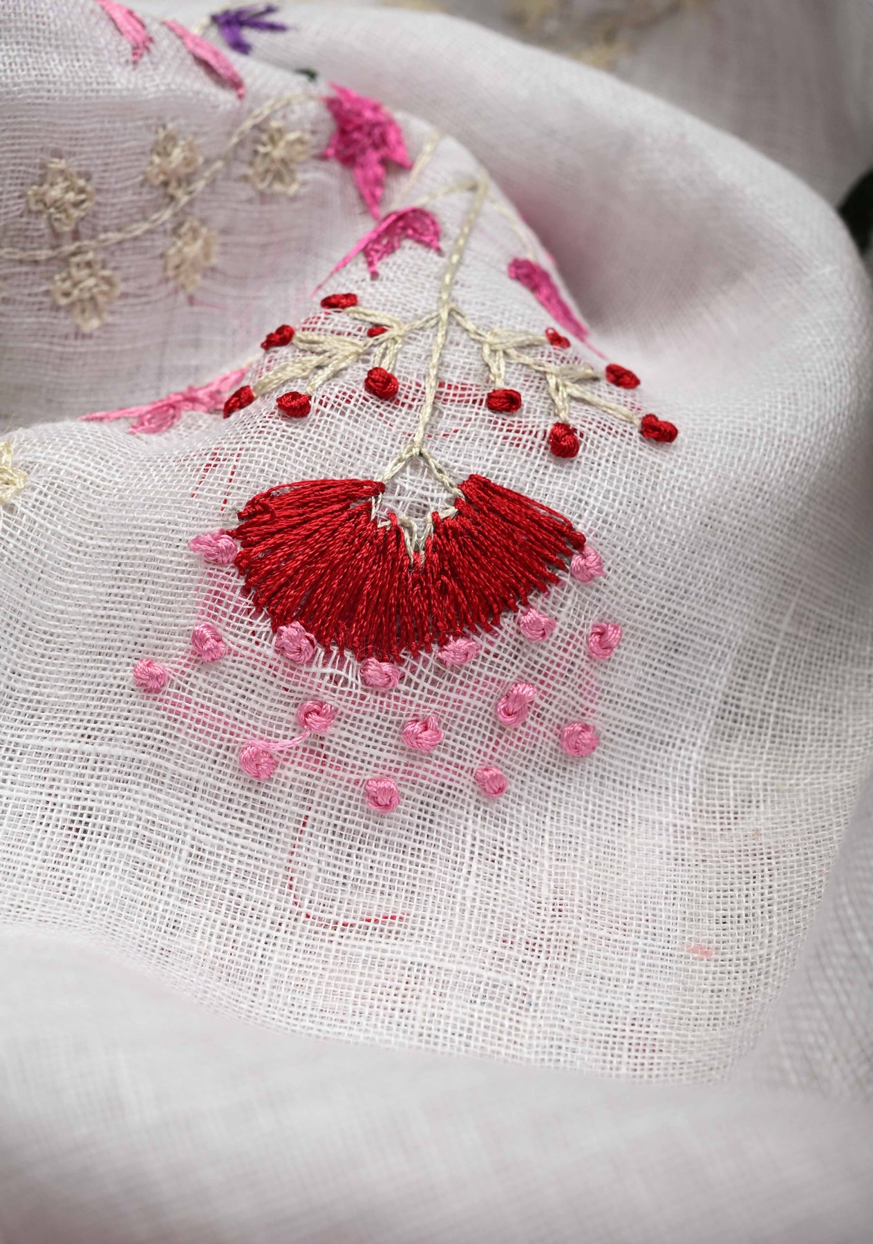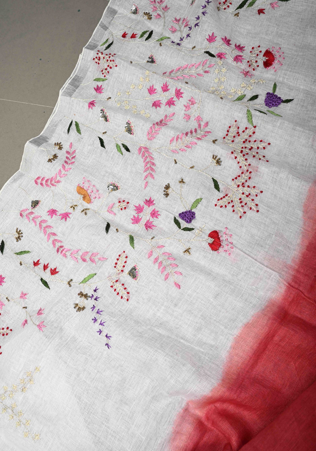 Hand embroidery began thousands of years ago in ancient India and other civilizations, where people decorated clothes and fabrics with needles and thread. The ombre mix of white and red hint of modern edge, this linen hand embroidered drape is made for serene moments and effortless, elevated dressing.