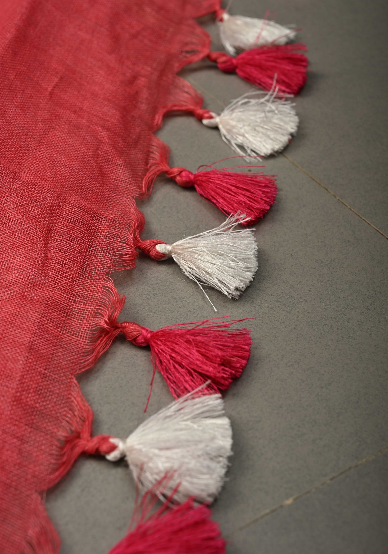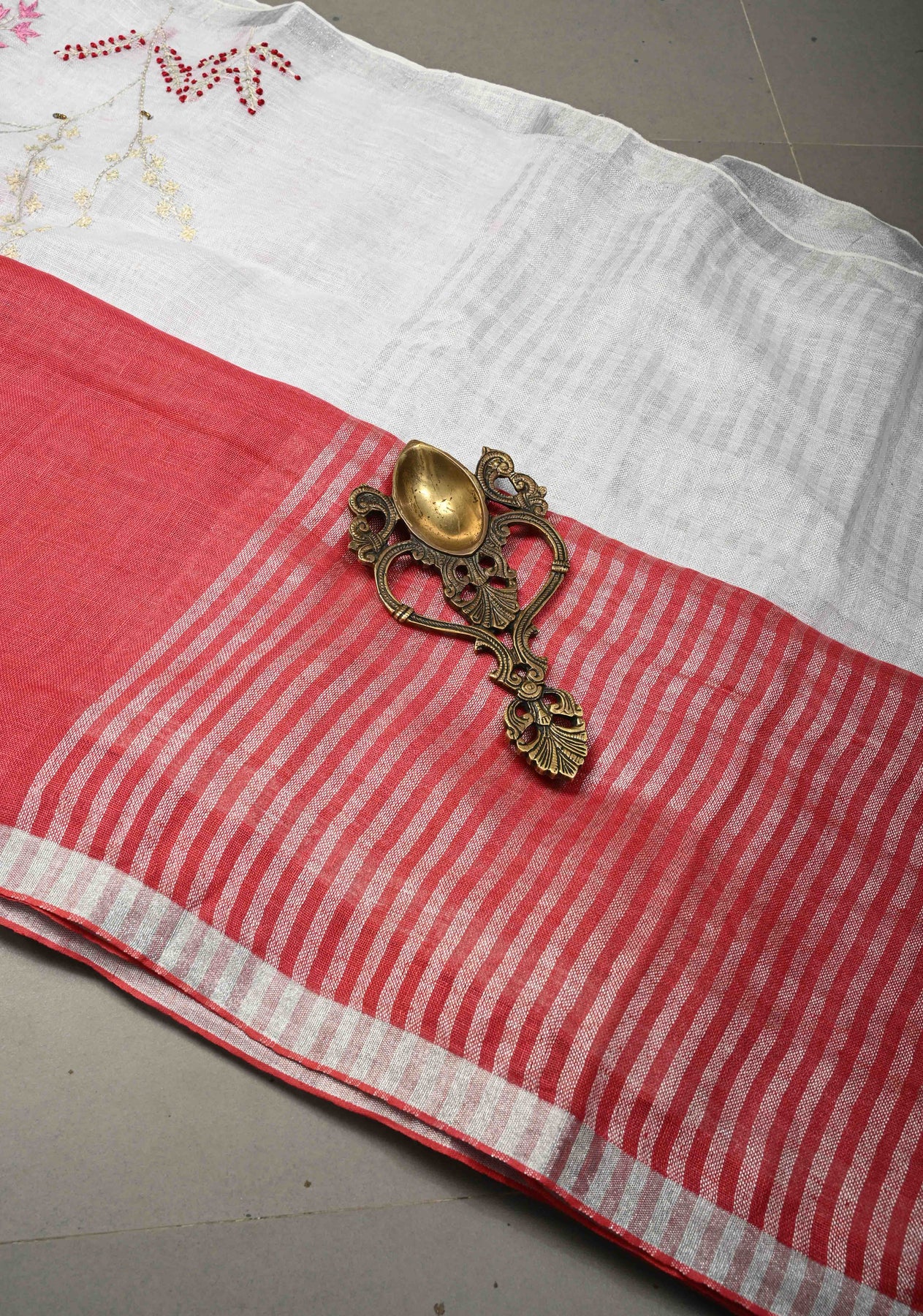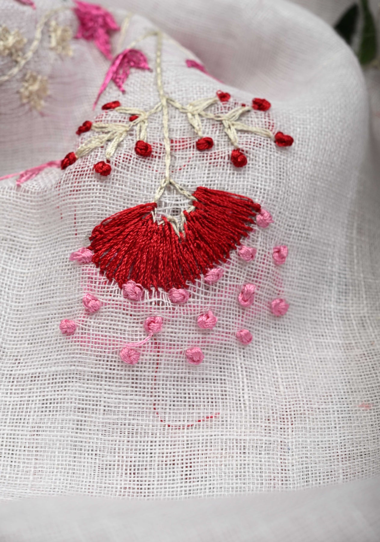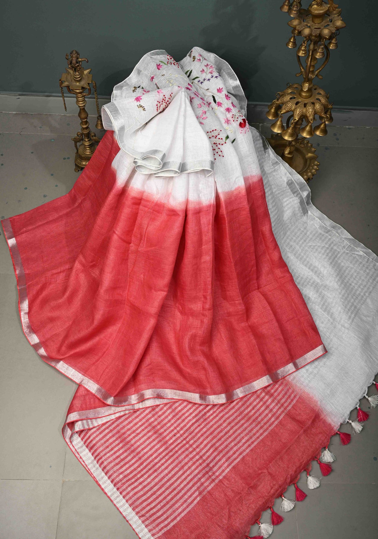 Hand embroidery began thousands of years ago in ancient India and other civilizations, where people decorated clothes and fabrics with needles and thread. The ombre mix of white and red hint of modern edge, this linen hand embroidered drape is made for serene moments and effortless, elevated dressing.