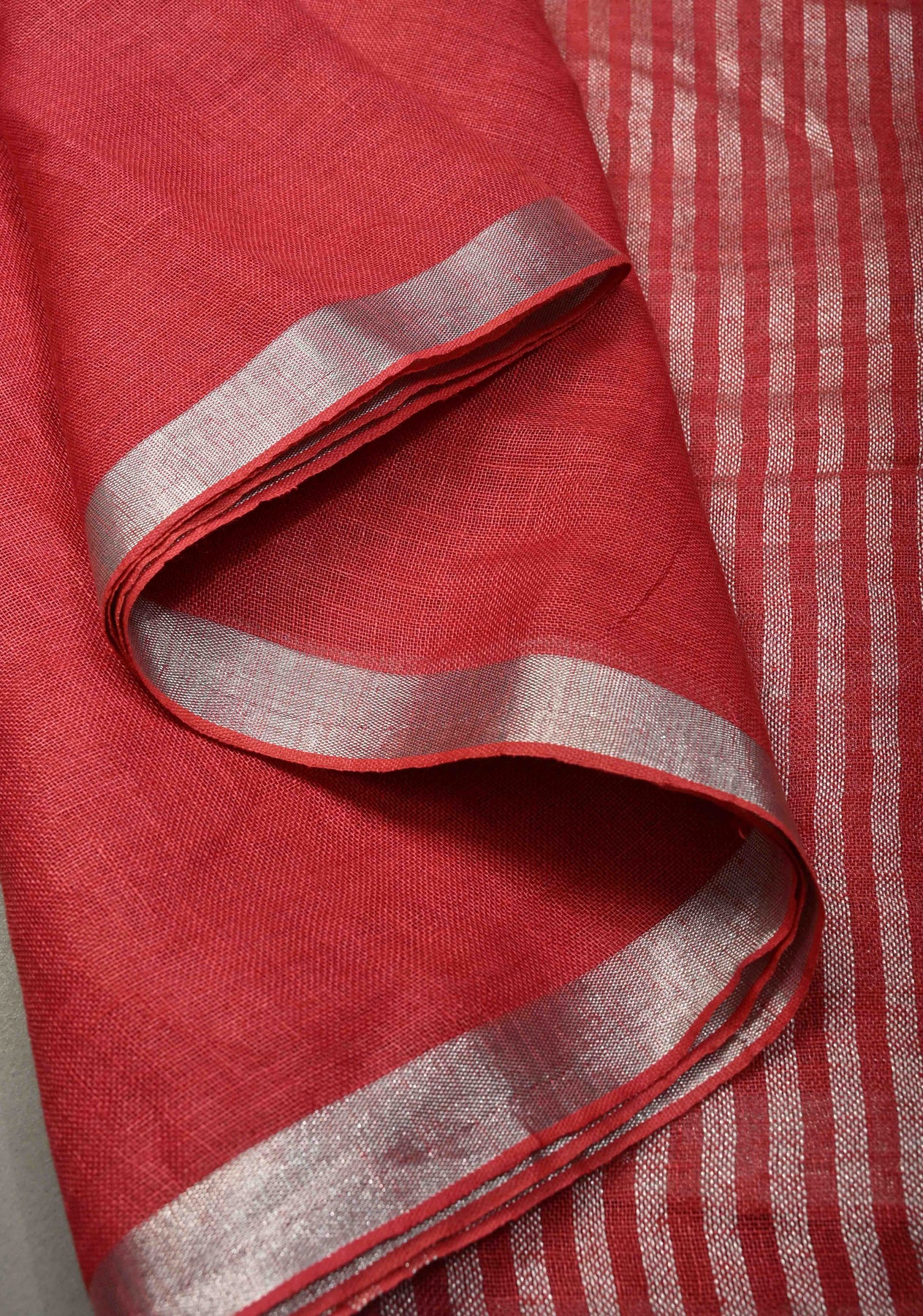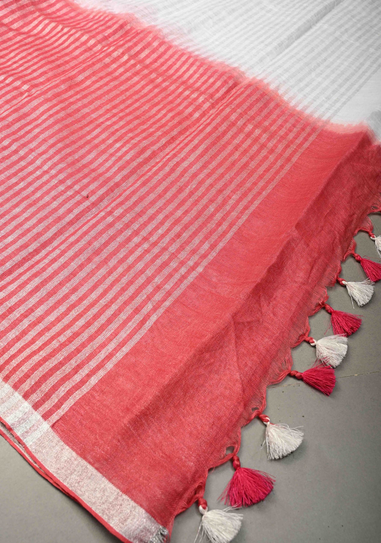 Bring effortless elegance to your wardrobe with this Red-White Anaari Linen Hand-Embroidered Saree, a perfect blend of artisanal craftsmanship and modern style. Woven from soft linen, this saree offers a lightweight, breathable drape that flows gracefully, making it ideal for casual gatherings, office wear, or semi-formal occasions.