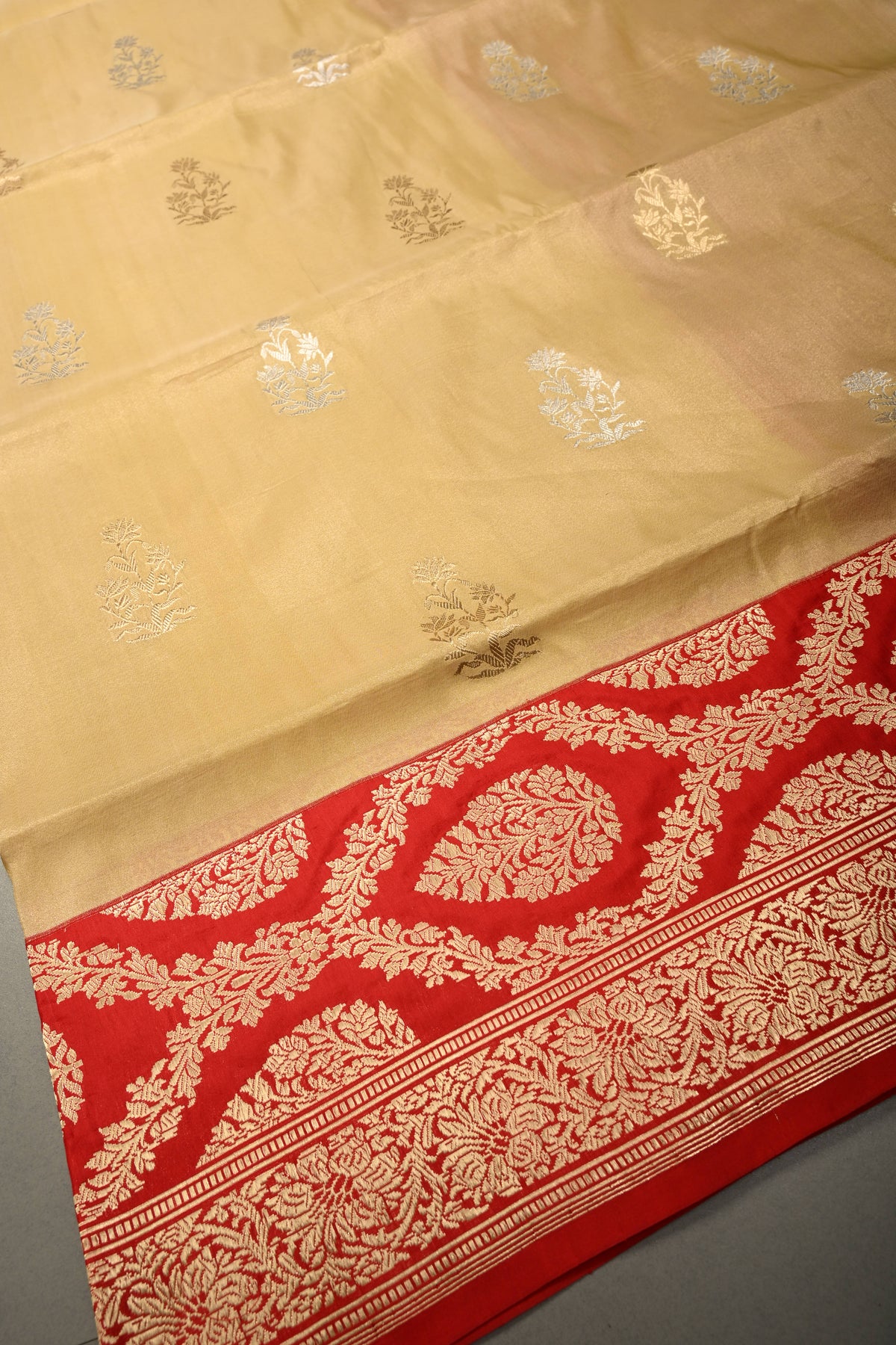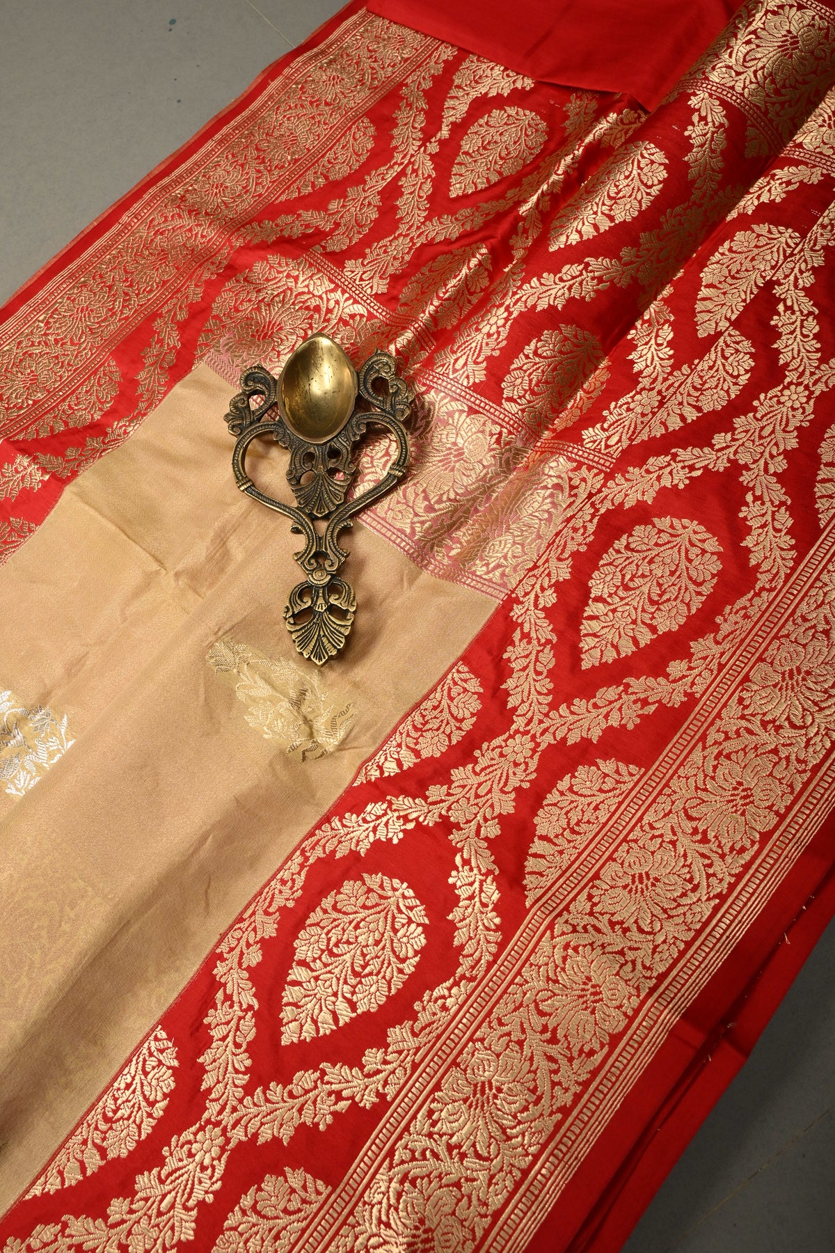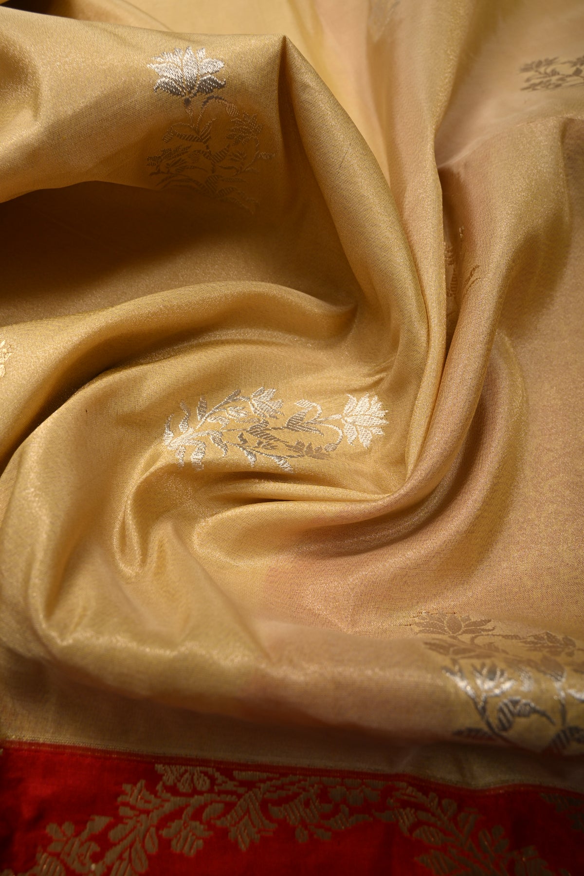 Sandalwood Banarasi Katan Tissue Silk Saree with Soan-Rupa Buttas and Contrast Zari Border | SILK MARK CERTIFIED | Shobitam
