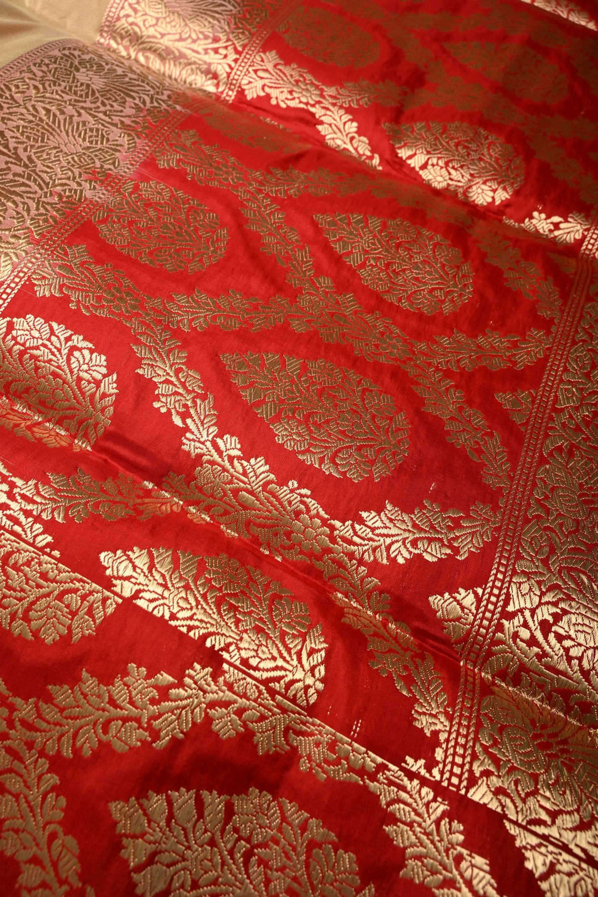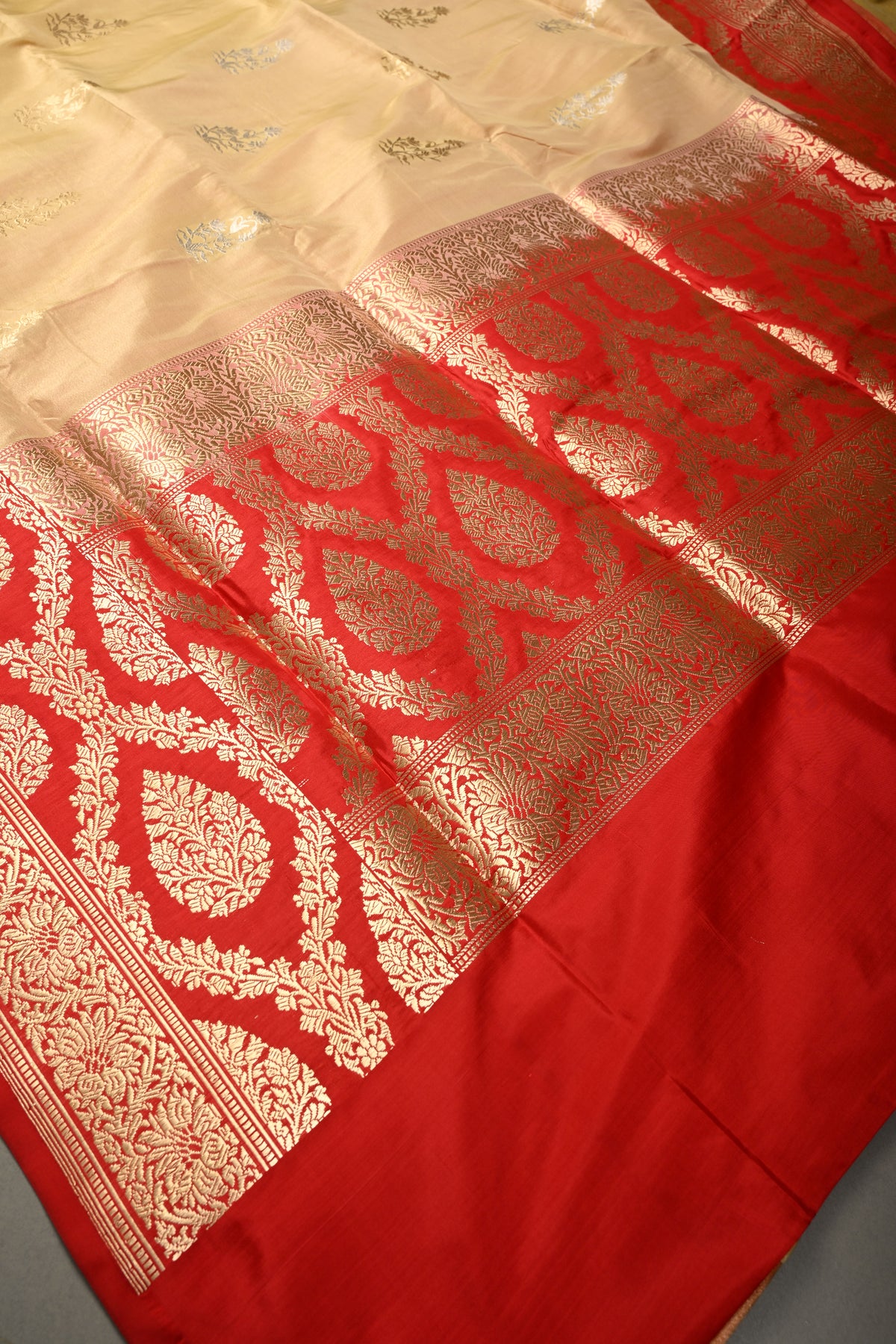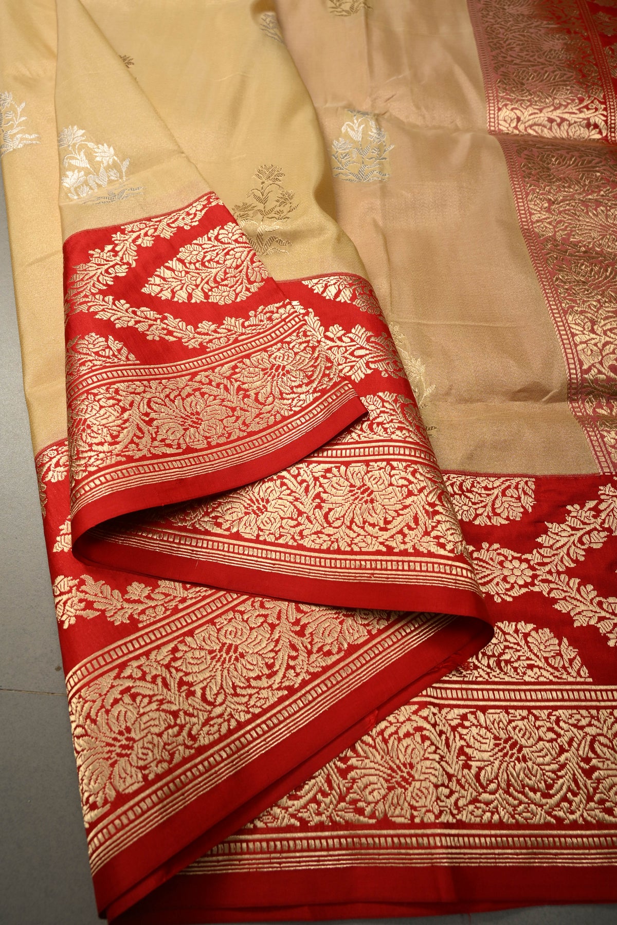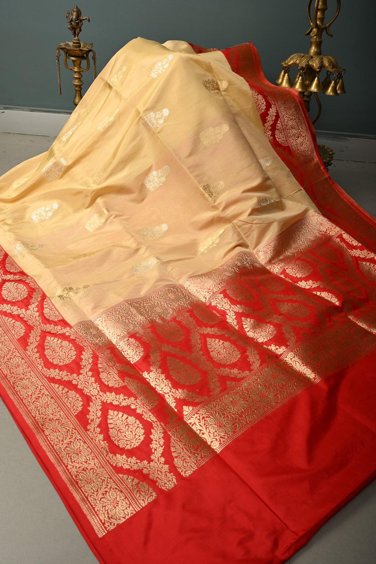 Sandalwood Banarasi Katan Tissue Silk Saree with Soan-Rupa Buttas and Contrast Zari Border | SILK MARK CERTIFIED | Shobitam