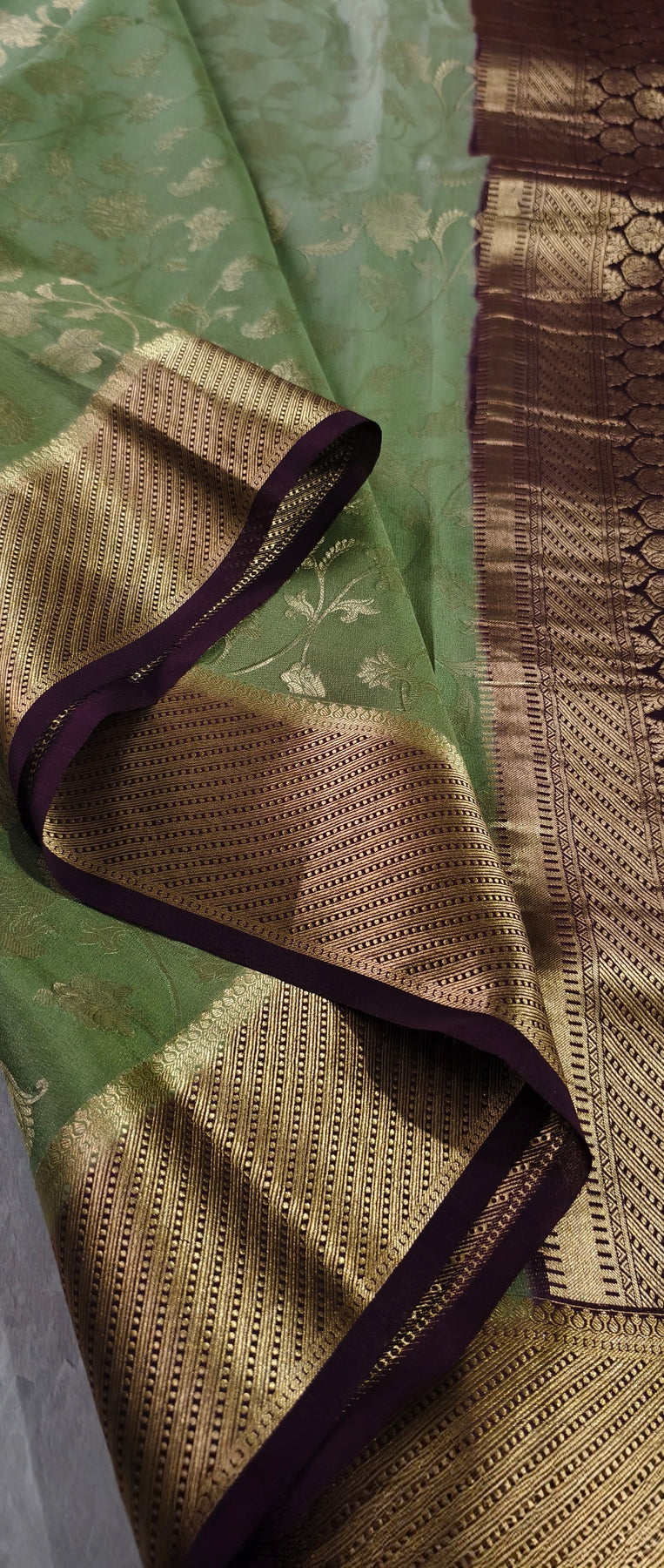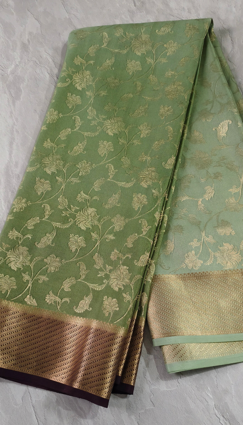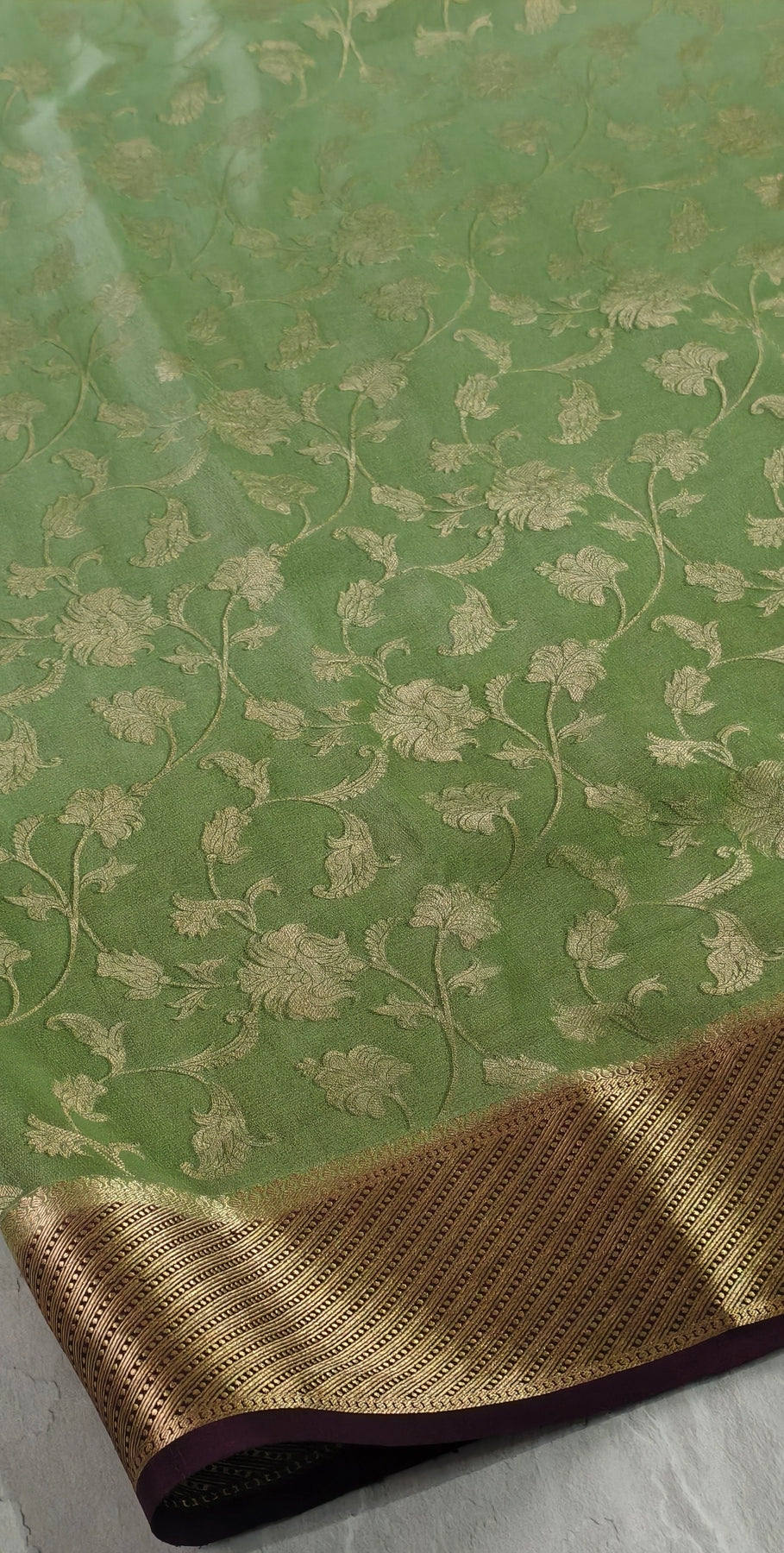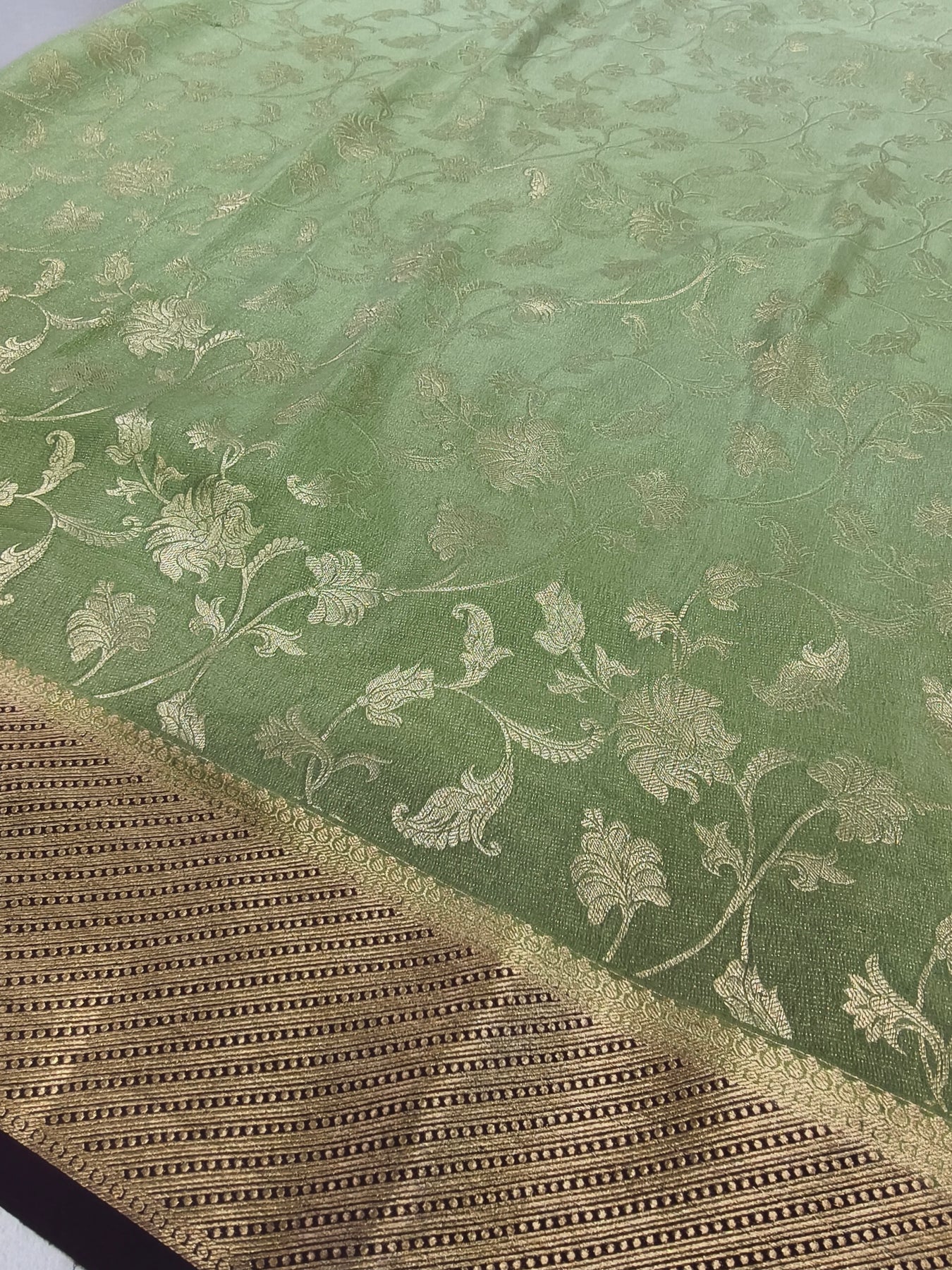 Shades of Sage Green Ombre Mysore Silk Saree with Floral Brocade Jaal and Contrast Zari Border | SILK MARK CERTIFIED