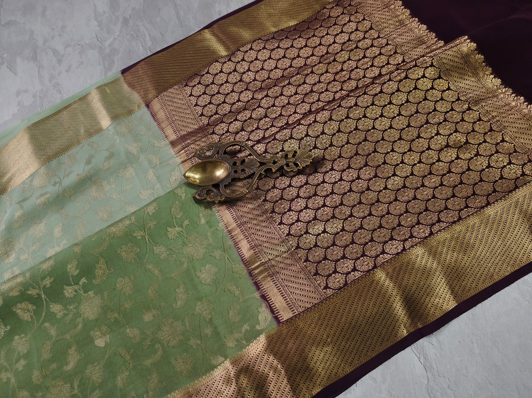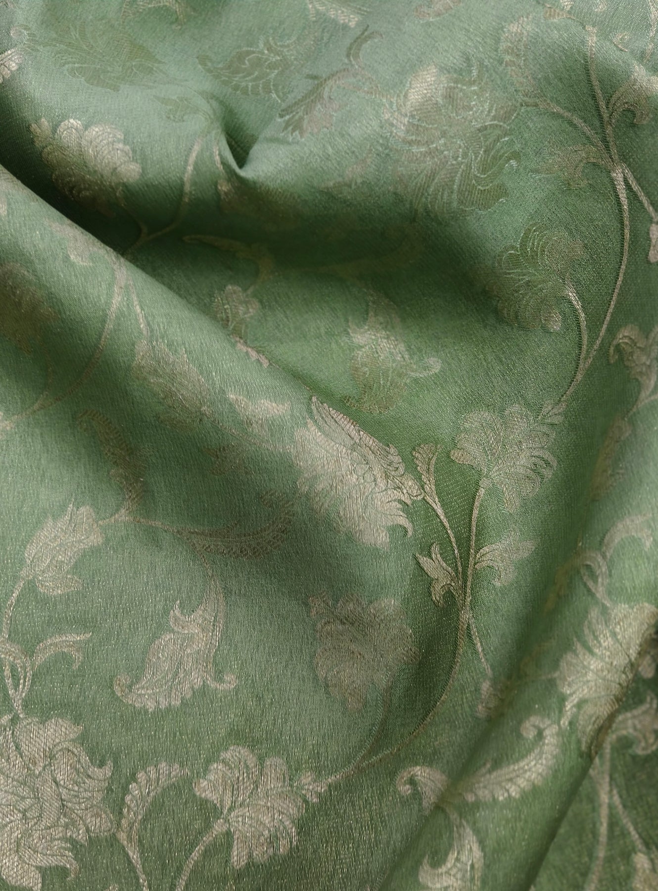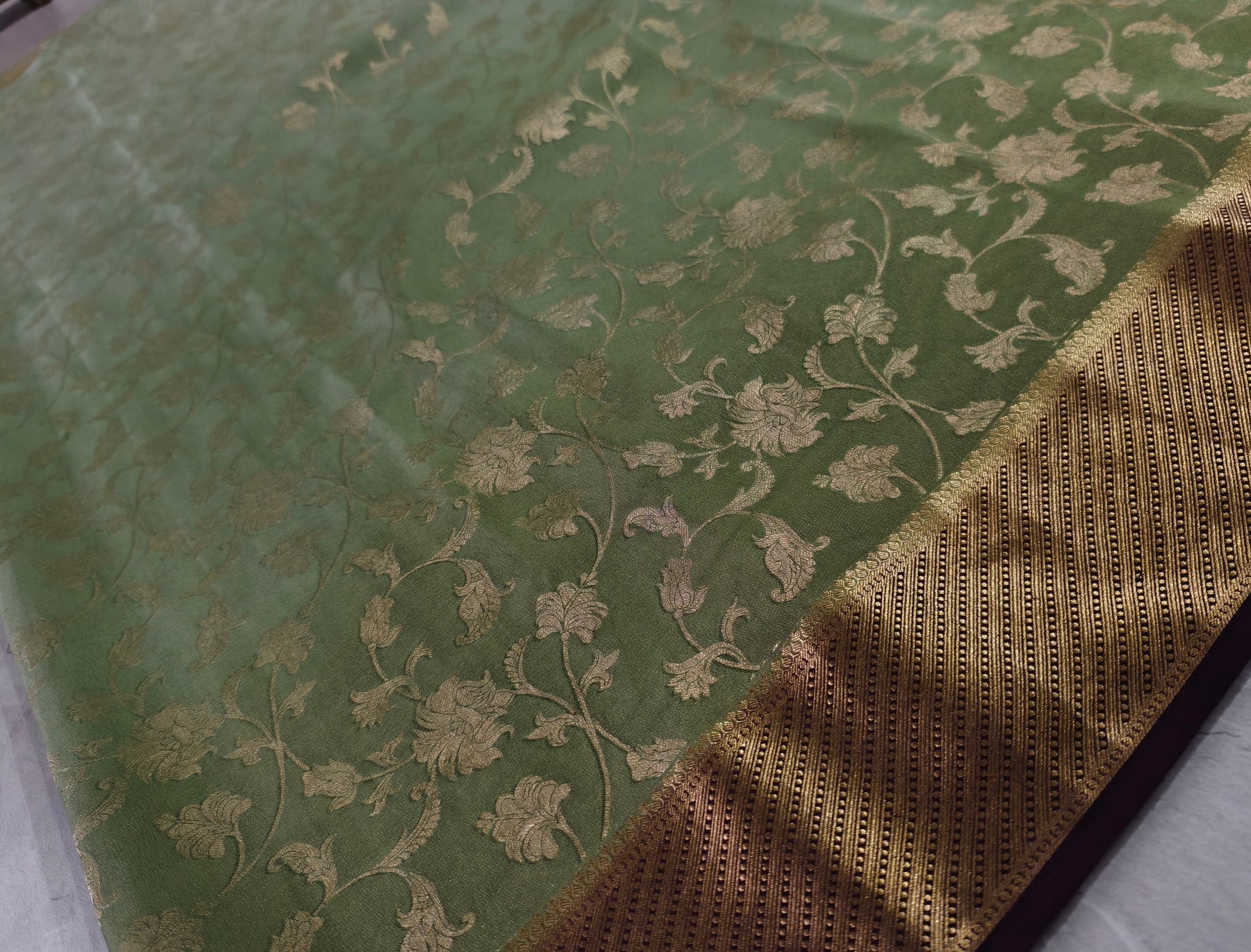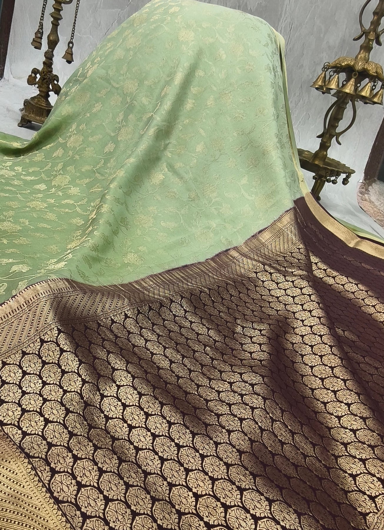 Shades of Sage Green Ombre Mysore Silk Saree with Floral Brocade Jaal and Contrast Zari Border | SILK MARK CERTIFIED