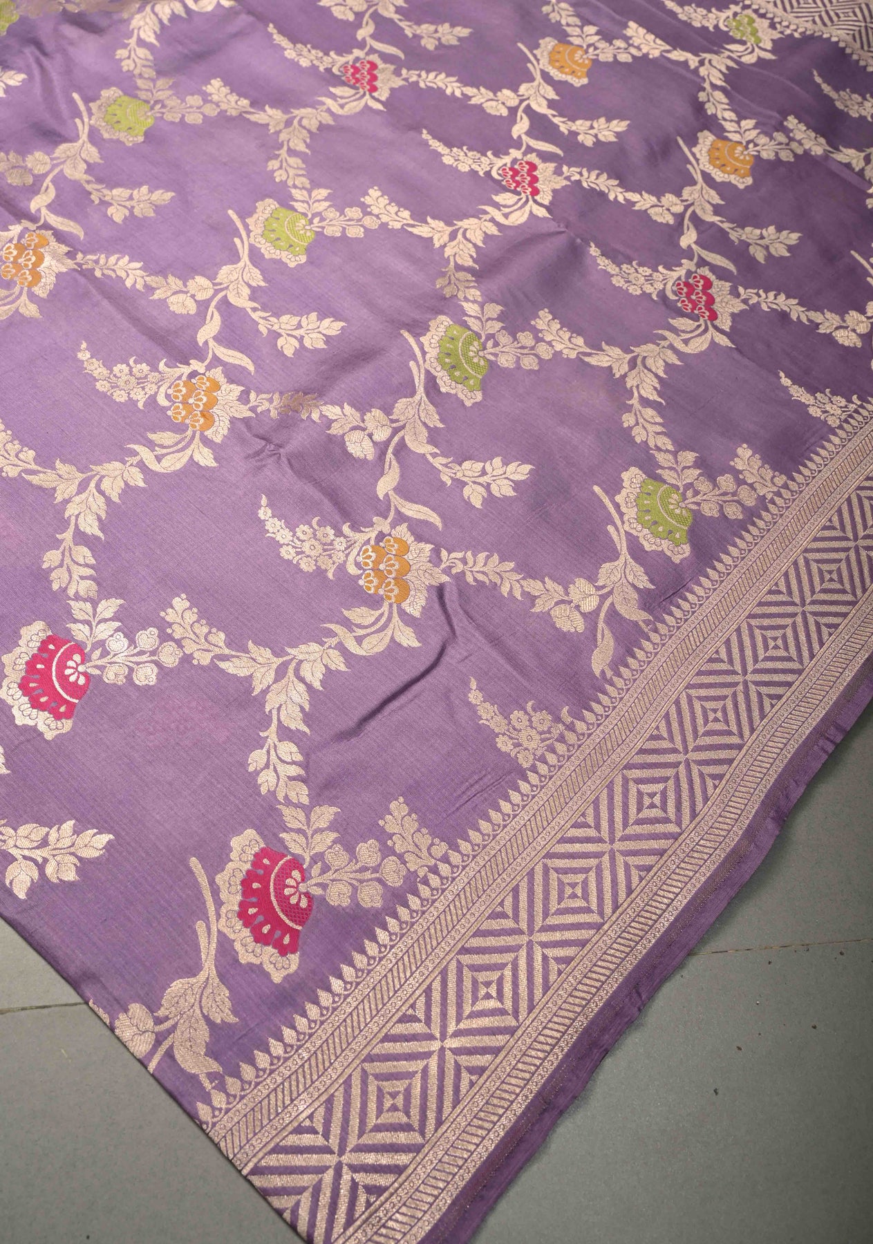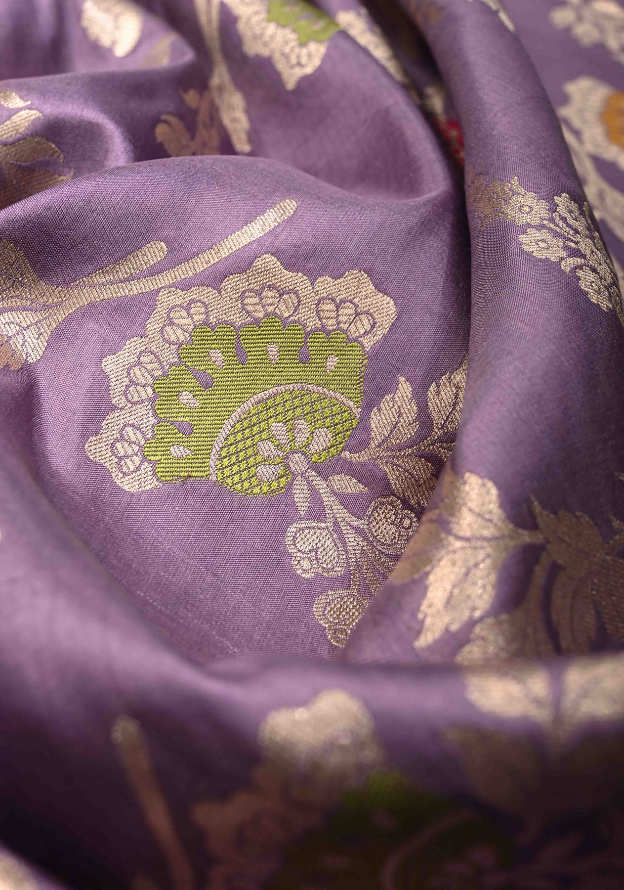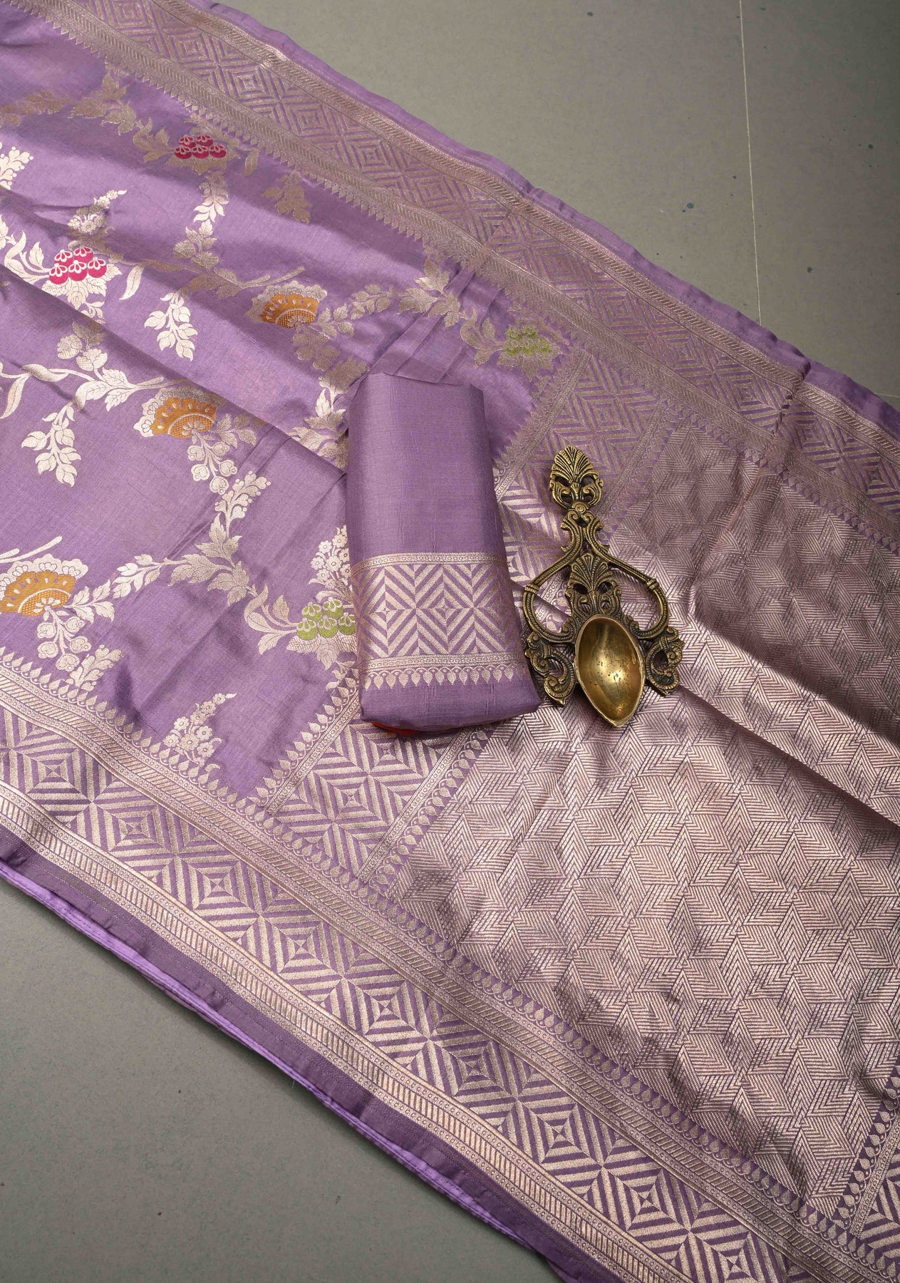 Drape yourself in timeless elegance with this Soft Lavender Purple Banarasi Katan Silk Saree. Crafted with luxurious finesse, the saree features an exquisite Meenakari floral brocade jaal woven across the body, beautifully accented with rich zari detailing. The classic zari border adds a regal finish, enhancing its festive charm. With its smooth texture, graceful fall, and subtle sheen, this saree is perfect for weddings, festive occasions, and grand celebrations, offering a refined blend of tradition and sophistication