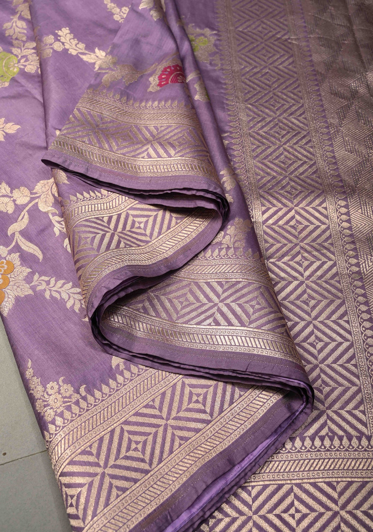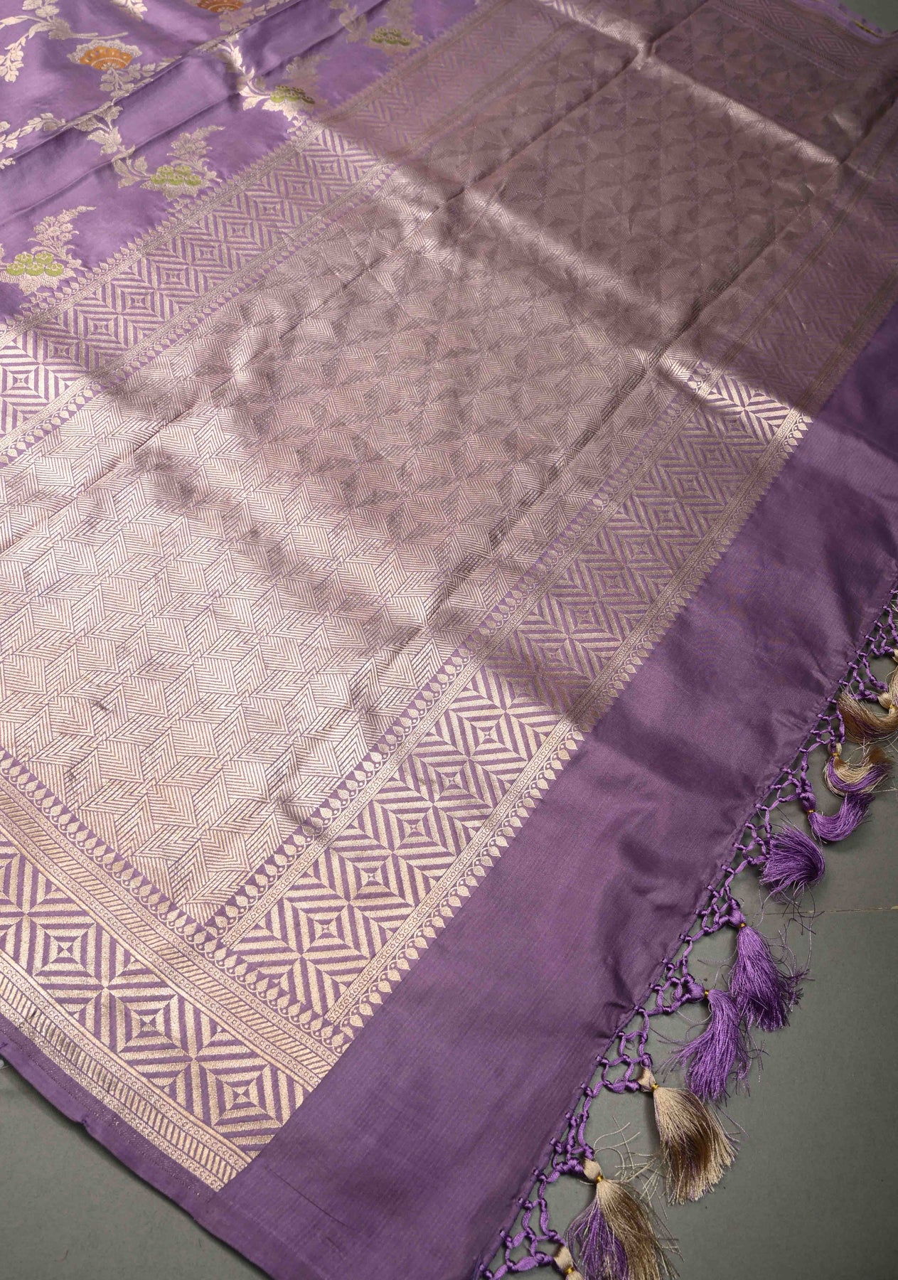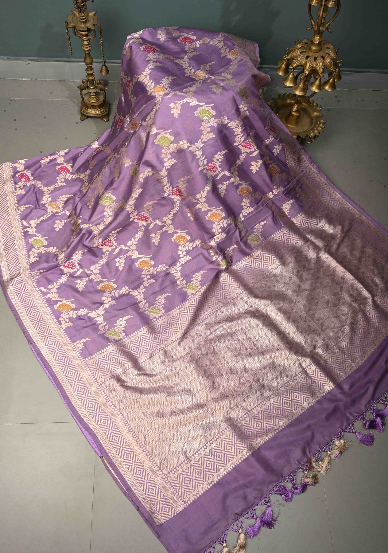 Drape yourself in timeless elegance with this Soft Lavender Purple Banarasi Katan Silk Saree. Crafted with luxurious finesse, the saree features an exquisite Meenakari floral brocade jaal woven across the body, beautifully accented with rich zari detailing. The classic zari border adds a regal finish, enhancing its festive charm. With its smooth texture, graceful fall, and subtle sheen, this saree is perfect for weddings, festive occasions, and grand celebrations, offering a refined blend of tradition and sophistication
