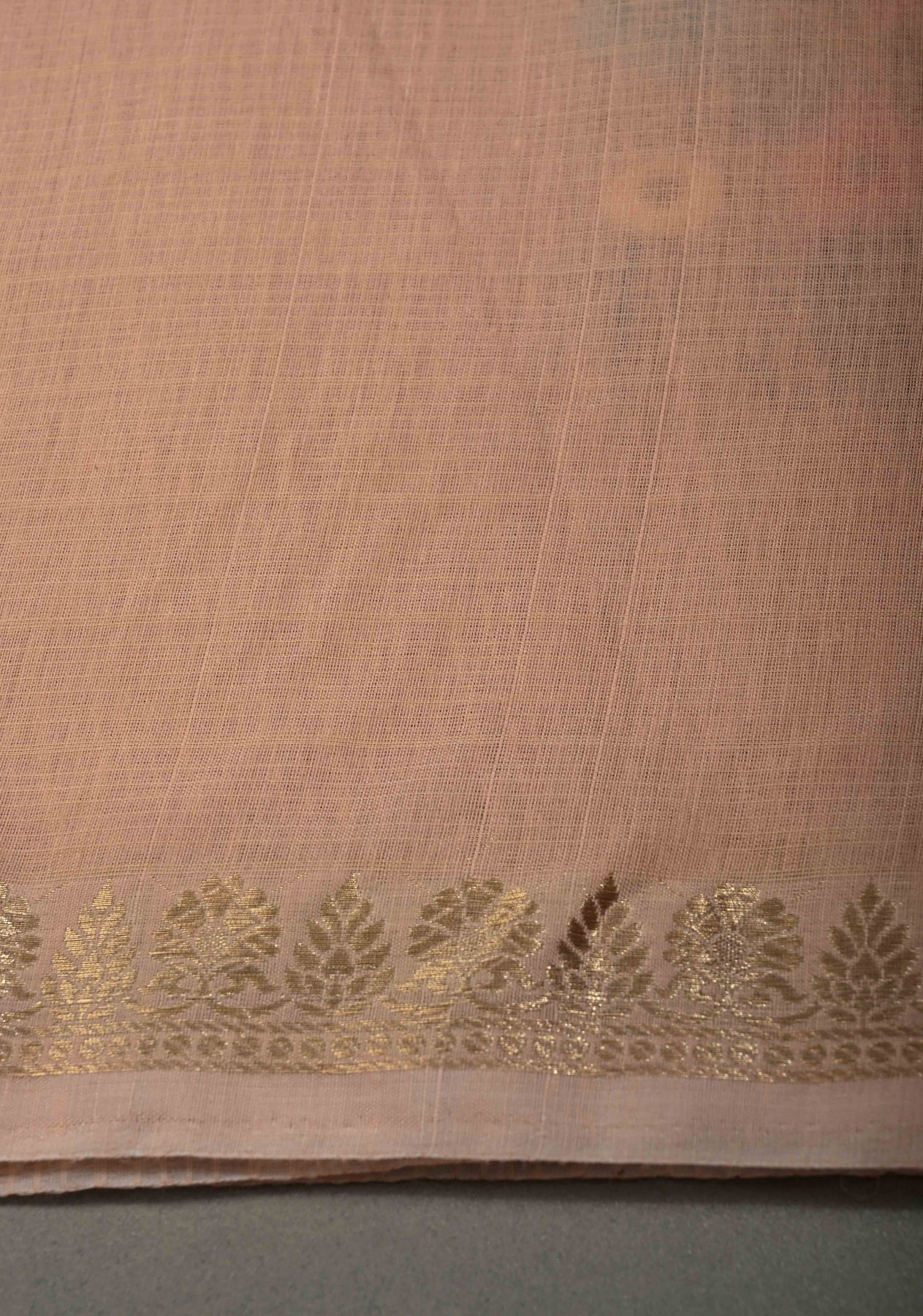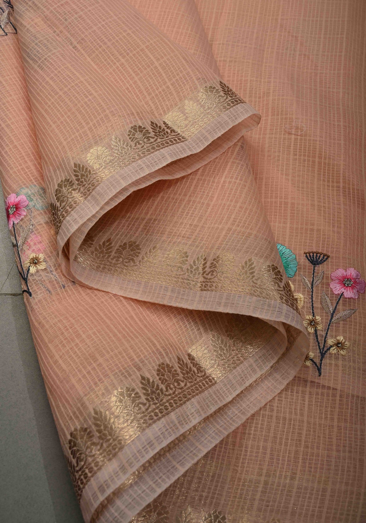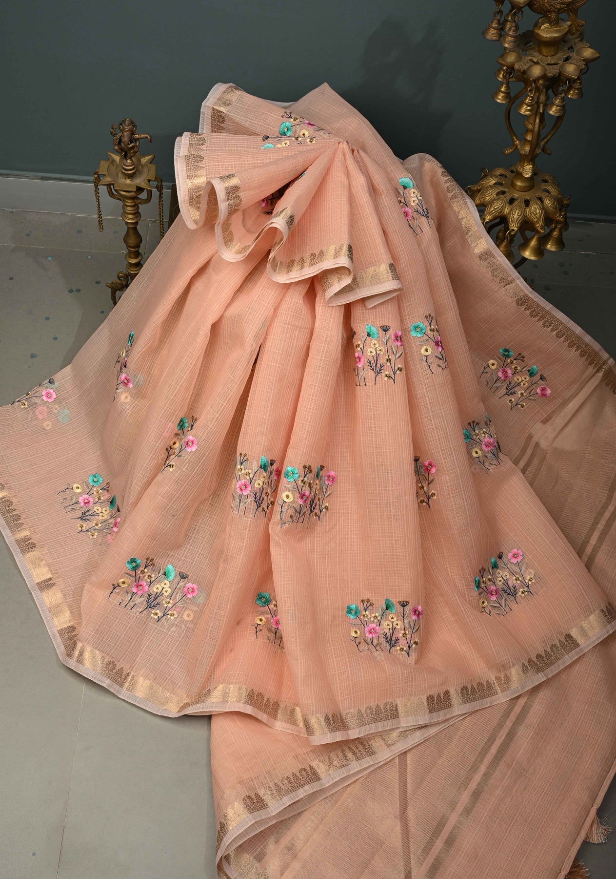This Soft Peach Blush Kota Doria cotton saree offers a delicate balance of traditional charm and contemporary elegance. Crafted from fine Kota Doria cotton, the saree is lightweight and breathable, ensuring comfort throughout the day. The saree features intricate Meenakari floral machine embroidery, adding a touch of artistry and sophistication to its overall design. A minimal zari border gracefully frames the saree, providing just the right amount of shimmer without overpowering the subtle floral embroidery. Perfect for daytime events, casual gatherings, or festive occasions, this saree is a timeless blend of elegance and ease.