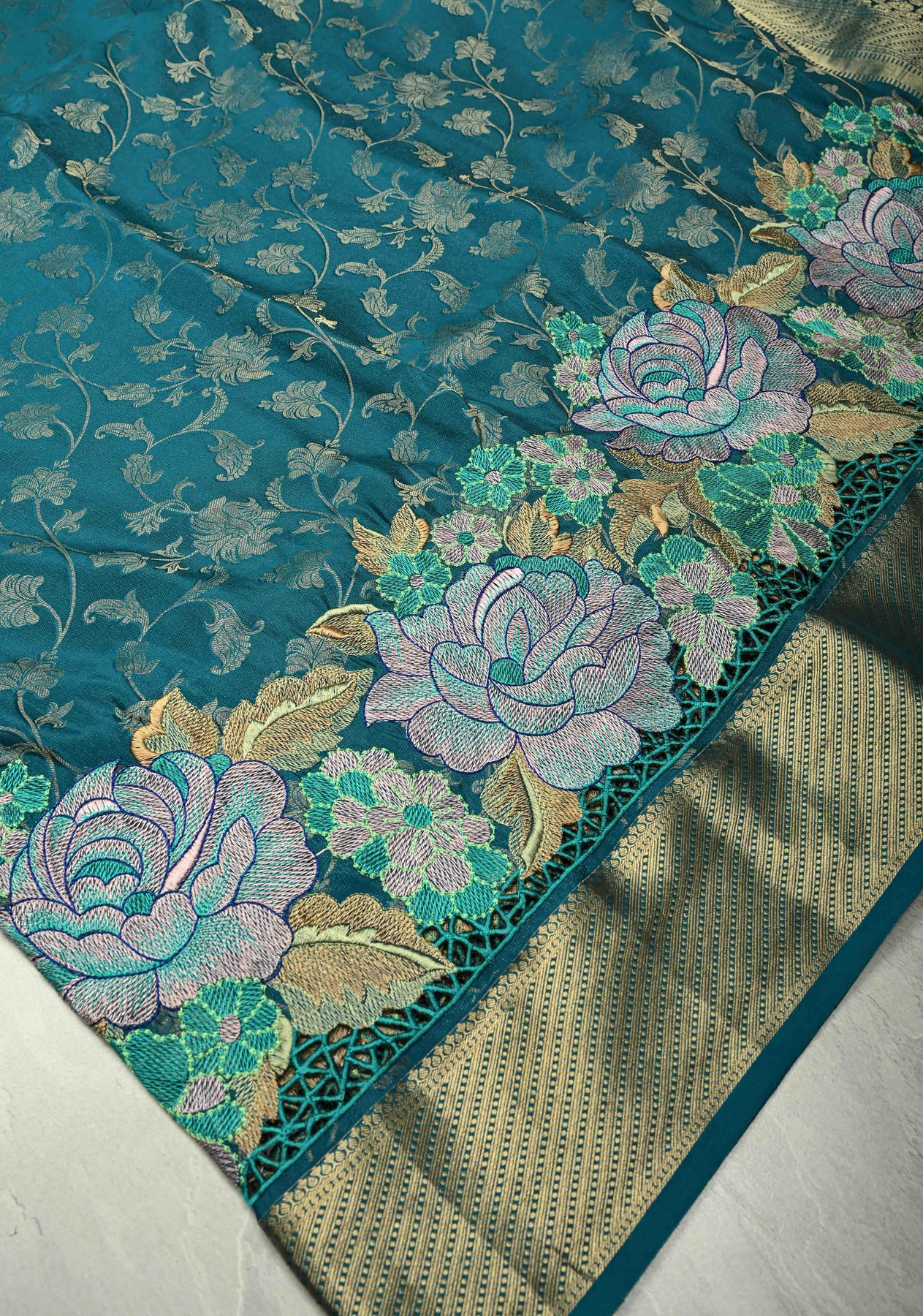 KSIC Grade Thickness Teal Green Muted Floral Brocade on Mysore Silk Saree with Machine Embroidery, Cutwork and Zari Border | SILK MARK CERTIFIED