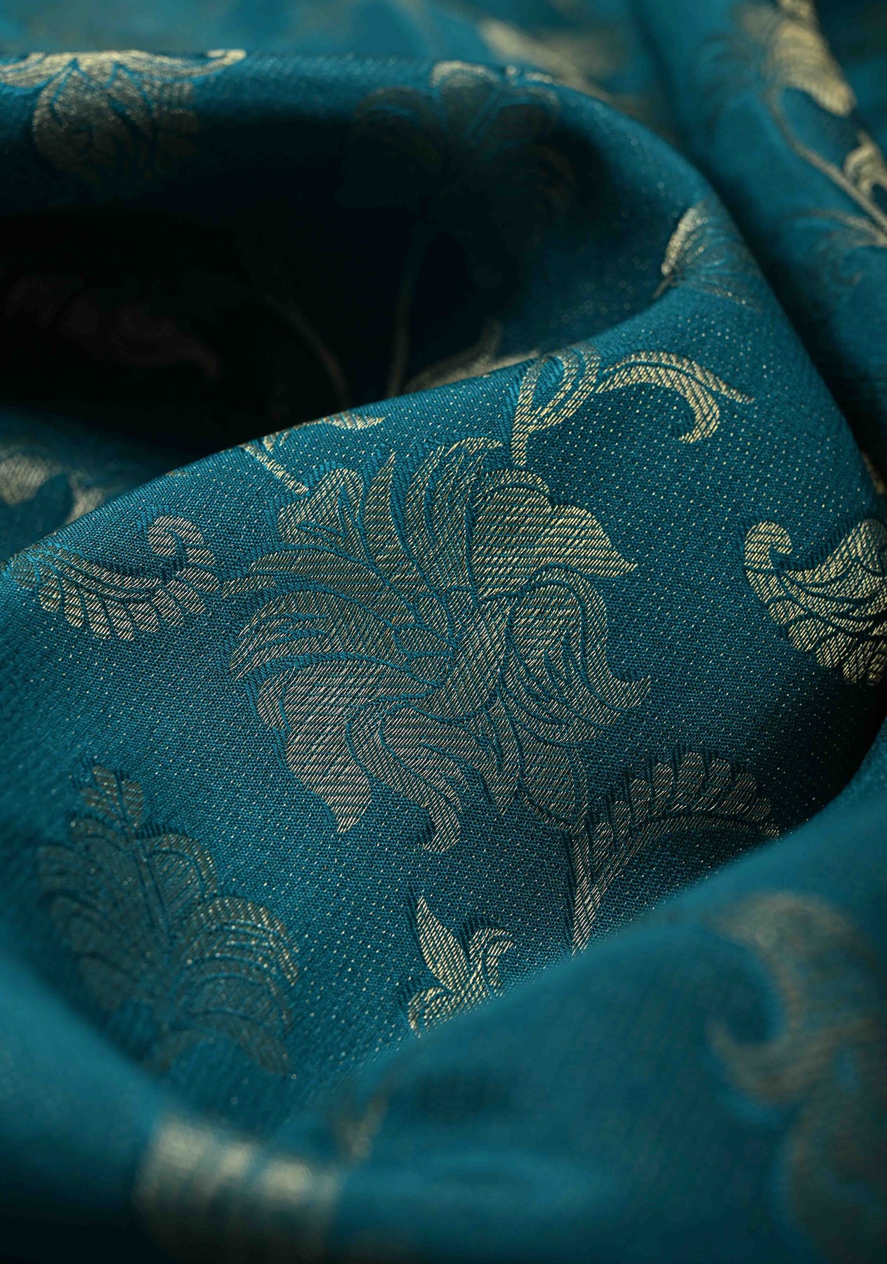 This stunning Teal Green Muted Floral Brocade on Mysore silk saree is a perfect blend of richness and artistry, featuring an all-over floral jaal that beautifully enhances its luxurious sheen. The smooth, lightweight texture of authentic Mysore silk allows the saree to drape gracefully, while the vivid teal hue adds a touch of contemporary elegance. Intricate machine embroidery highlights the floral motifs with precision, adding depth and dimension to the design. Along the edges, delicate cutwork detailing creates an exquisite, handcrafted finish that elevates the saree’s overall appeal. Elegant, vibrant, and meticulously designed, this saree is an ideal choice for festive occasions, weddings, and special celebrations where you want to make a refined yet striking statement.