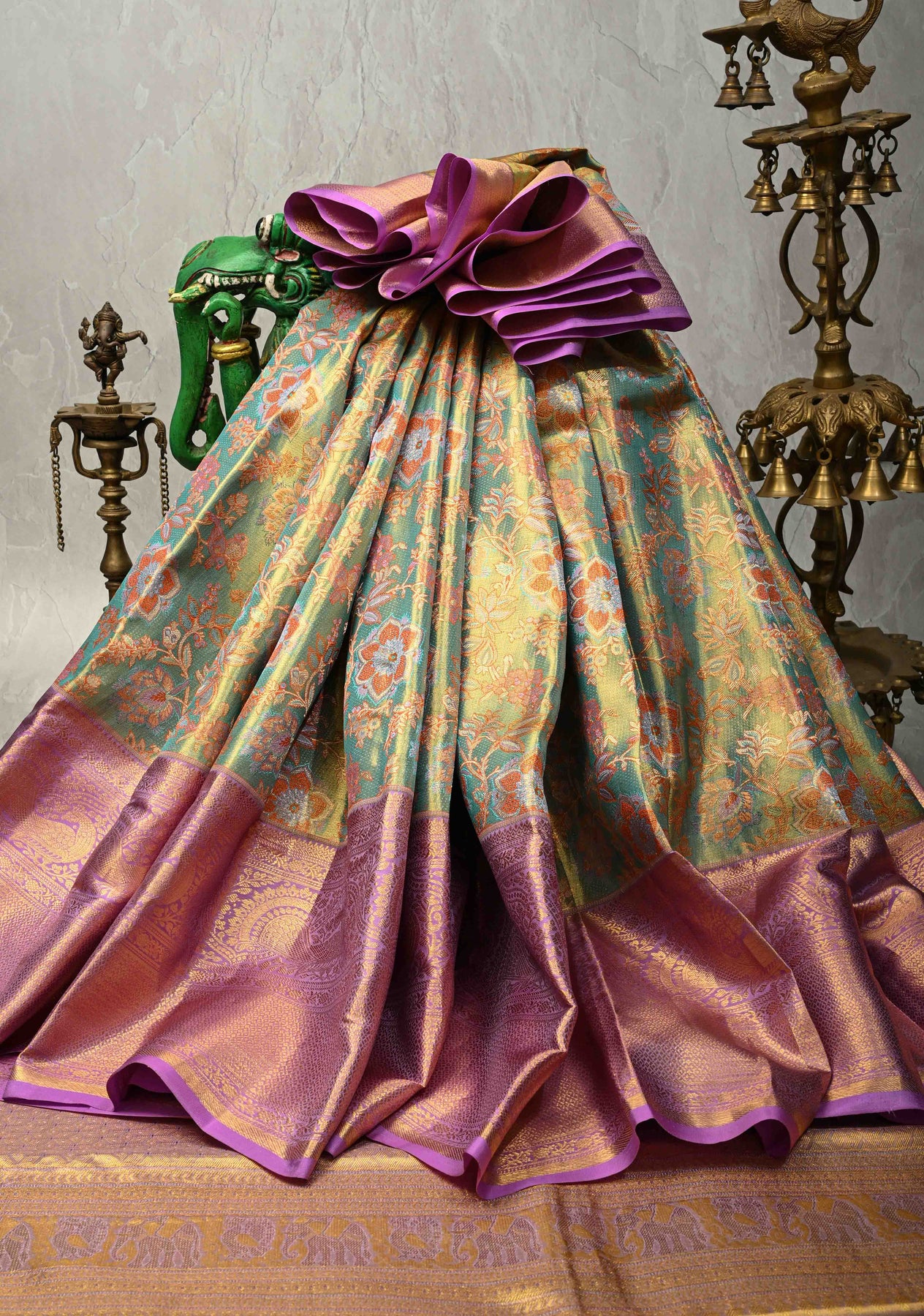 This turquoise pure Kanjivaram tissue silk saree is a stunning blend of vibrant color and intricate artistry. The turquoise hue is beautifully complemented by an elaborate meenakari floral jaal, adding delicate, colorful details that evoke traditional charm. The saree is further enhanced with a contrast wide zari border, creating a regal frame that elevates its overall elegance. Perfect for weddings, festive occasions, and grand celebrations, this saree reflects the timeless beauty and craftsmanship of South Indian weaving.