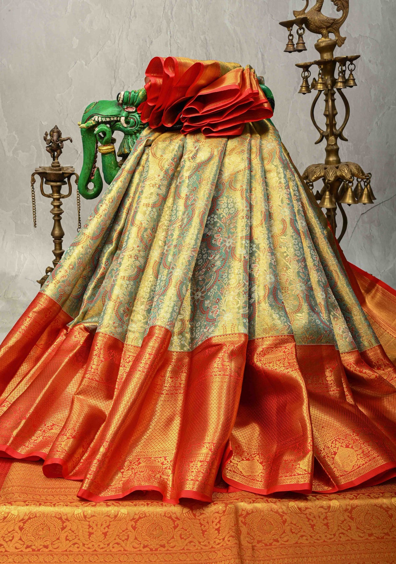 This breathtaking Turquoise pure Kanjivaram tissue silk saree is a radiant blend of luxury and traditional artistry. The luminous tissue silk body is richly adorned with intricate Meenakari floral brocade jaal, creating a vibrant tapestry of color and craftsmanship against the refreshing turquoise hue. The detailed Meenakari work enhances the saree’s opulent texture, while the bold contrast wide zari border adds grandeur and a regal finish. Paired with a finely woven zari pallu, this saree is an exceptional choice for weddings, festive occasions, and statement celebrations rooted in timeless Kanjivaram heritage.