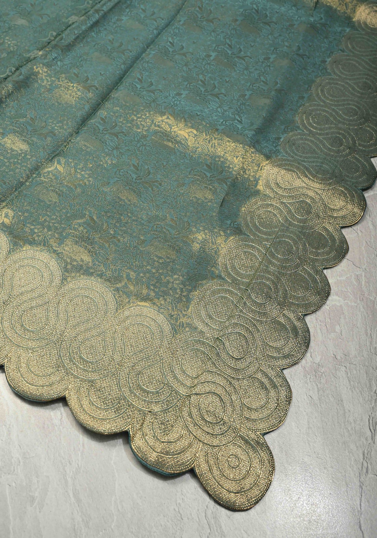 Embrace sustainable elegance with this Turquoise Sea Green Vegan Viscose Silk Saree, adorned with exquisite Vanasingaram brocade inspired by traditional forest motifs. Crafted from eco-conscious vegan viscose silk, the saree offers a soft, fluid drape and effortless comfort. The intricate brocade detailing adds a regal touch, while the finely finished scallop border enhances its graceful silhouette. The refreshing sea green hue lends a serene charm, making this saree perfect for festive celebrations, cultural occasions, and elegant evening wear.