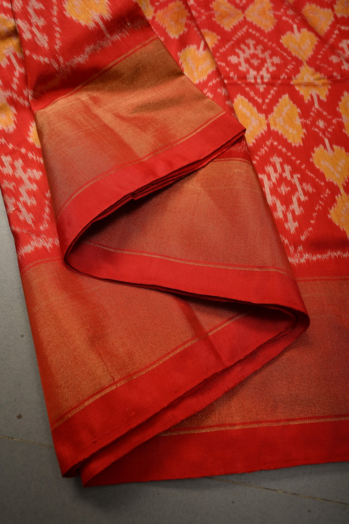 Make a striking statement with this Vermilion Red Pochampally Ikkat Pure Silk Saree, beautifully adorned with intricate geometric brocade patterns that reflect timeless artistry. Handwoven by skilled artisans, the rich pure silk fabric showcases the signature Ikkat weave, blending tradition with contemporary elegance. The tissue zari border adds a radiant shimmer, enhancing the saree’s regal appeal. Perfect for weddings, festive celebrations, and special occasions, this exquisite drape embodies heritage craftsmanship and sophisticated charm