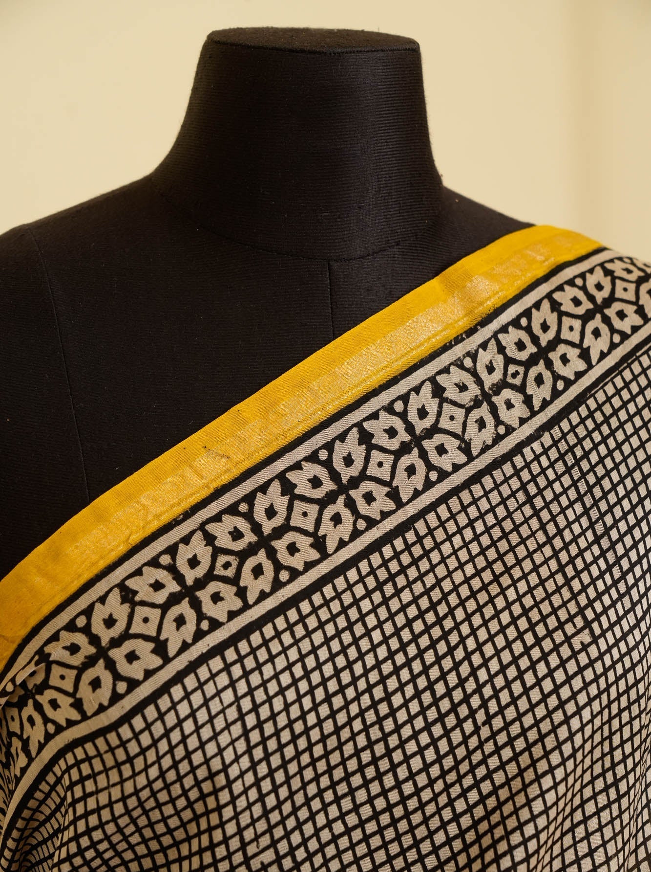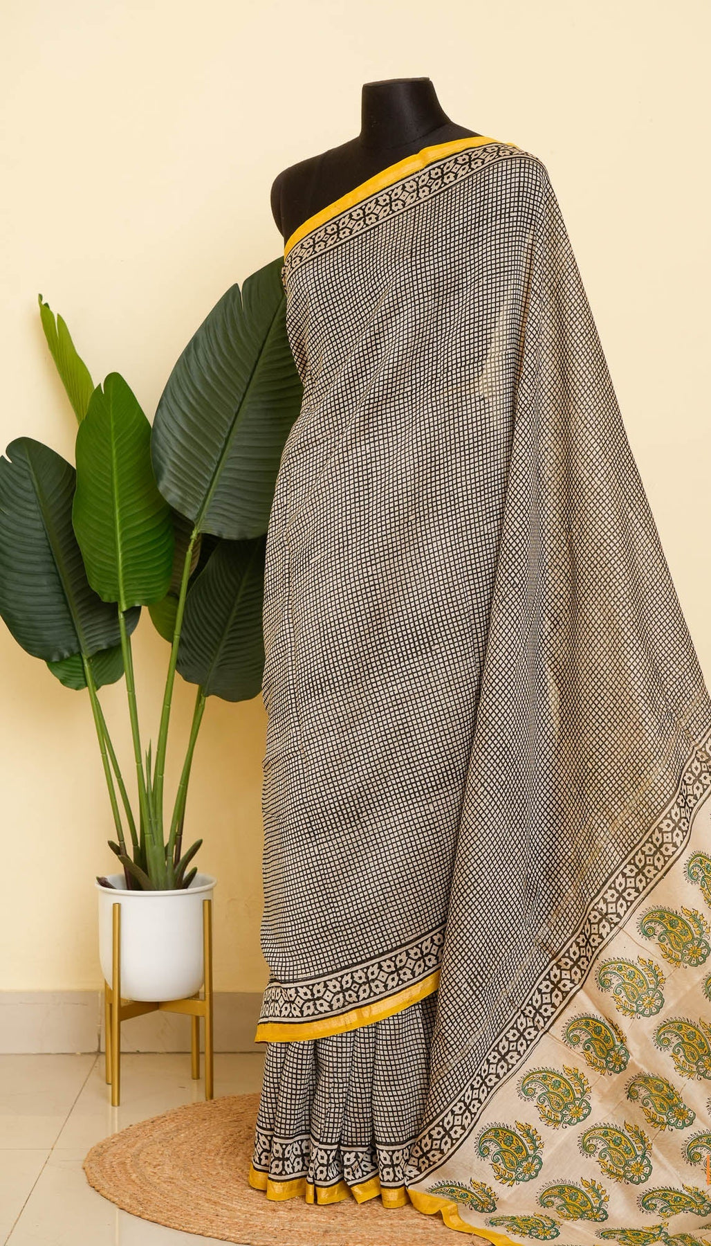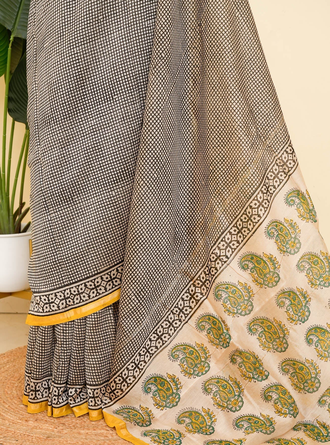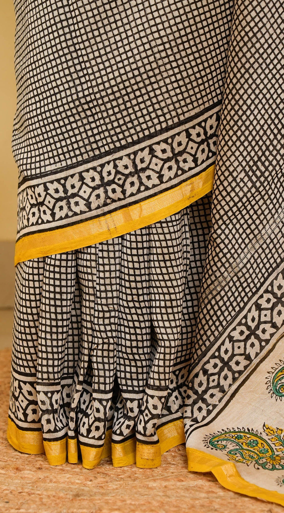 Set on a classic black and white micro-check base, this Bagru handblock printed saree is clean, smart, and endlessly wearable. The tiny grid pattern brings in that tailored, almost formal feel, while the sunny yellow border adds just the right wink of warmth.