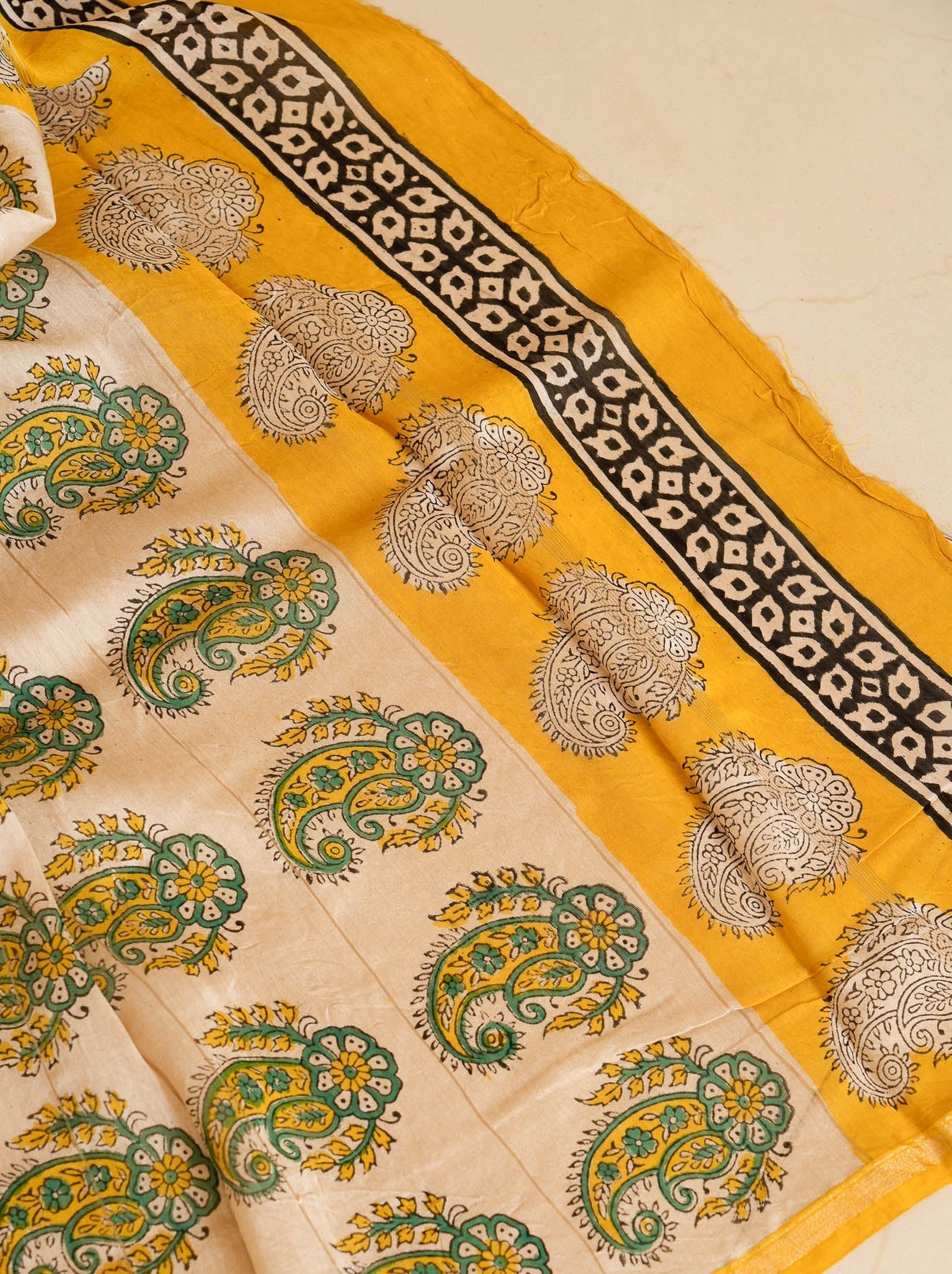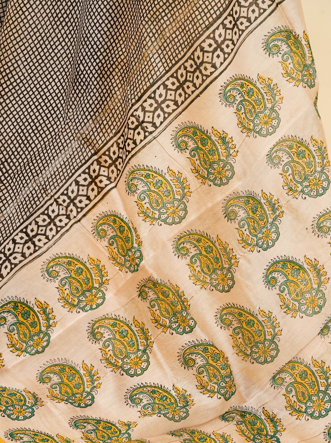 The pallu is where the story blooms. Printed with delicate paisley motifs in natural dyes, it softens the geometry with gentle curves and earthy colours, all hand stamped by artisans in Bagru, Rajasthan using traditional wooden blocks. Every motif carries those beautiful, handmade variations that make each saree quietly one of a kind.