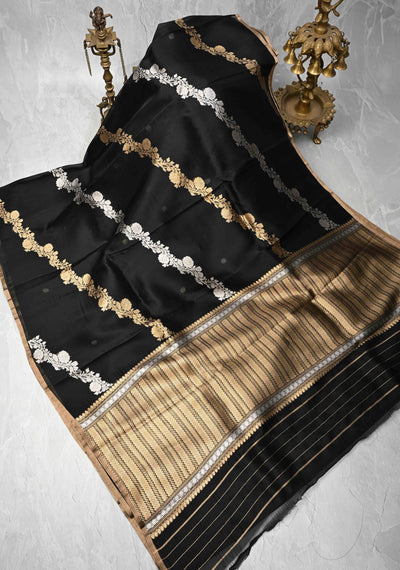 Black Pure Banarasi Kora Silk Saree with Zari Buttas and Contrast Zari Border | SILK MARK CERTIFIED