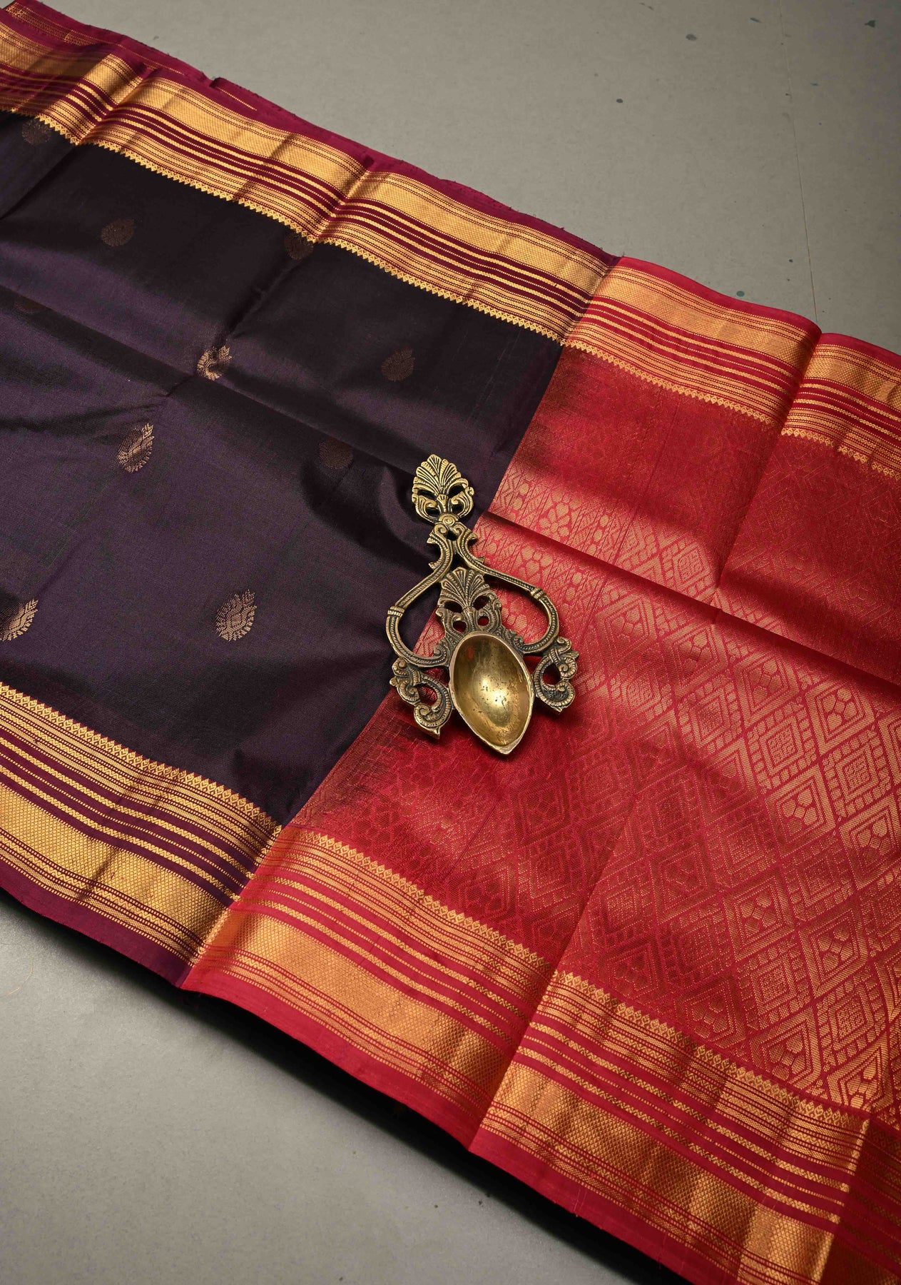 The Deep Aubergine Pure Kanjivaram Soft Silk Saree is a captivating piece that effortlessly blends tradition with sophistication. The aubergine color adds richness and depth, while the luxurious Kanjivaram soft silk fabric drapes beautifully, offering a subtle shine that enhances its elegance. Adorned with intricate zari buttas, the saree reflects a delicate shimmer that adds to its timeless charm. The contrast zari border elevates the design with a regal touch, framing the saree with intricate craftsmanship. Perfect for weddings, festivals, or any grand occasion, this saree is a stunning choice for those who appreciate luxury and tradition.