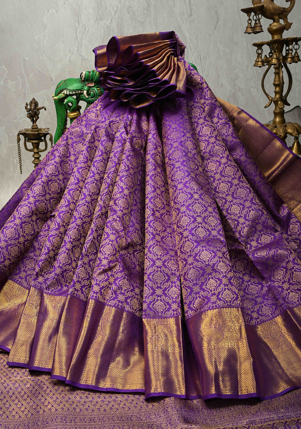 The purple body is beautifully enhanced with intricate floral brocade, showcasing fine craftsmanship and adding depth and sophistication to the design. Completing its majestic appeal is a wide zari border, lending opulence and highlighting the saree’s authentic Kanchipuram heritage. A perfect heirloom saree for lovers of royal hues and elegant detailing.
