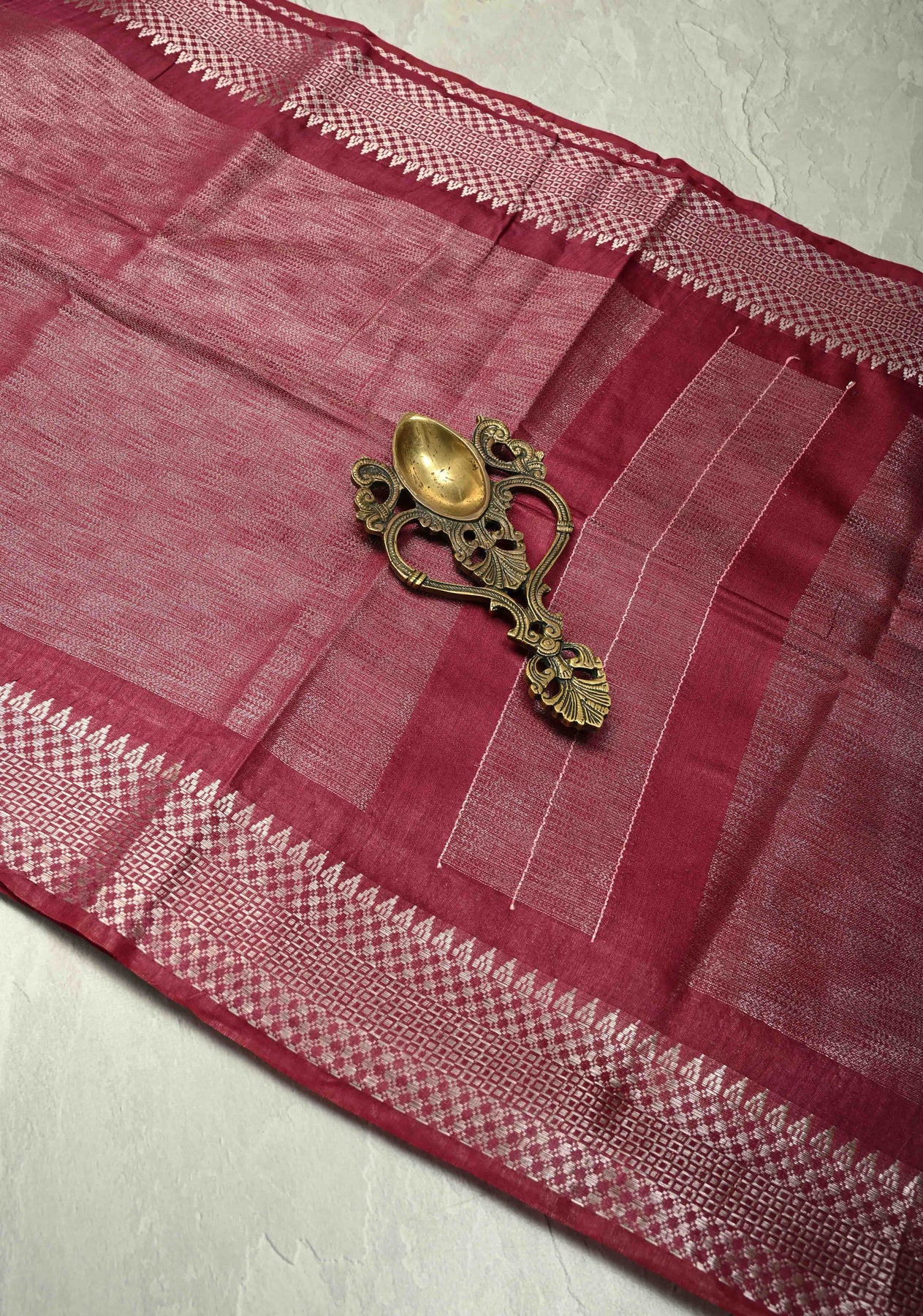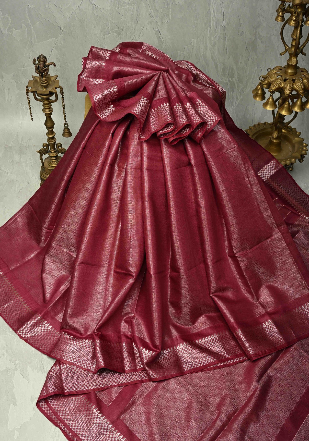 Exude regal elegance with this Eggplant Purple Semi Tussar Saree, crafted from soft, lightweight fabric that drapes beautifully. The eggplant purple body is complemented by a finely woven silver temple zari border, adding a touch of traditional charm and refined sophistication. Perfect for weddings, festive celebrations, and cultural occasions, this saree blends classic heritage with contemporary style, making it a timeless addition to your wardrobe.