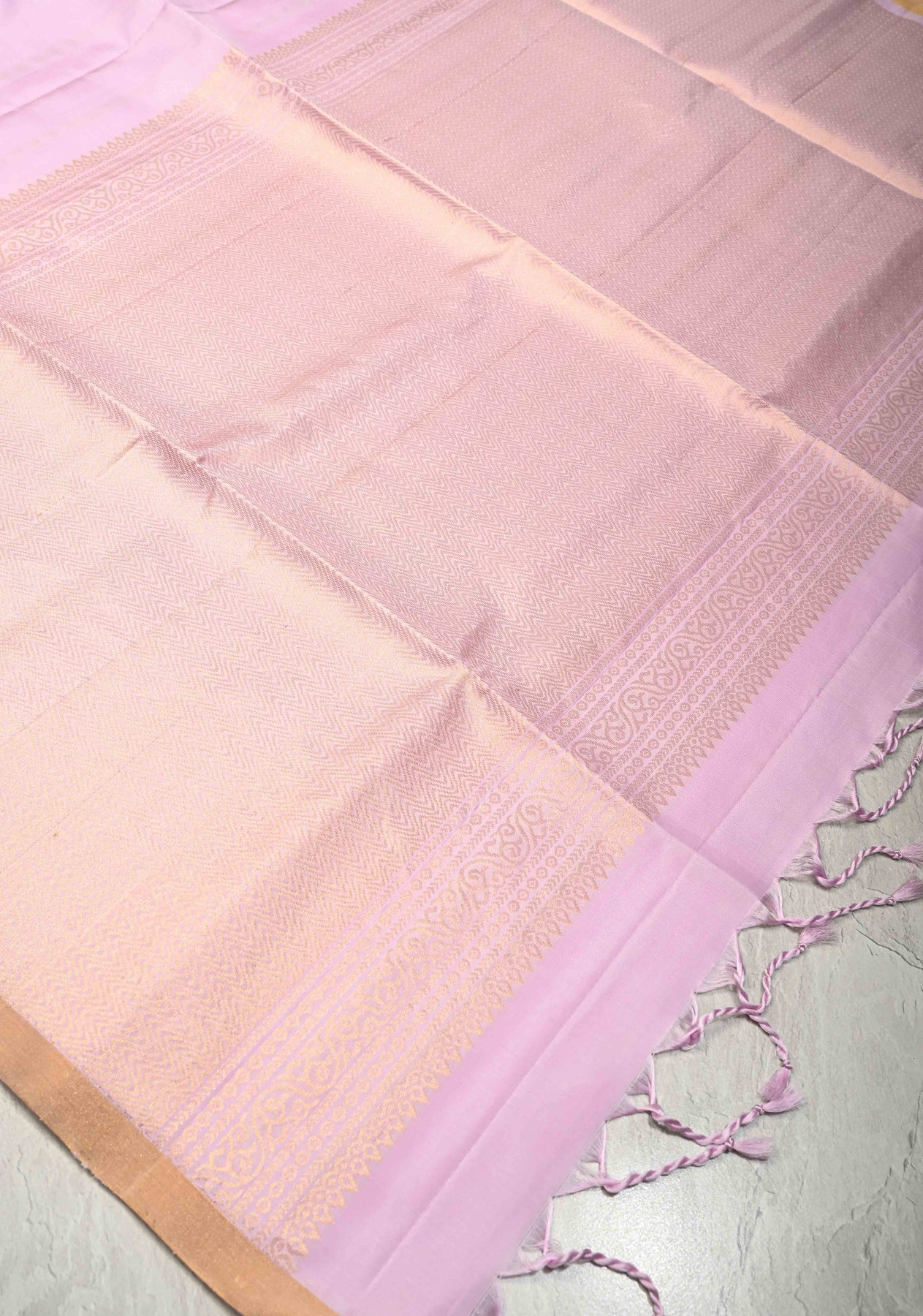 The gentle lilac-pink body exudes understated grace, while the minimal tissue zari border adds a refined shimmer without overpowering the design. A versatile saree that blends traditional weaving artistry with modern minimalism, ideal for creating a soft, elegant ethnic look.