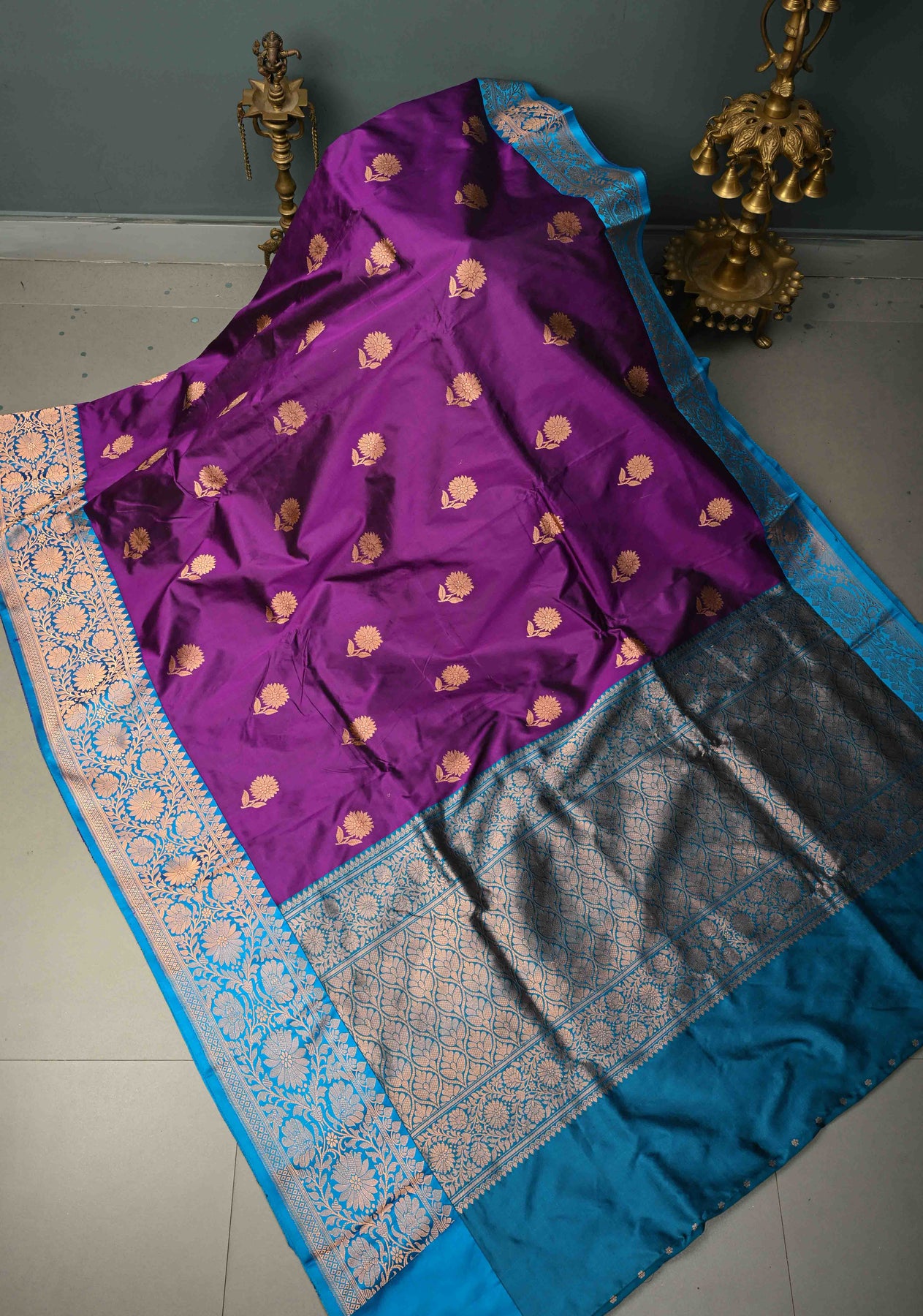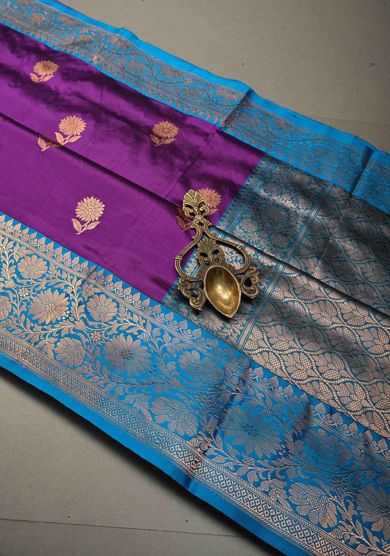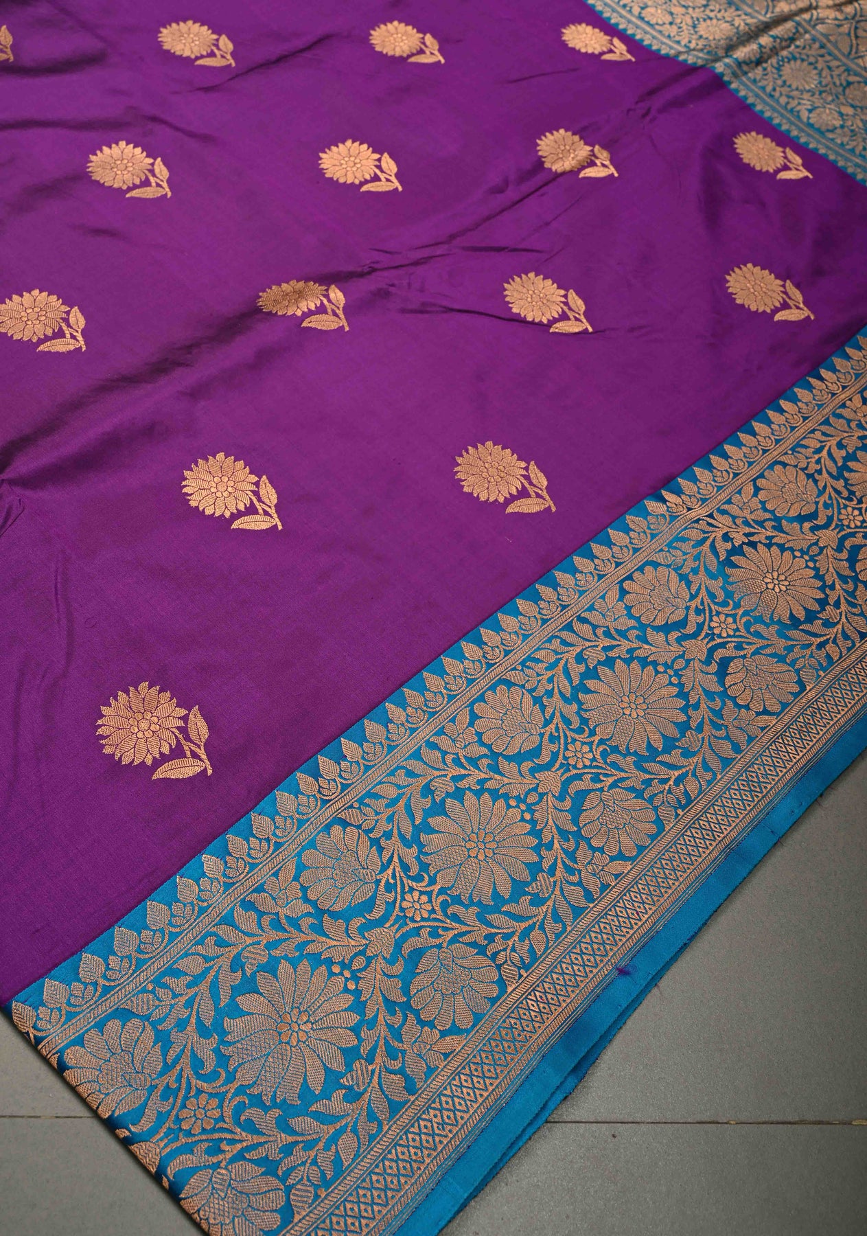 The Magenta Purple base is adorned with delicately woven floral zari buttas scattered across the body, adding subtle shimmer and intricate detail. A contrast zari border frames the saree beautifully, enhancing the overall look with a touch of sophistication and regal charm.