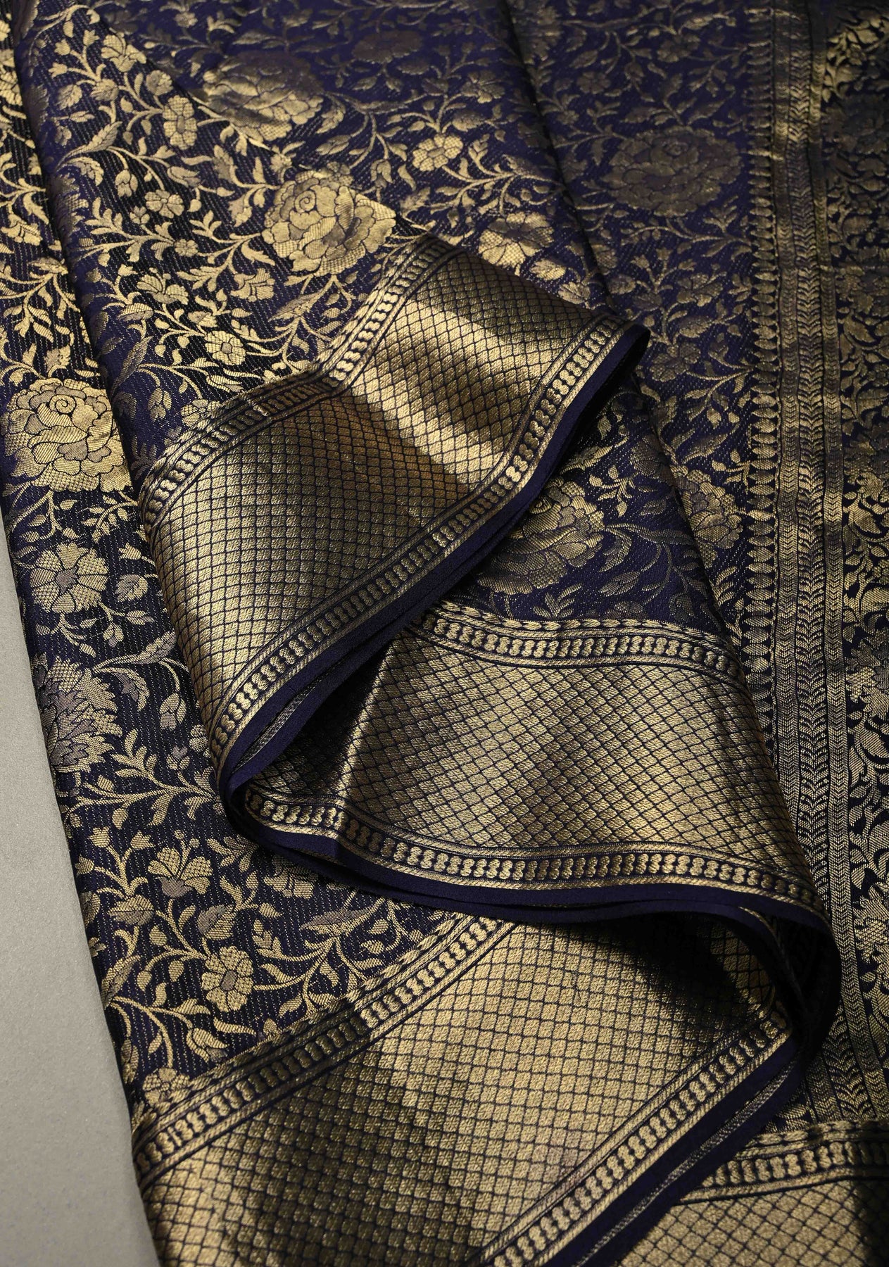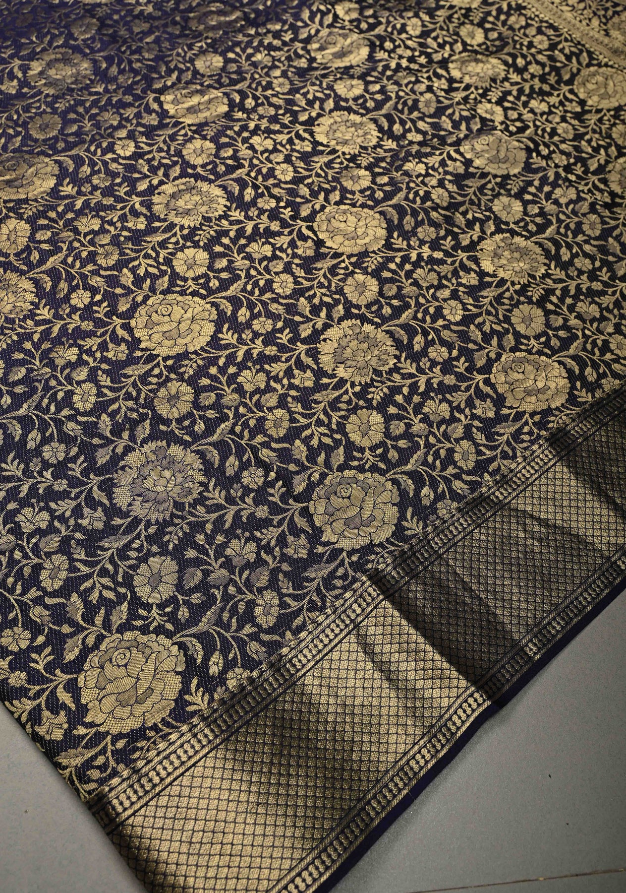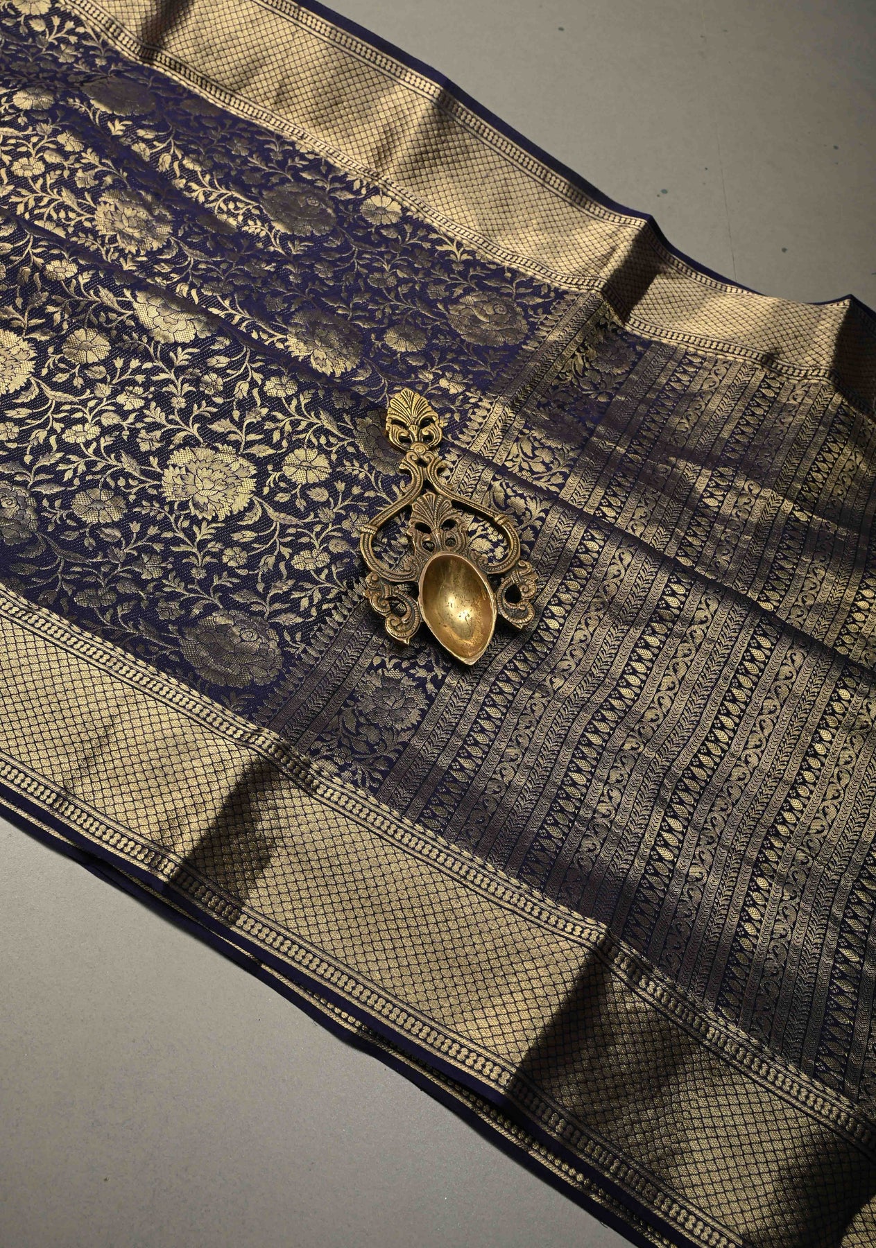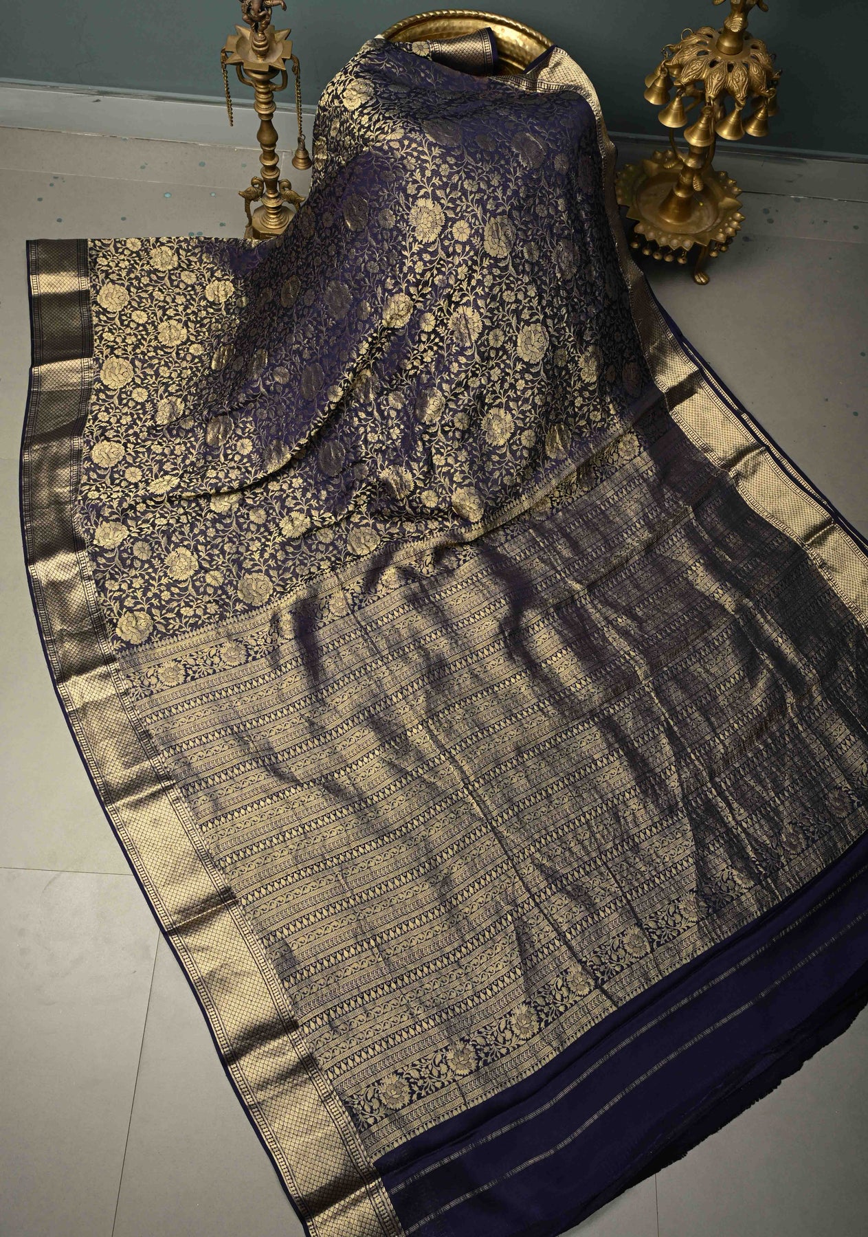 The Ink Purple Mysore Silk Saree is a timeless piece of elegance and sophistication. Crafted from Mysore silk, it features a deep ink Purple shade that exudes richness and grace. The body is adorned with an intricate floral brocade jaal, adding delicate artistry and a subtle shimmer to the fabric. Complemented by a traditional zari border, the saree achieves a perfect balance of classic opulence and contemporary charm. Lightweight, smooth, and gracefully draping, this saree is ideal for weddings, festive occasions, and special celebrations, making it a standout addition to any wardrobe.