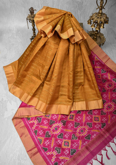 Mustard Horizontal Zari Stripes on Pure Raw Silk Saree with Tissue Zari Border and Ikkat Pallu | SILK MARK CERTIFIED