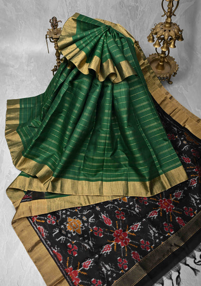 Green Horizontal Zari Stripes on Pure Raw Silk Saree with Tissue Zari Border and Ikkat Pallu | SILK MARK CERTIFIED