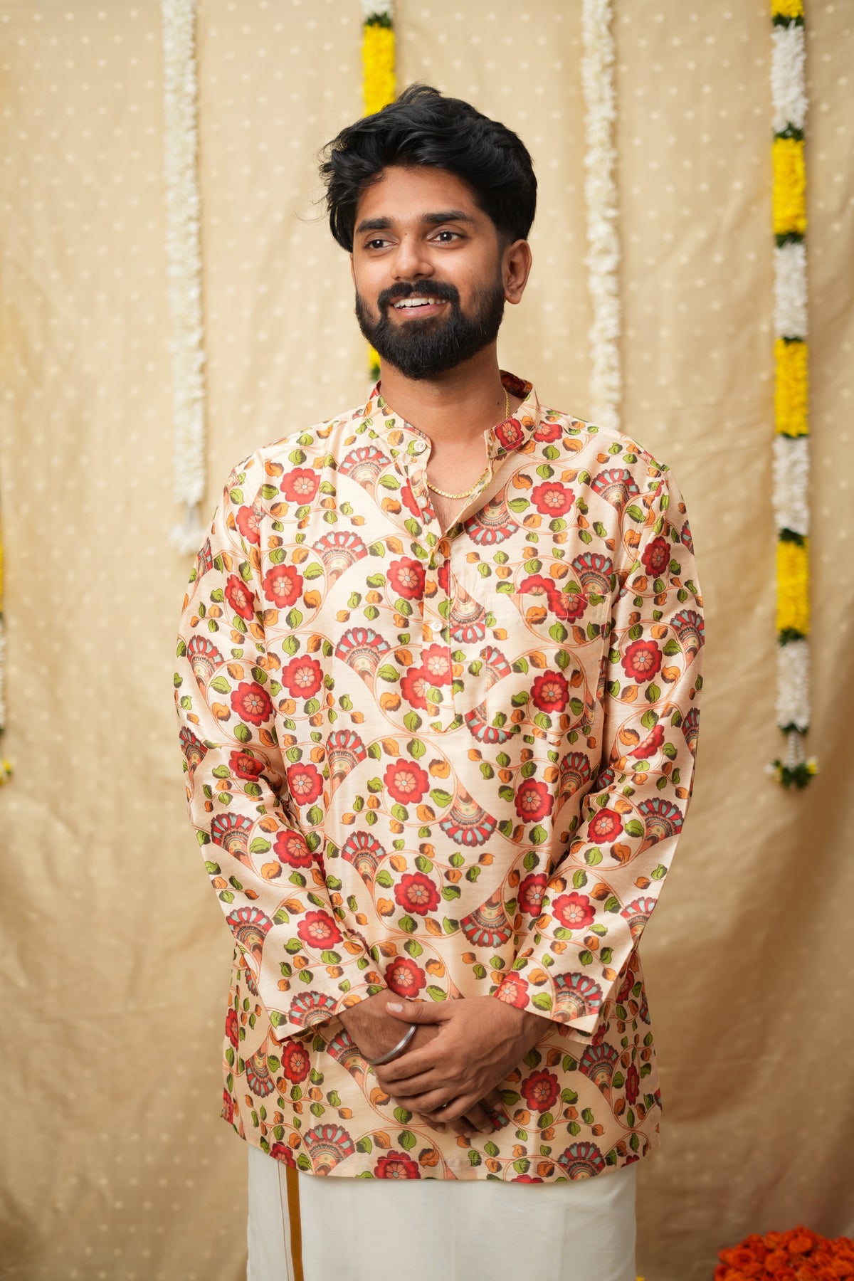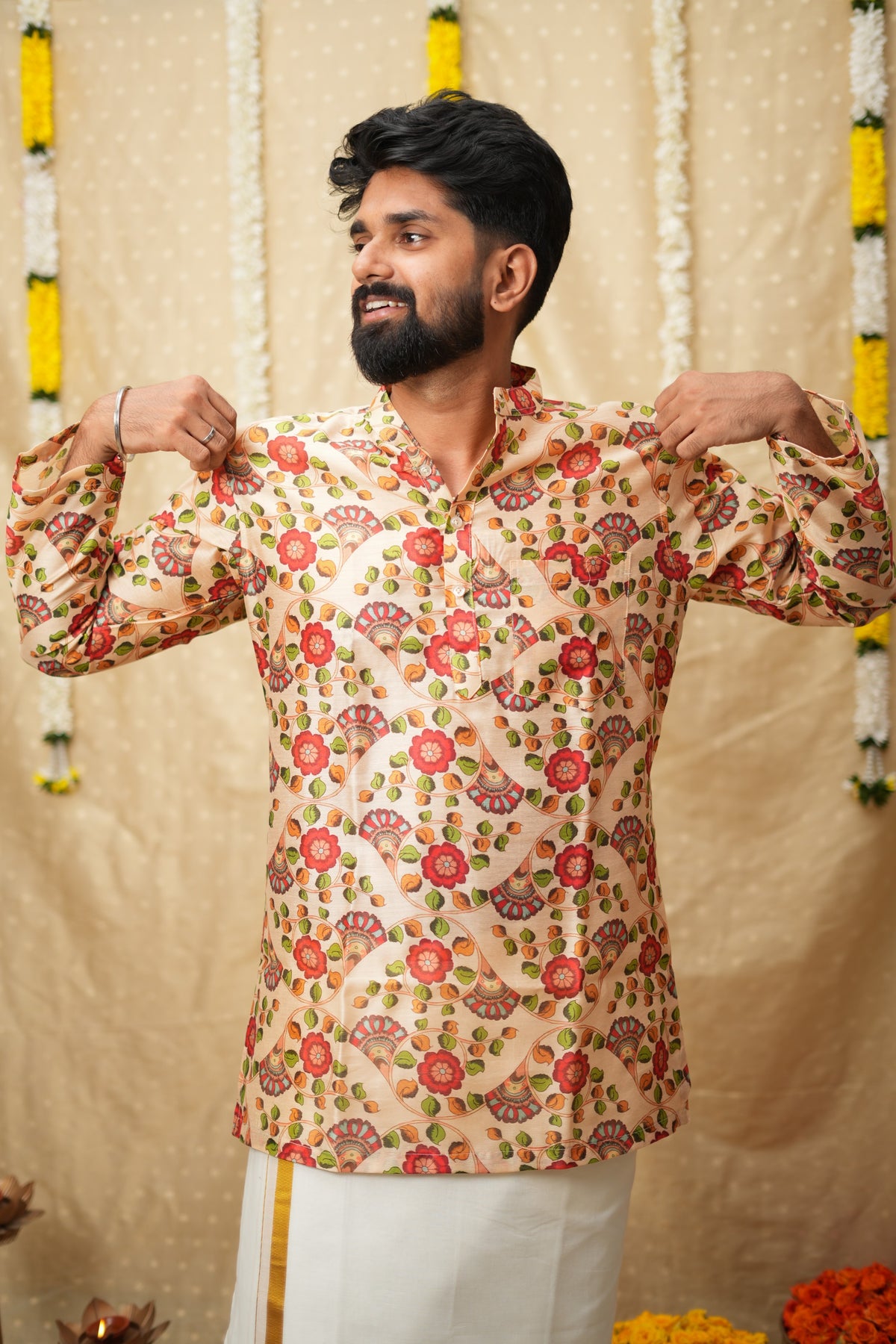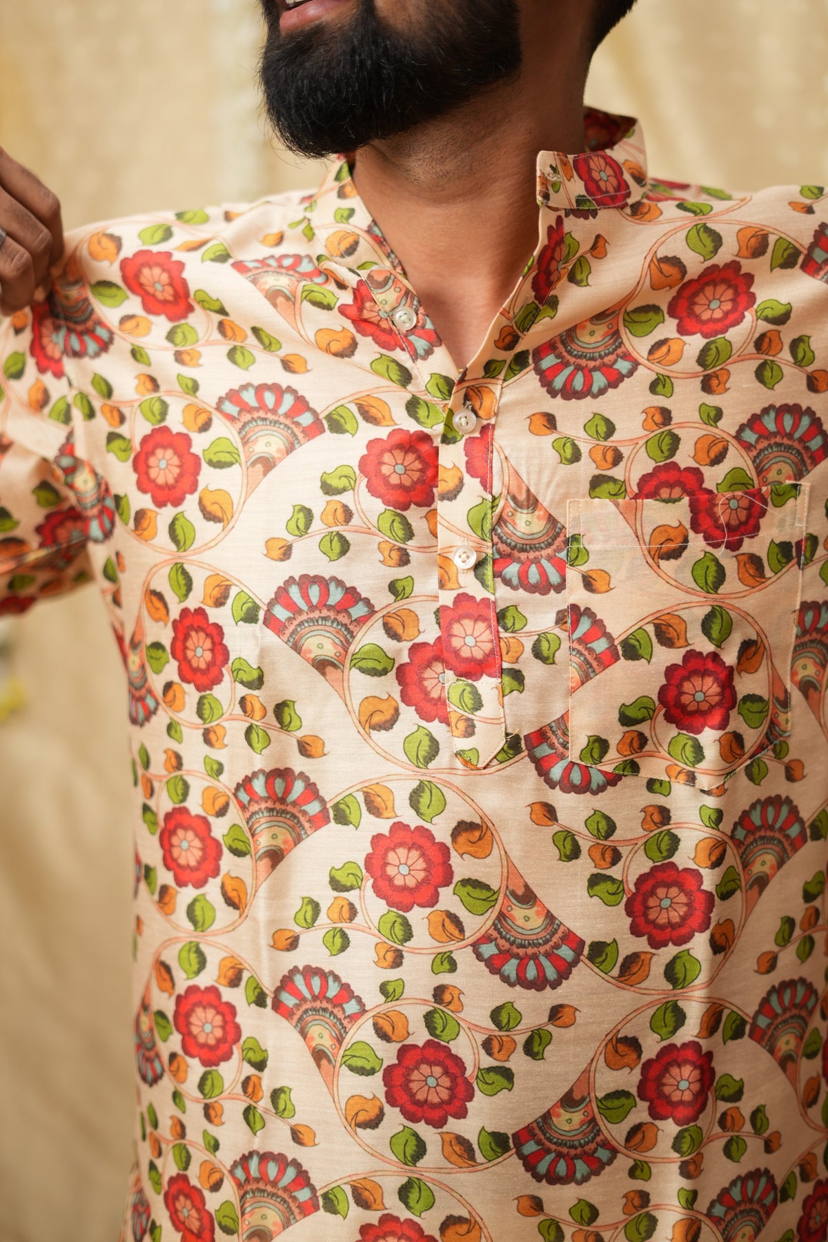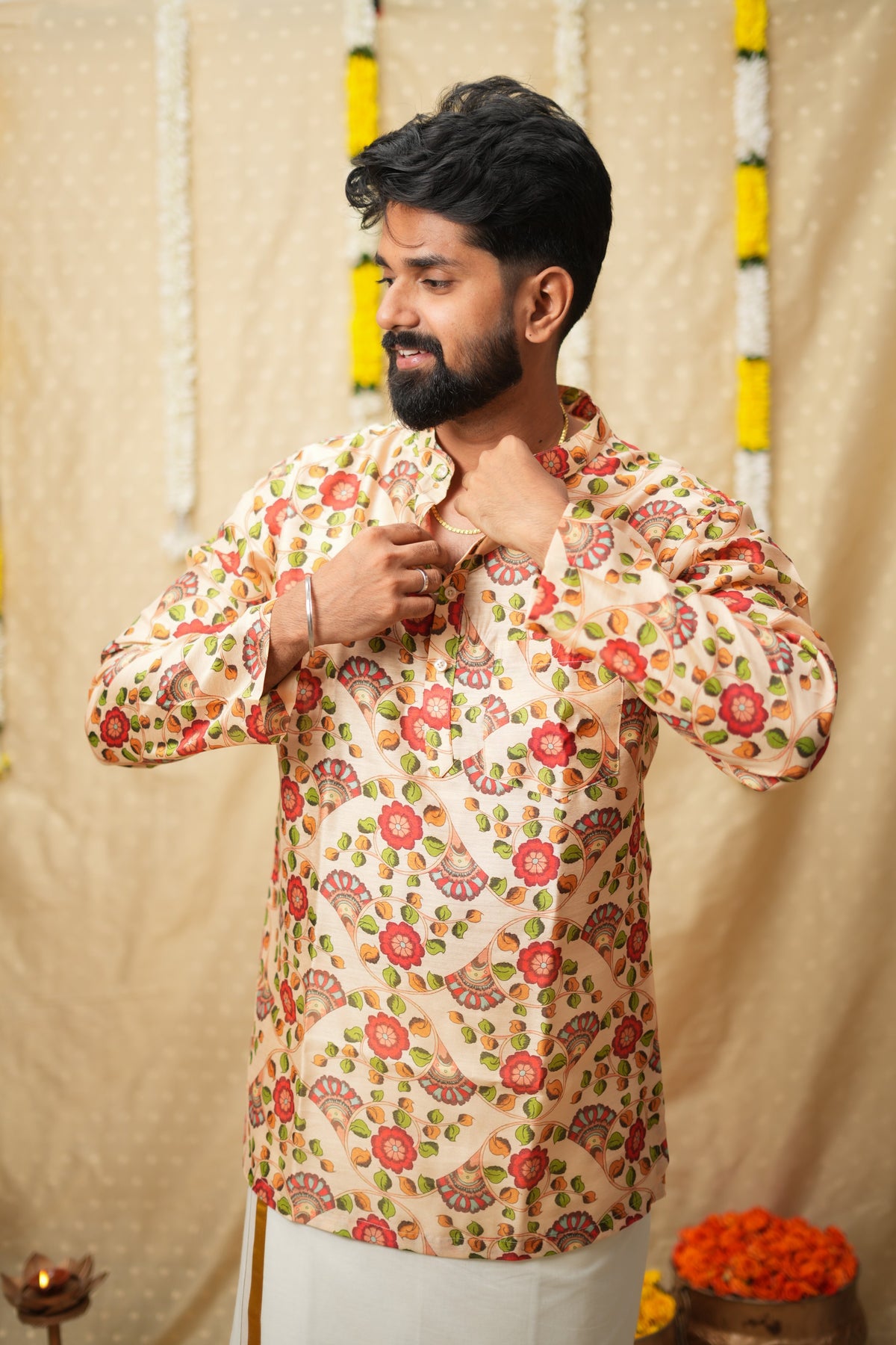 This Beige Kurta Shirt is crafted from premium silken Chanderi with timeless Kalamkari-inspired prints. Featuring a mandarin collar with a button placket and full sleeves, it blends festive elegance with everyday cultural charm. Perfect for weddings, temple visits, or festive gatherings, this shirt adds a touch of heritage sophistication to modern men’s ethnic wear."