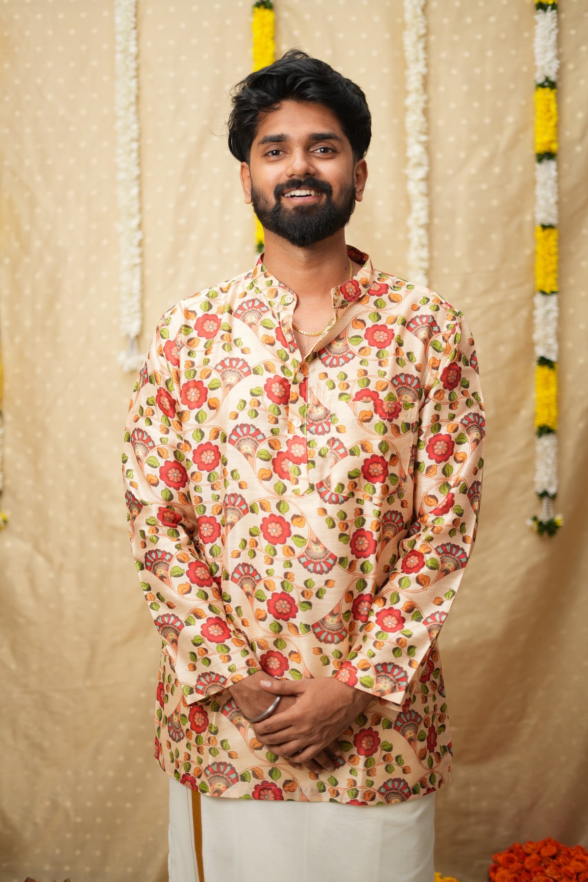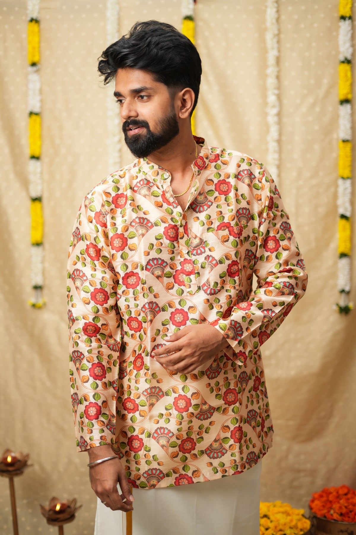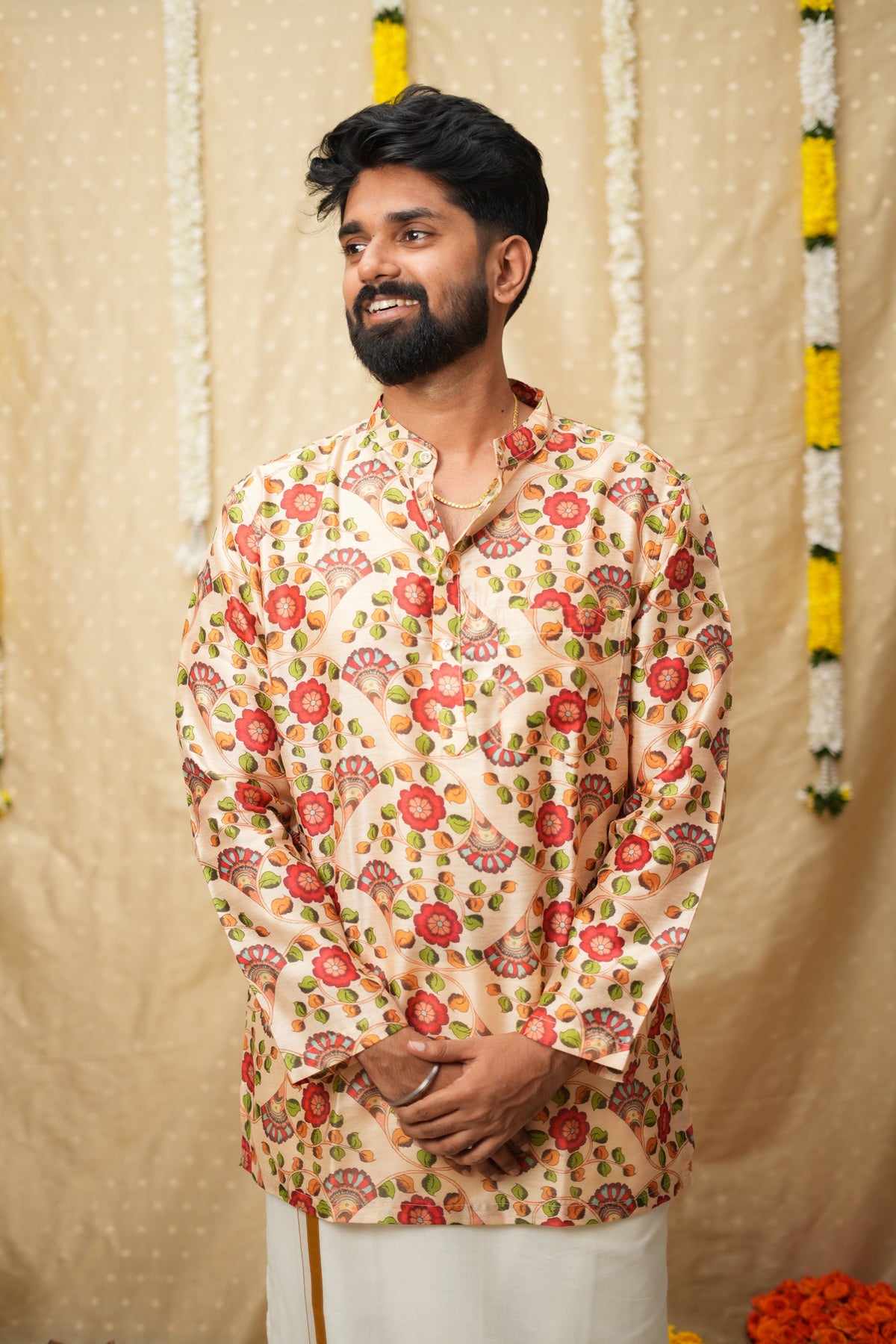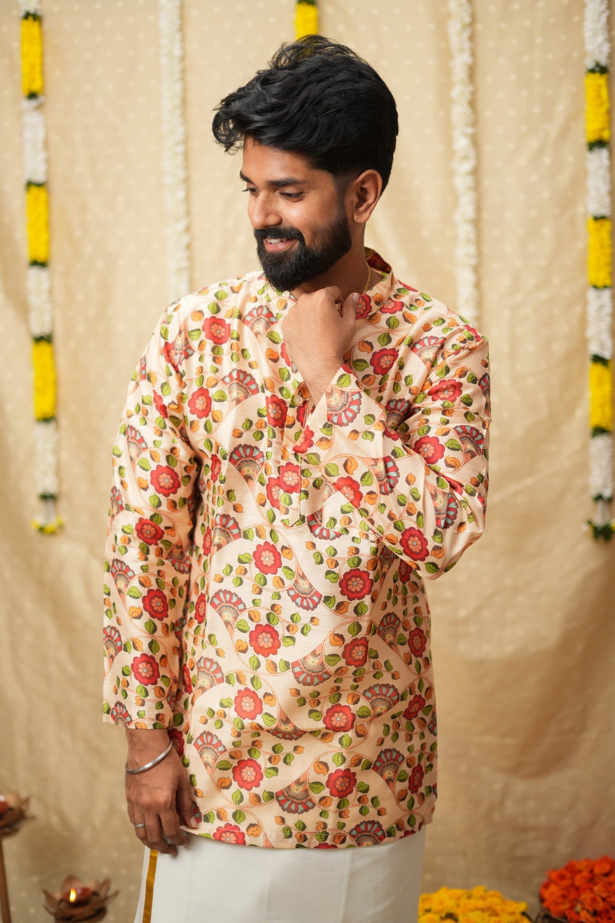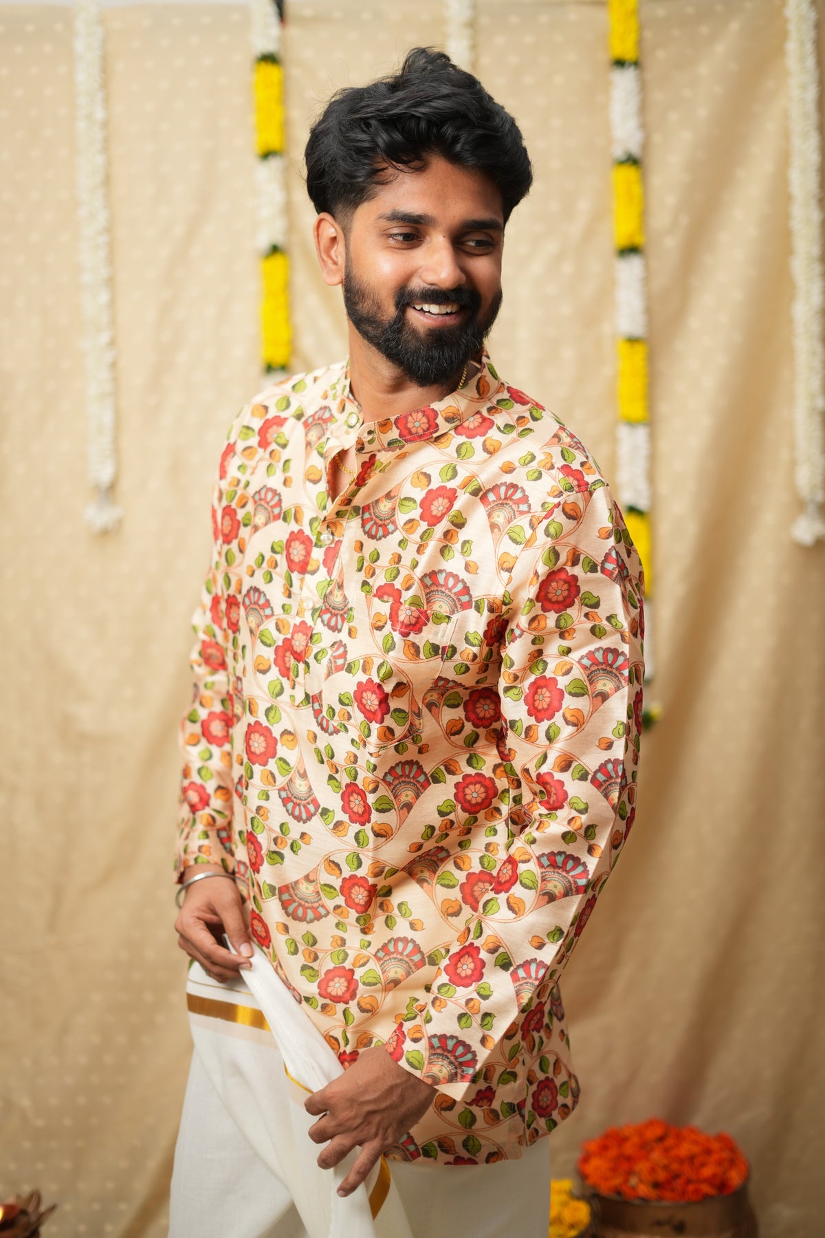 This Beige Kurta Shirt is crafted from premium silken Chanderi with timeless Kalamkari-inspired prints. Featuring a mandarin collar with a button placket and full sleeves, it blends festive elegance with everyday cultural charm. Perfect for weddings, temple visits, or festive gatherings, this shirt adds a touch of heritage sophistication to modern men’s ethnic wear."