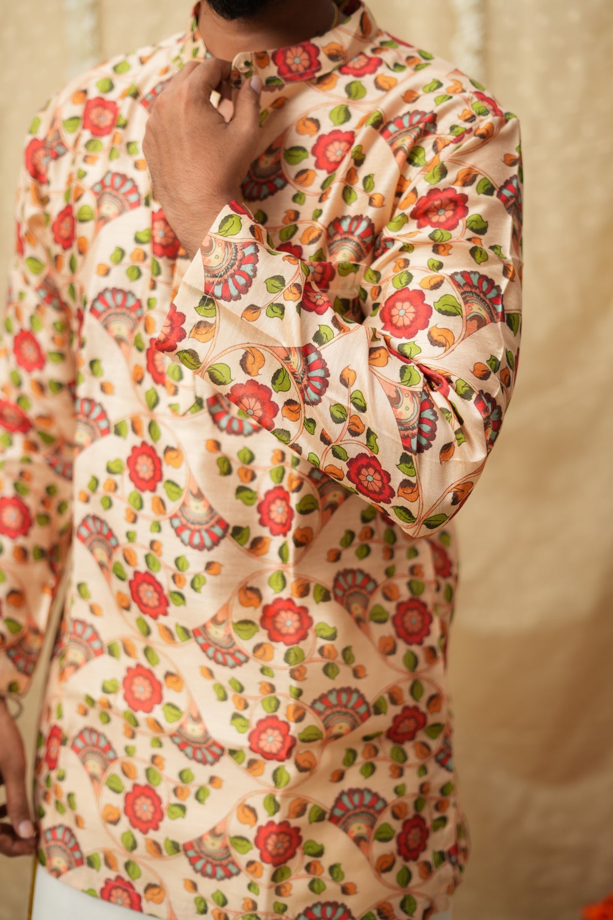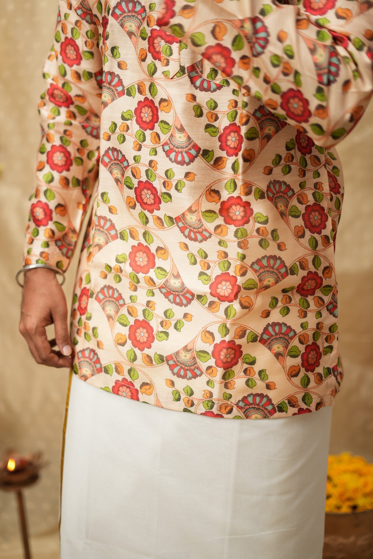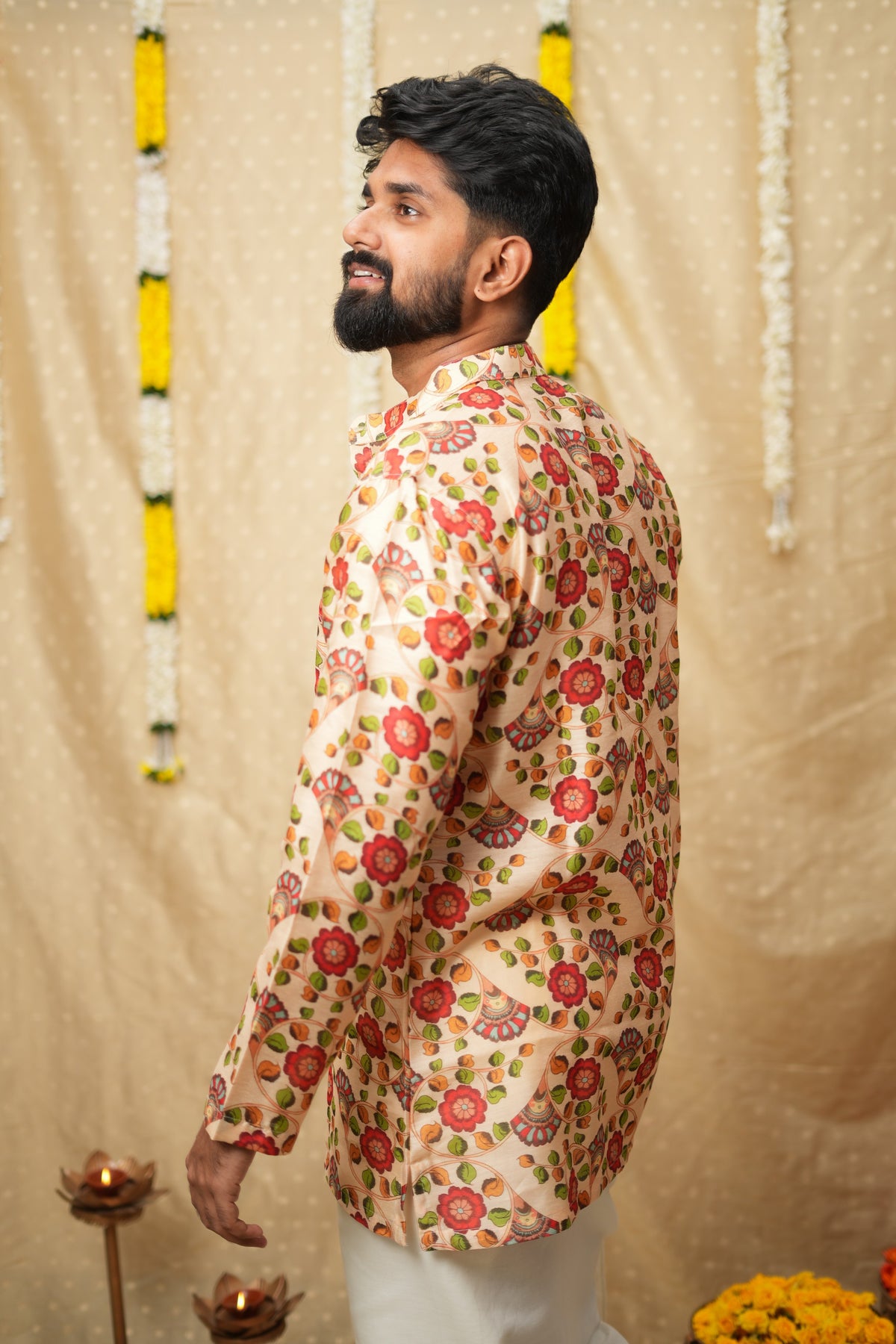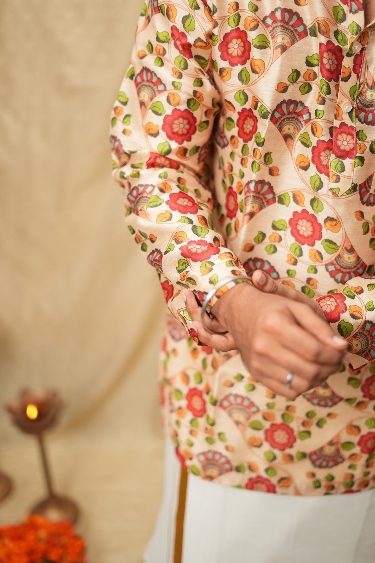 This Beige Kurta Shirt is crafted from premium silken Chanderi with timeless Kalamkari-inspired prints. Featuring a mandarin collar with a button placket and full sleeves, it blends festive elegance with everyday cultural charm. Perfect for weddings, temple visits, or festive gatherings, this shirt adds a touch of heritage sophistication to modern men’s ethnic wear."