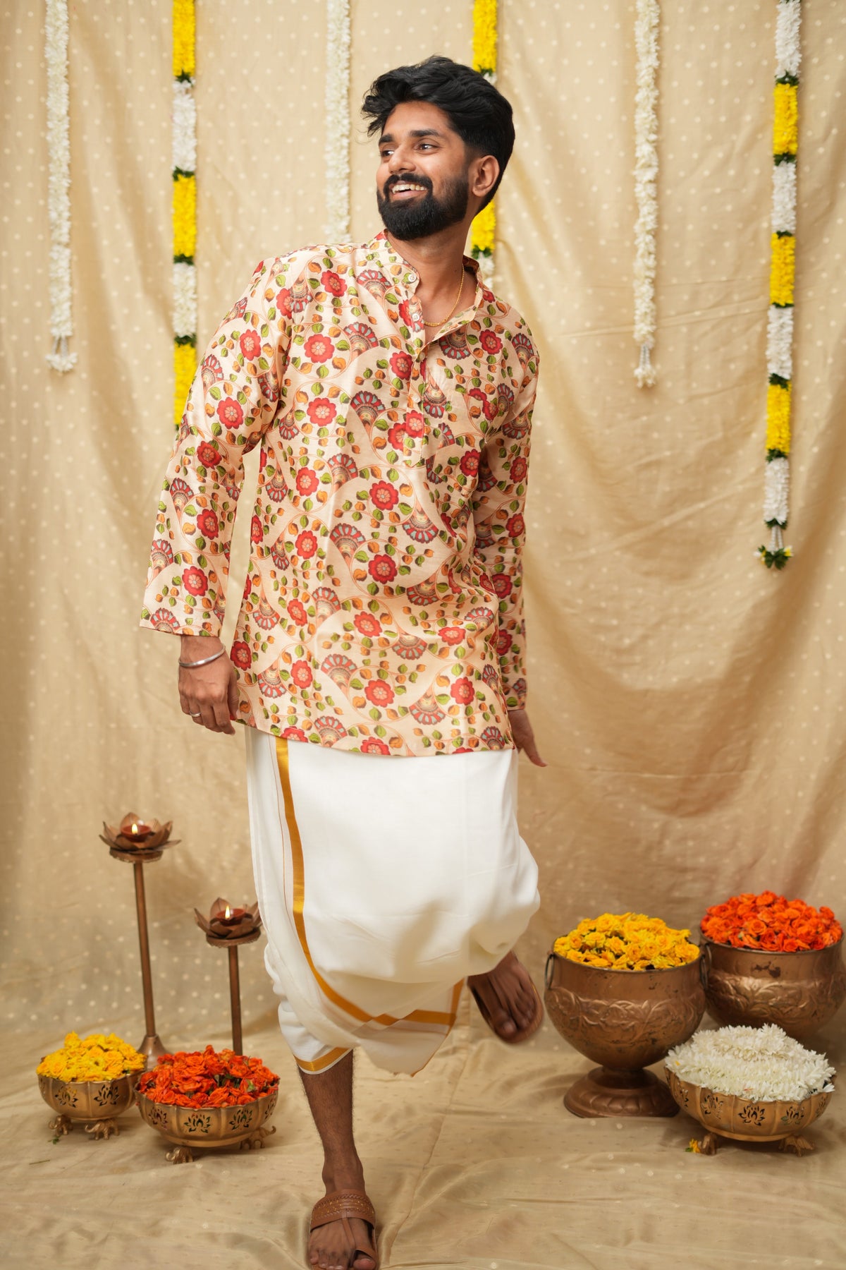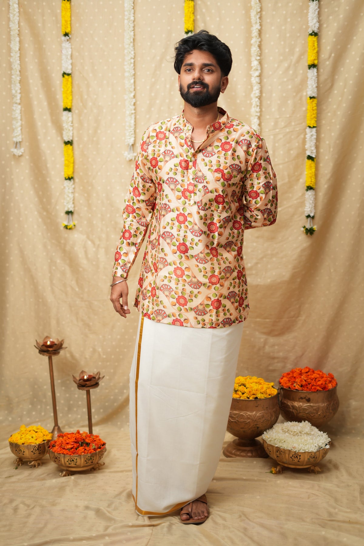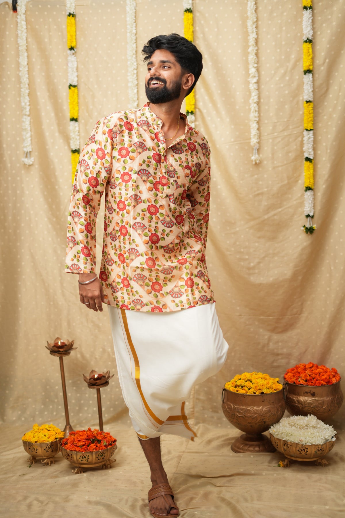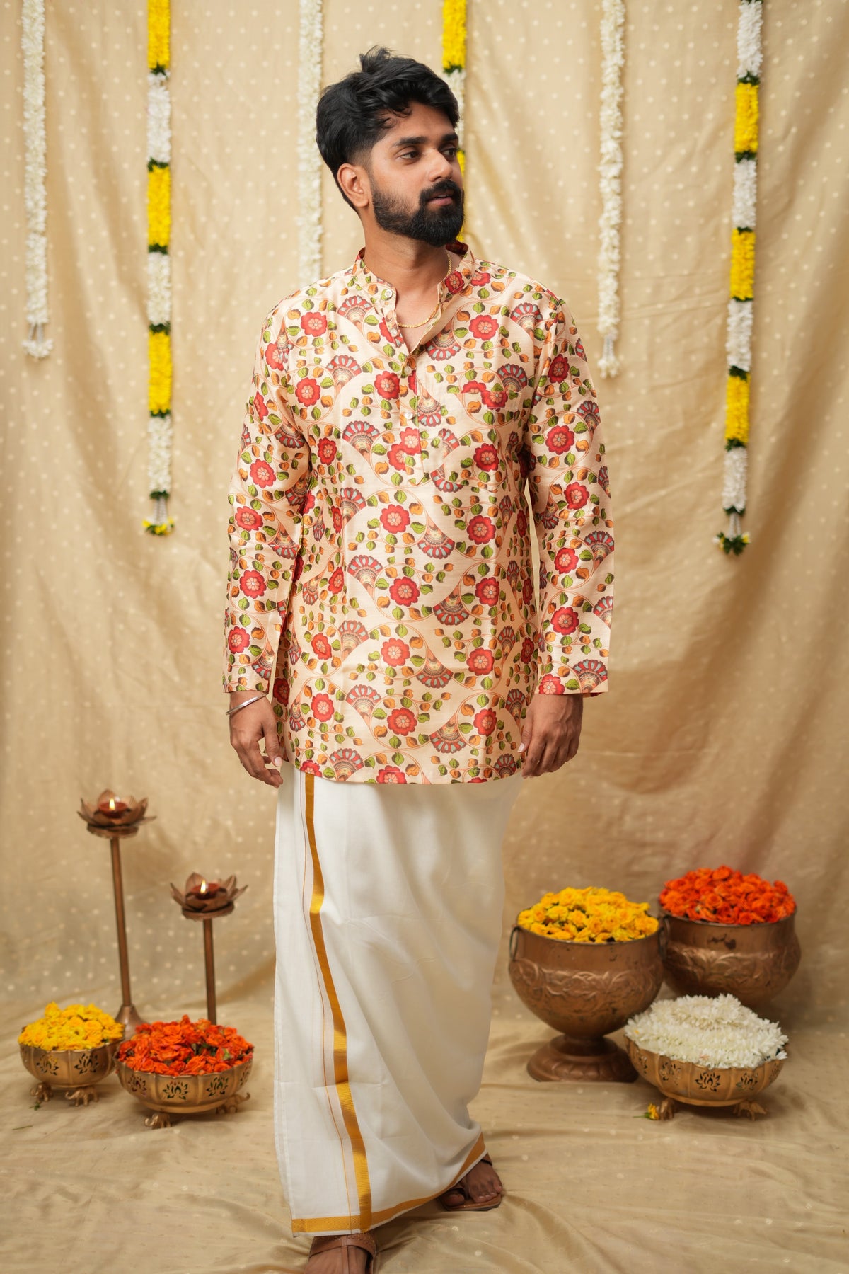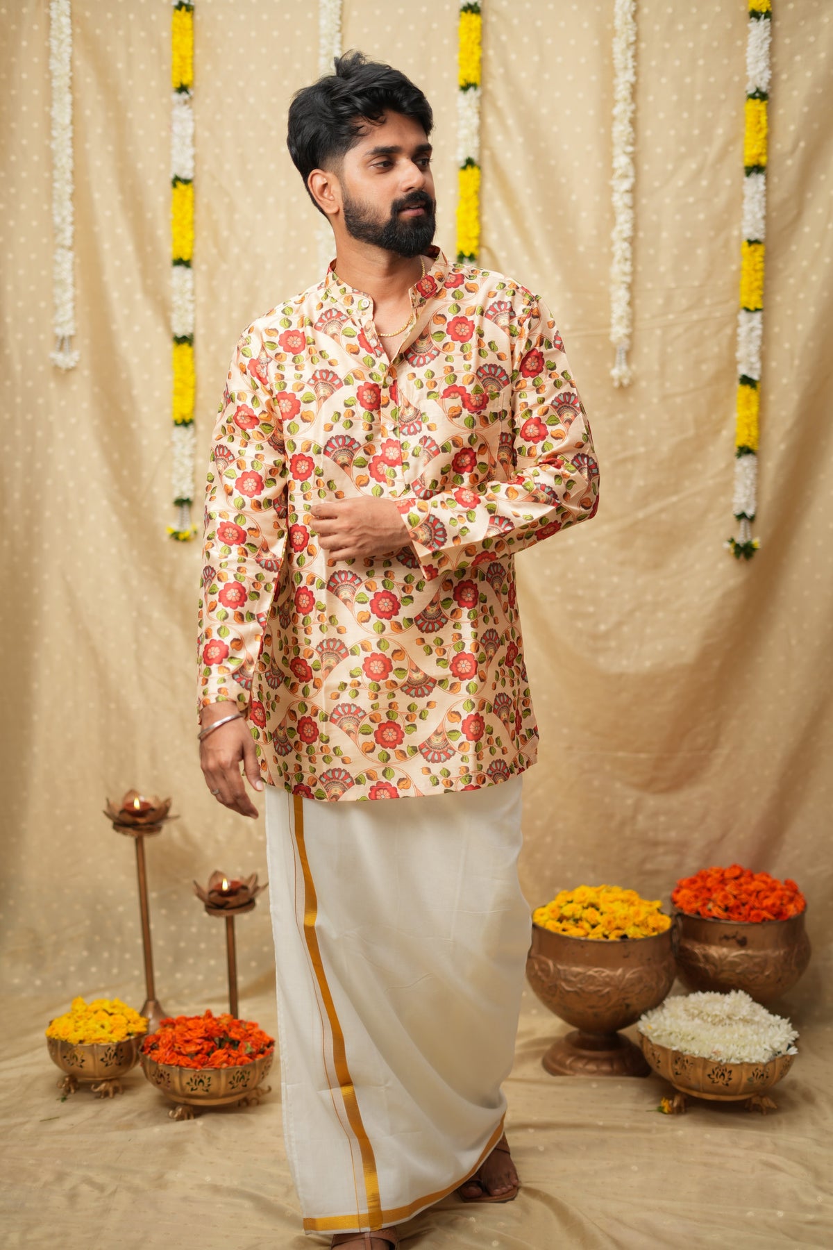 This Beige Kurta Shirt is crafted from premium silken Chanderi with timeless Kalamkari-inspired prints. Featuring a mandarin collar with a button placket and full sleeves, it blends festive elegance with everyday cultural charm. Perfect for weddings, temple visits, or festive gatherings, this shirt adds a touch of heritage sophistication to modern men’s ethnic wear."