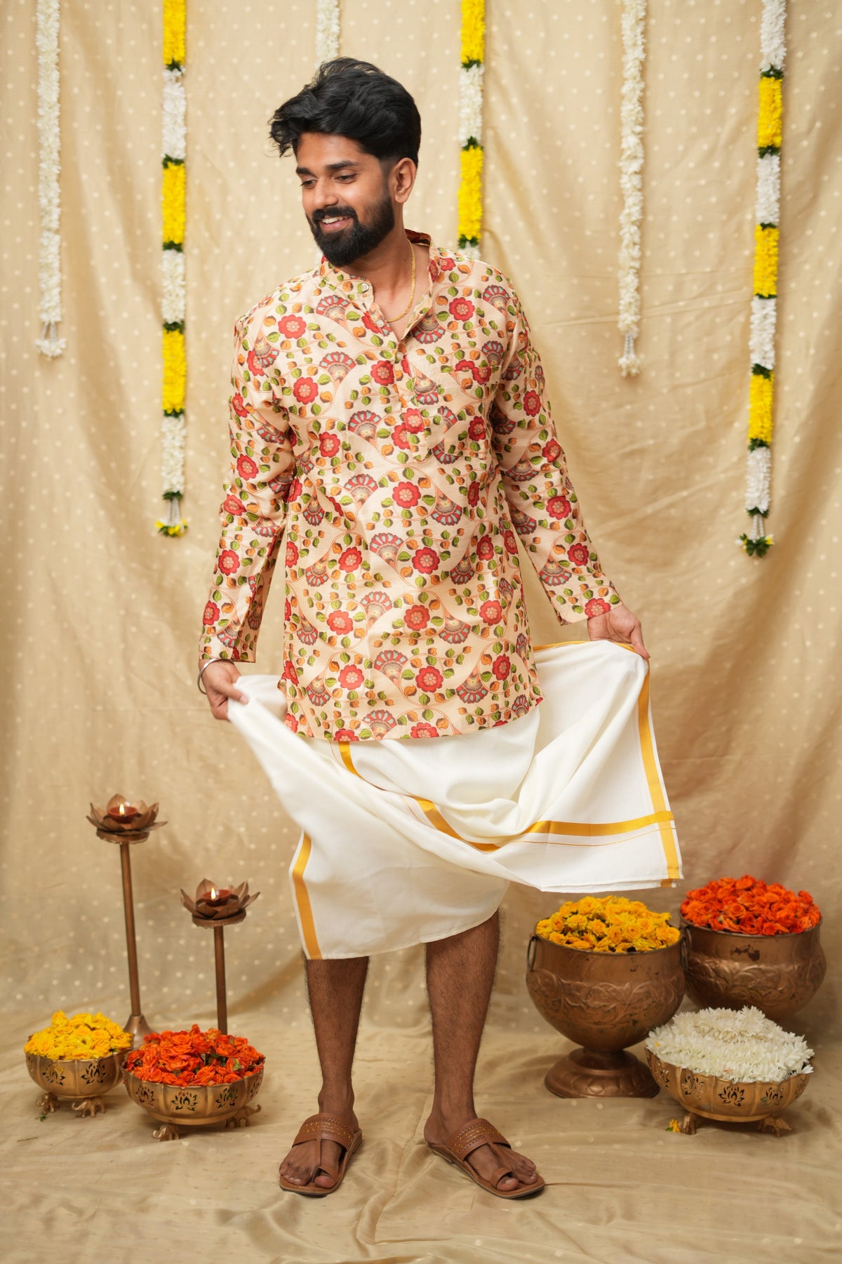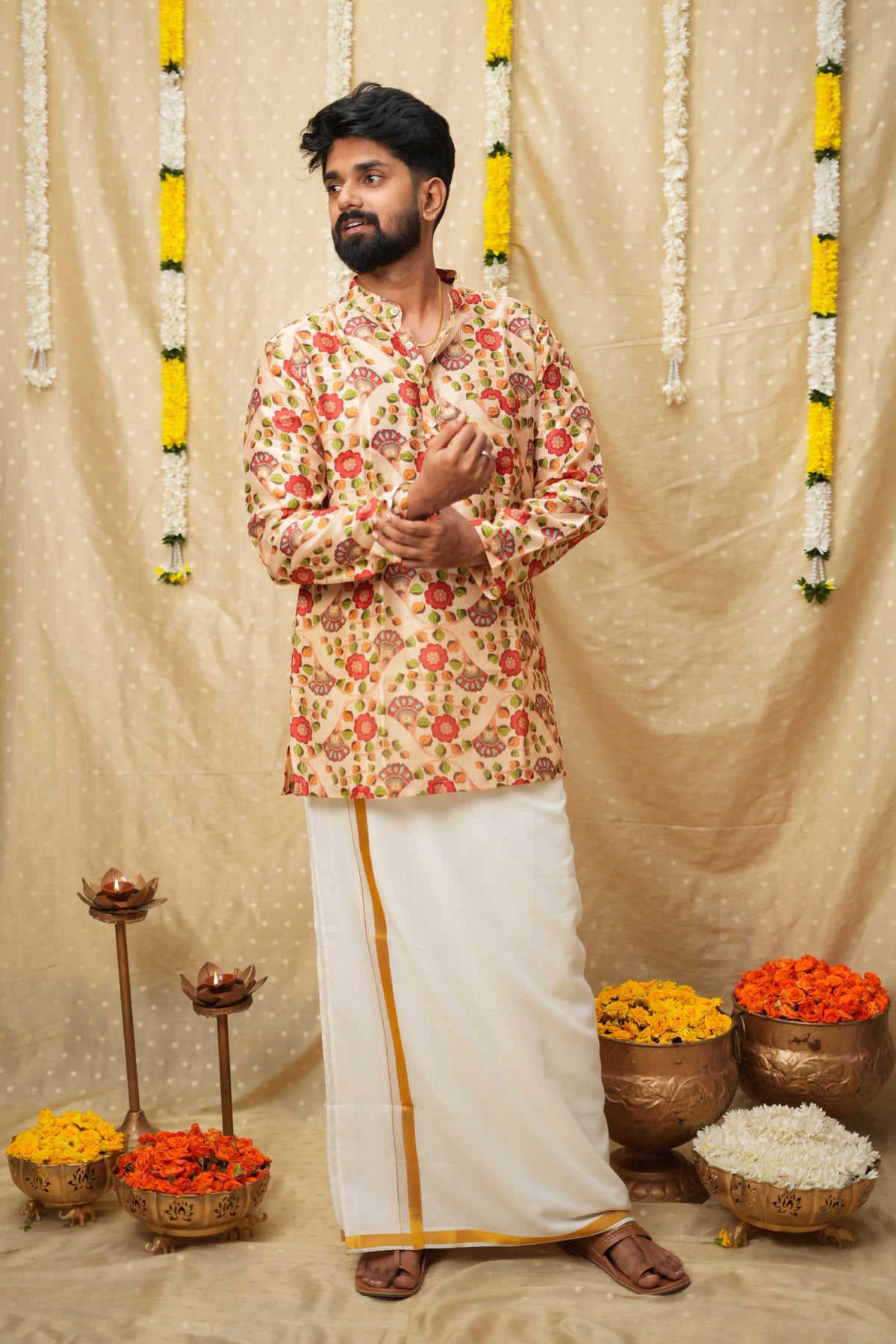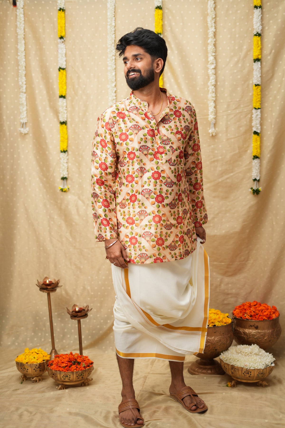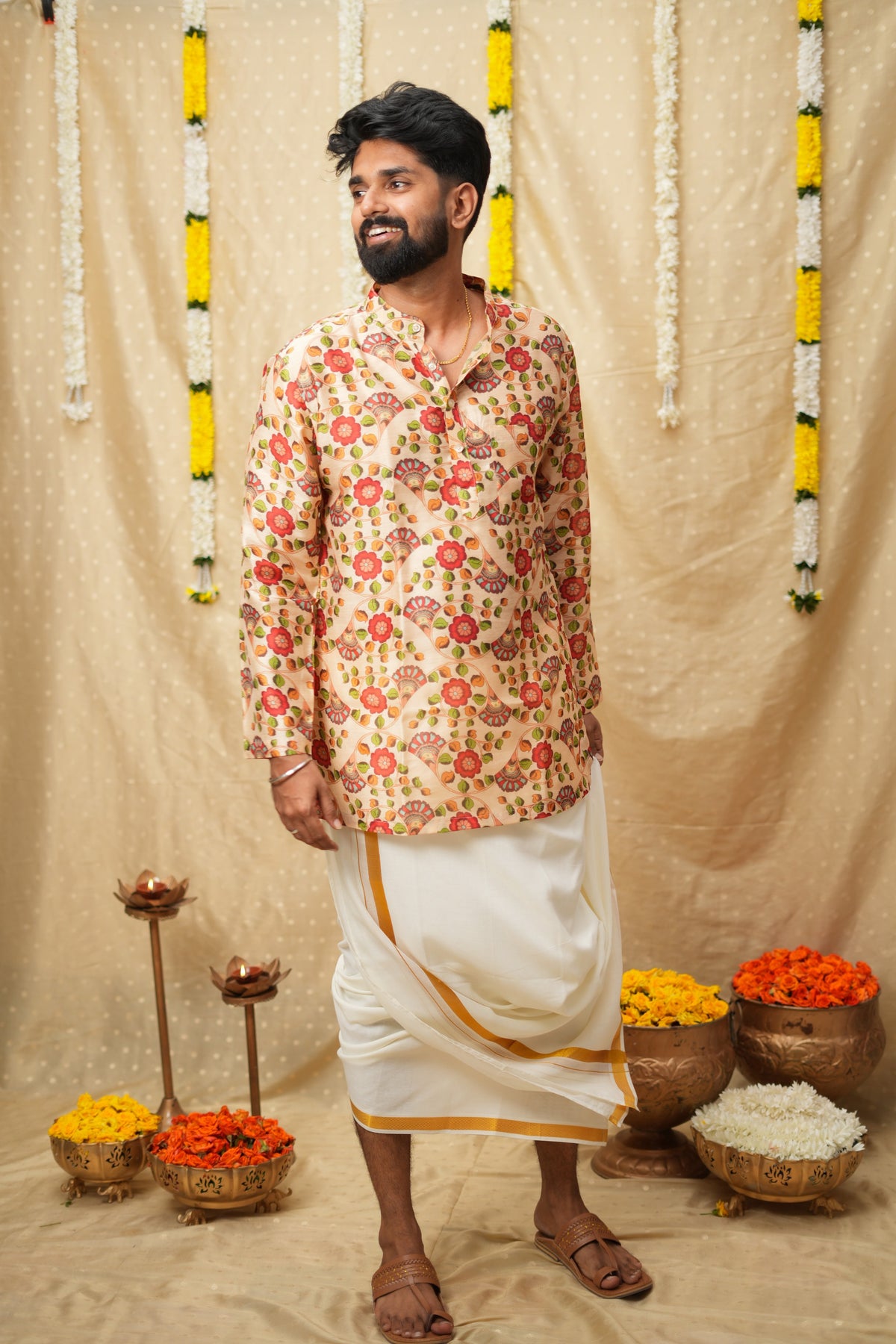 This Beige Kurta Shirt is crafted from premium silken Chanderi with timeless Kalamkari-inspired prints. Featuring a mandarin collar with a button placket and full sleeves, it blends festive elegance with everyday cultural charm. Perfect for weddings, temple visits, or festive gatherings, this shirt adds a touch of heritage sophistication to modern men’s ethnic wear."