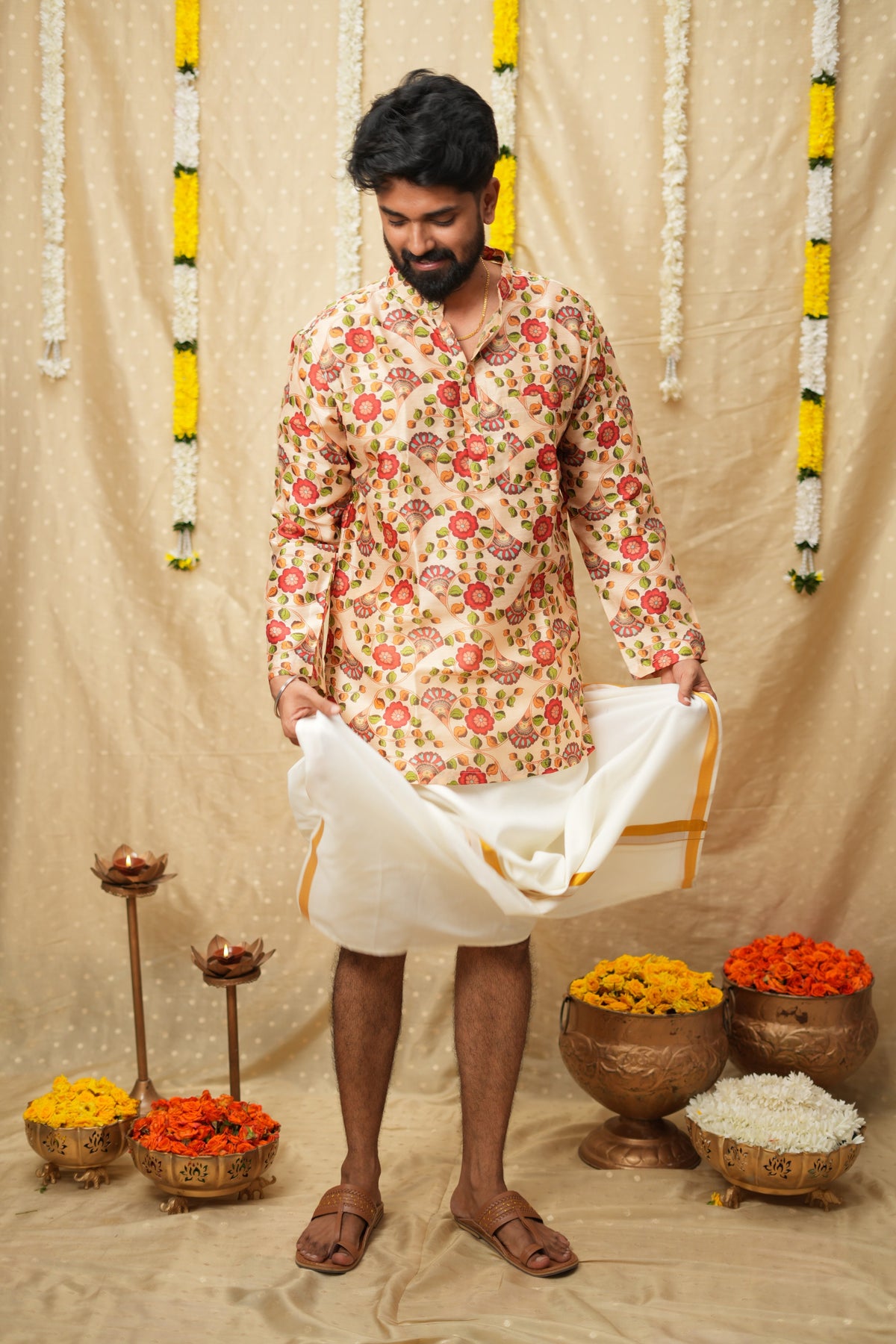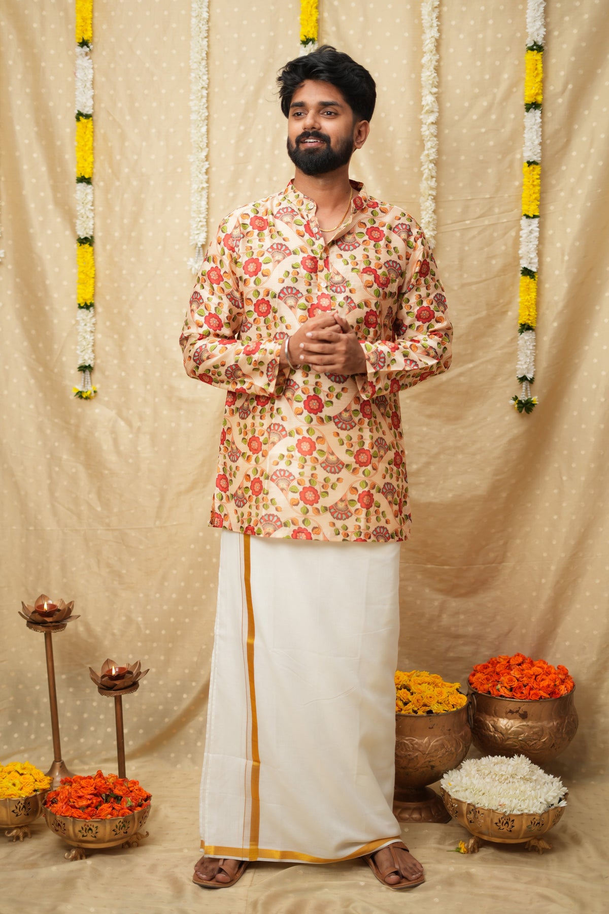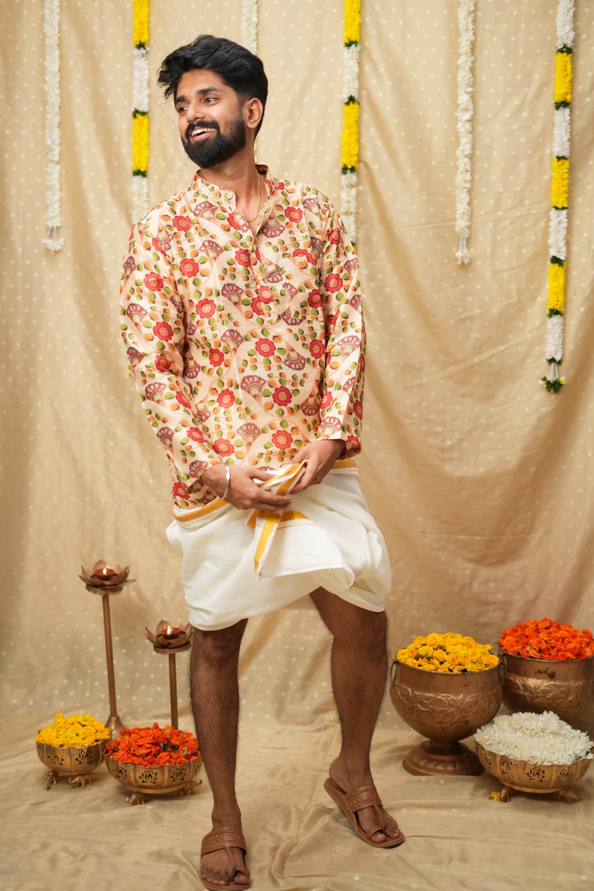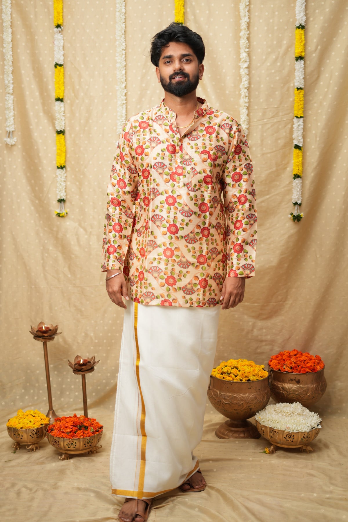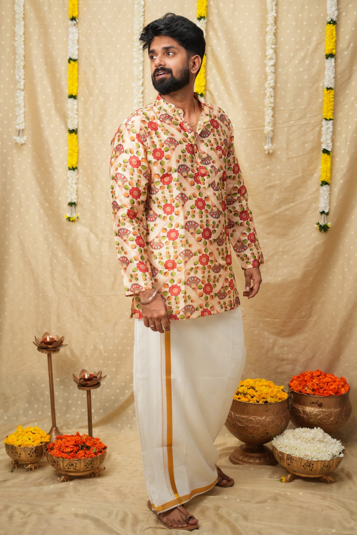This Beige Kurta Shirt is crafted from premium silken Chanderi with timeless Kalamkari-inspired prints. Featuring a mandarin collar with a button placket and full sleeves, it blends festive elegance with everyday cultural charm. Perfect for weddings, temple visits, or festive gatherings, this shirt adds a touch of heritage sophistication to modern men’s ethnic wear."