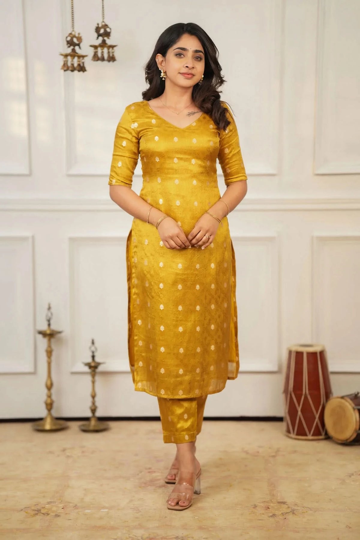 The Ayra Gold Co-Ord Set is an elegant fusion of minimal design and festive charm. Tailored in shimmer brocade silk with subtle zari buttis, this straight kurta paired with slim-fit pants offers both comfort and regality. Perfect for semi-formal gatherings, wedding functions, and festive evenings, Ayra brings understated luxury in a golden hue that never goes out of style."