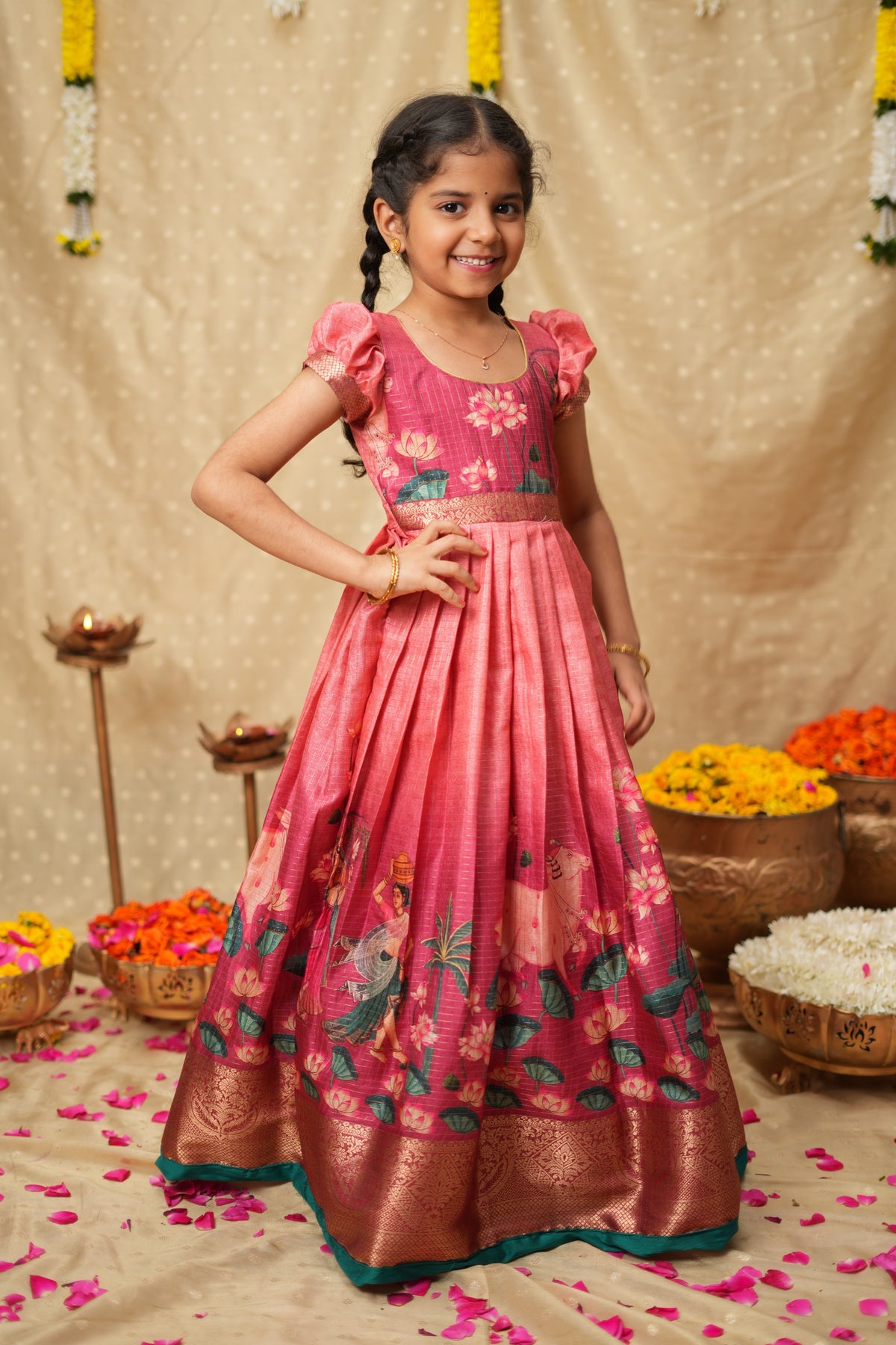 The Nikazhya Pink Frock Mini is a charming blend of tradition and festivity, designed especially for little girls. Crafted in Pichwai print dola silk, the gown radiates elegance with its vibrant floral prints and zari-woven hemline. The puff sleeves and round neckline add a playful yet refined touch, while the flared pleats give it a flowy silhouette perfect for twirling at weddings, temple visits, and festive celebrations."