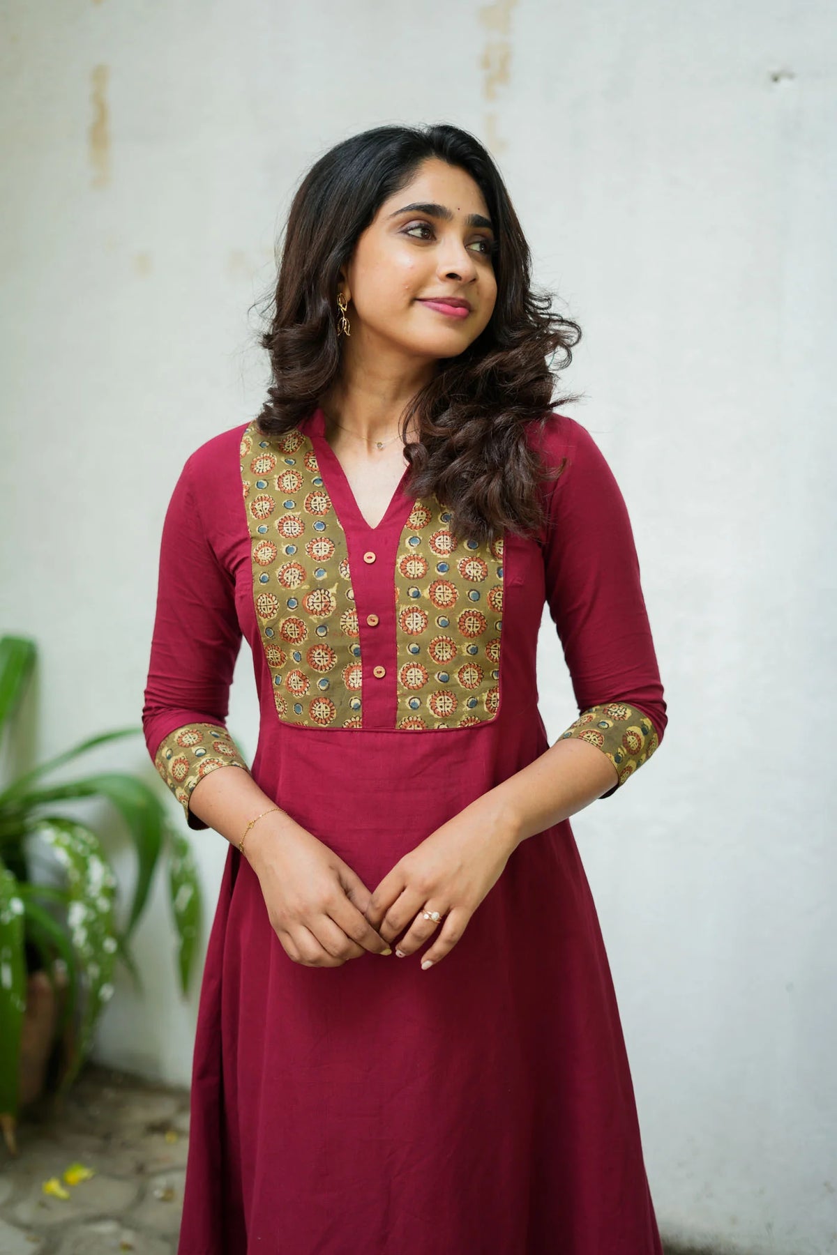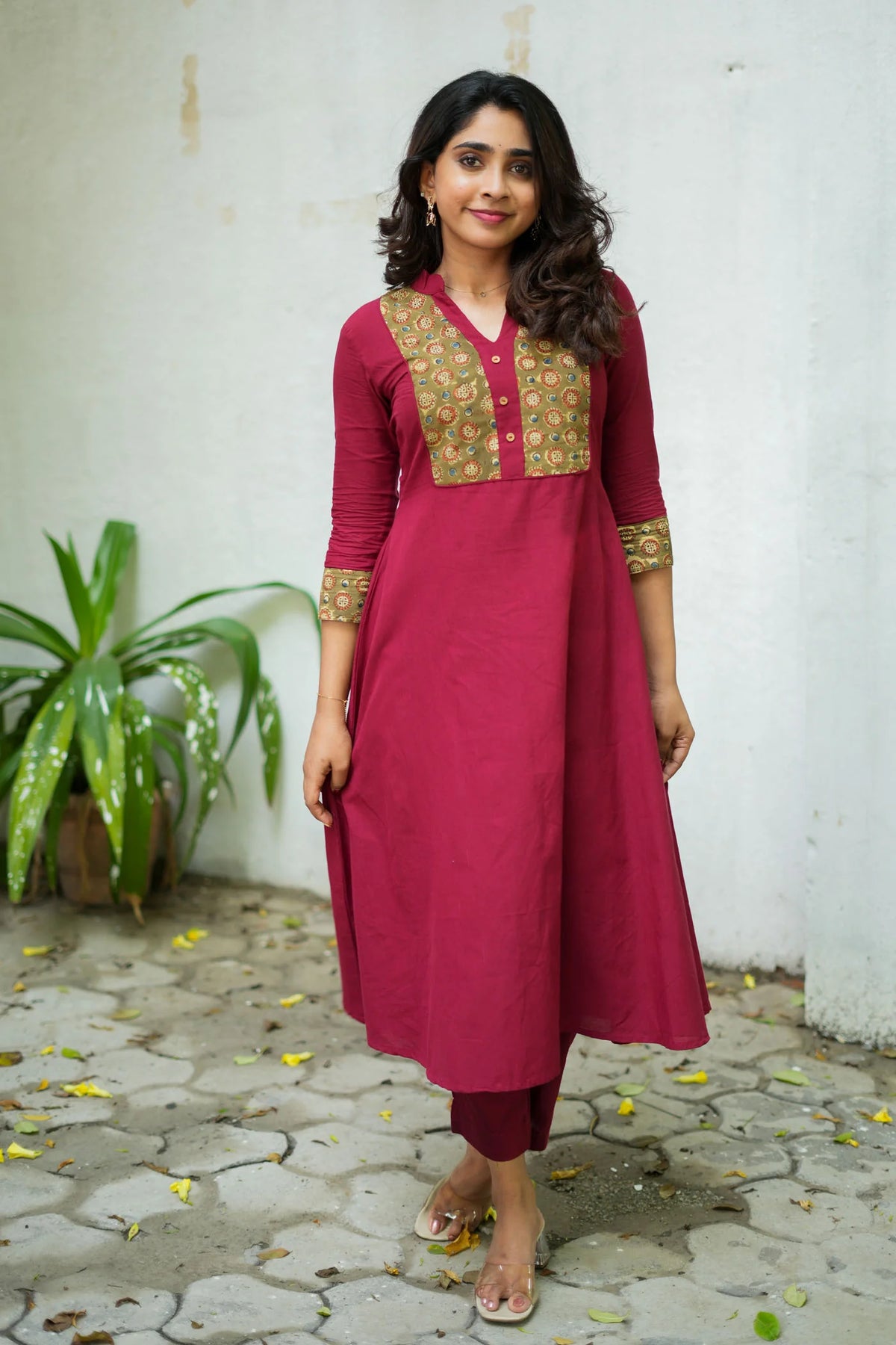 The Pranazhini Maroon Kurta Set is crafted in handwoven cotton with intricate ajrakh block-printed patches on the yoke and cuffs, giving it a refined ethnic touch. With its A-line silhouette, V-neckline, and calf-length hemline, this set blends comfort and sophistication—making it perfect for office hours, casual outings, or subtle festive gatherings."