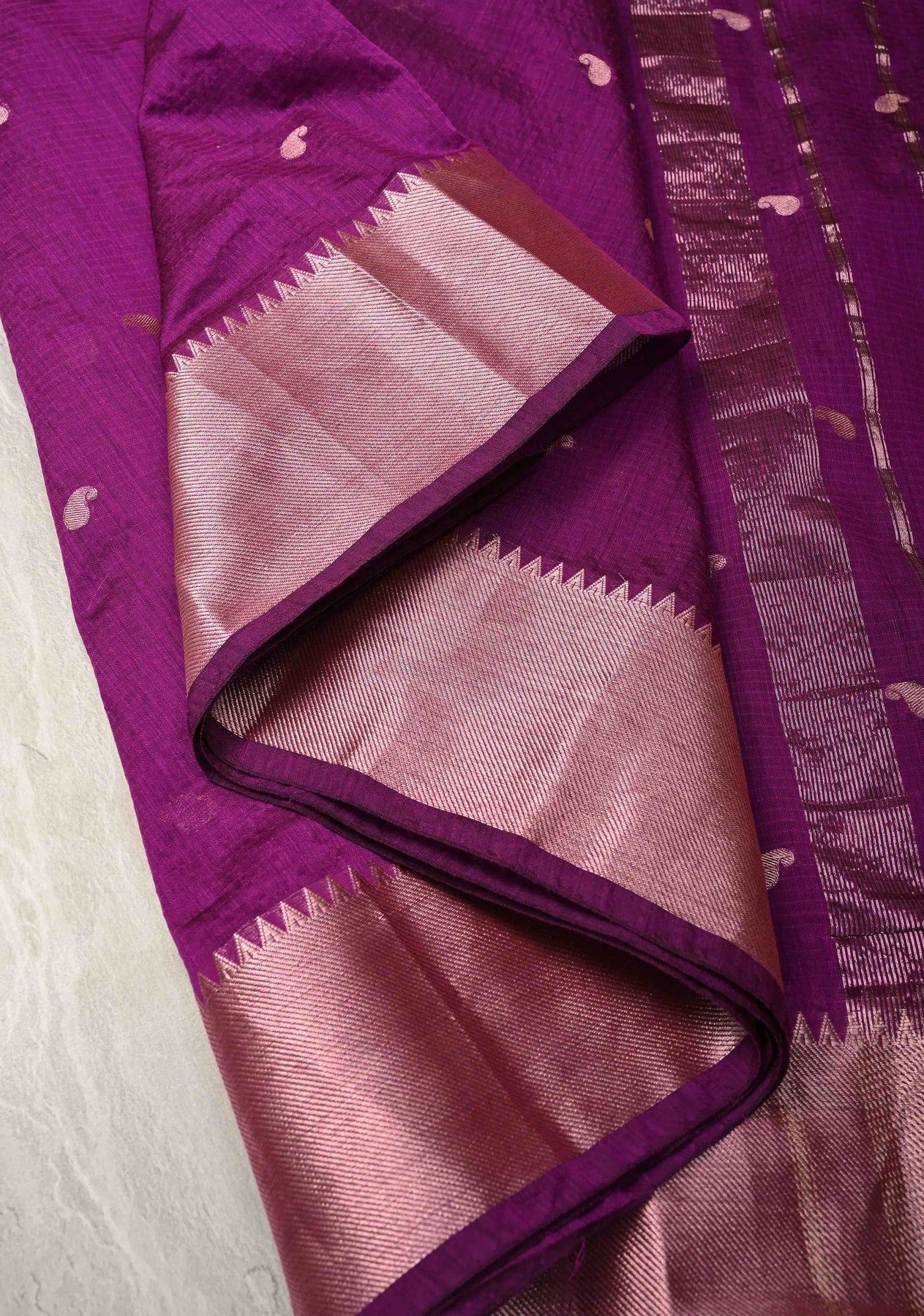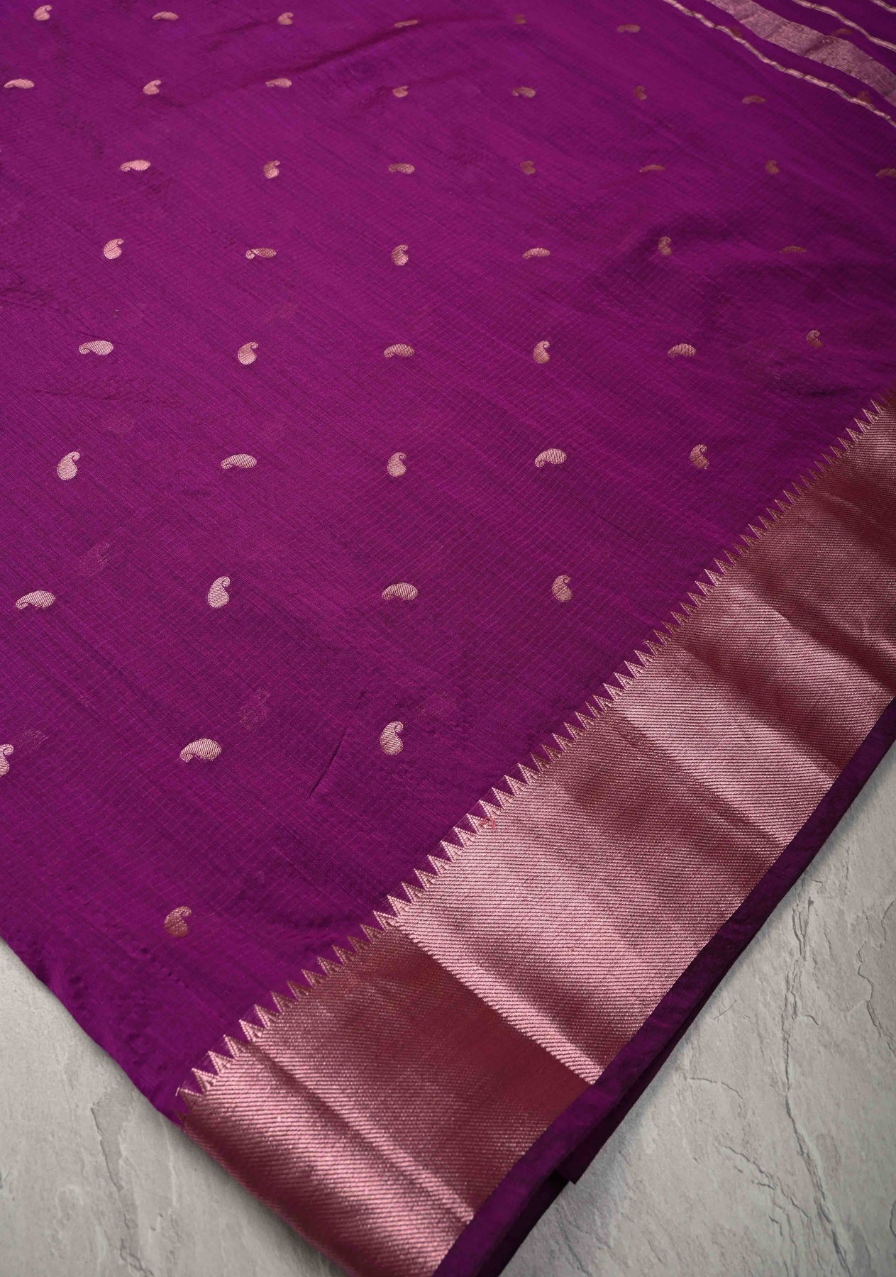 Embrace timeless elegance with this Purple Semi Silk Saree, designed to make a lasting impression. The saree is adorned with delicate zari paisley buttis spread gracefully across the fabric, adding a touch of traditional charm. The Purple hue is beautifully complemented by a shimmering zari-woven border, enhancing its regal appeal. Lightweight and easy to drape, this saree is perfect for festive occasions, weddings, and cultural celebrations, offering a graceful blend of comfort and sophistication.