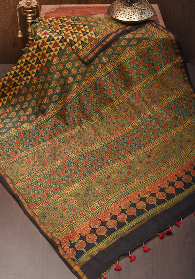 Ajrakh Hand Block Print on Chanderi Silk Cotton Saree with thin zari borders