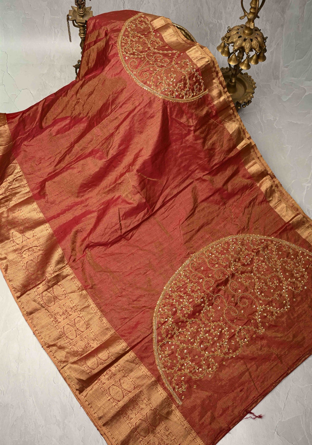 This Maroon Tissue Pure Raw Silk Kanjivaram Saree is a luxurious blend of rich tradition and artistic craftsmanship. Woven from pure raw silk with a subtle tissue finish, the saree boasts a maroon hue that radiates timeless elegance. The wide zari border adds regal grandeur, while intricate hand embellishments featuring sequins, cutdana, and moti (pearls) lend a touch of opulence and shimmer. Perfect for weddings, receptions, and grand festive occasions, this saree is a true statement piece that beautifully merges heritage with handcrafted beauty.