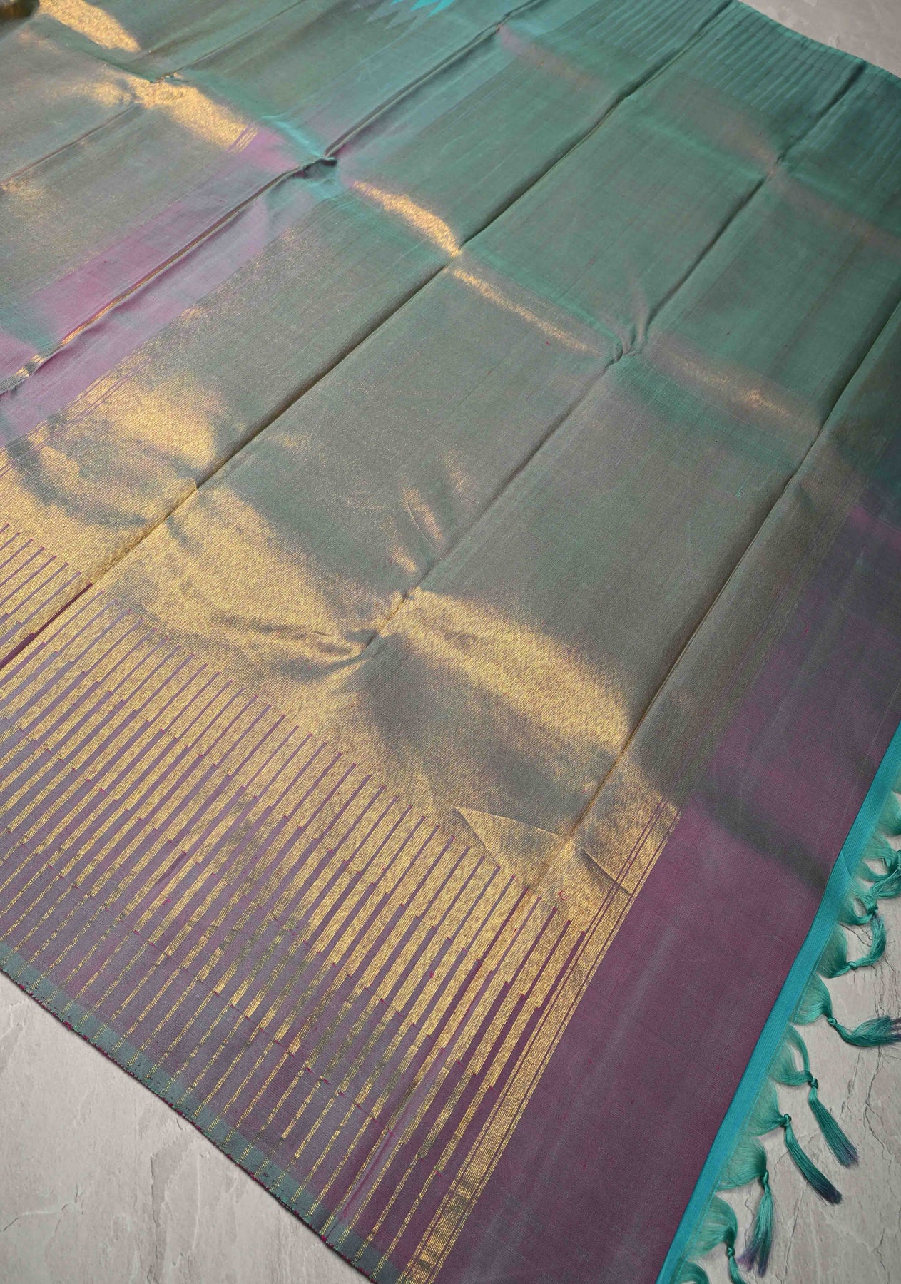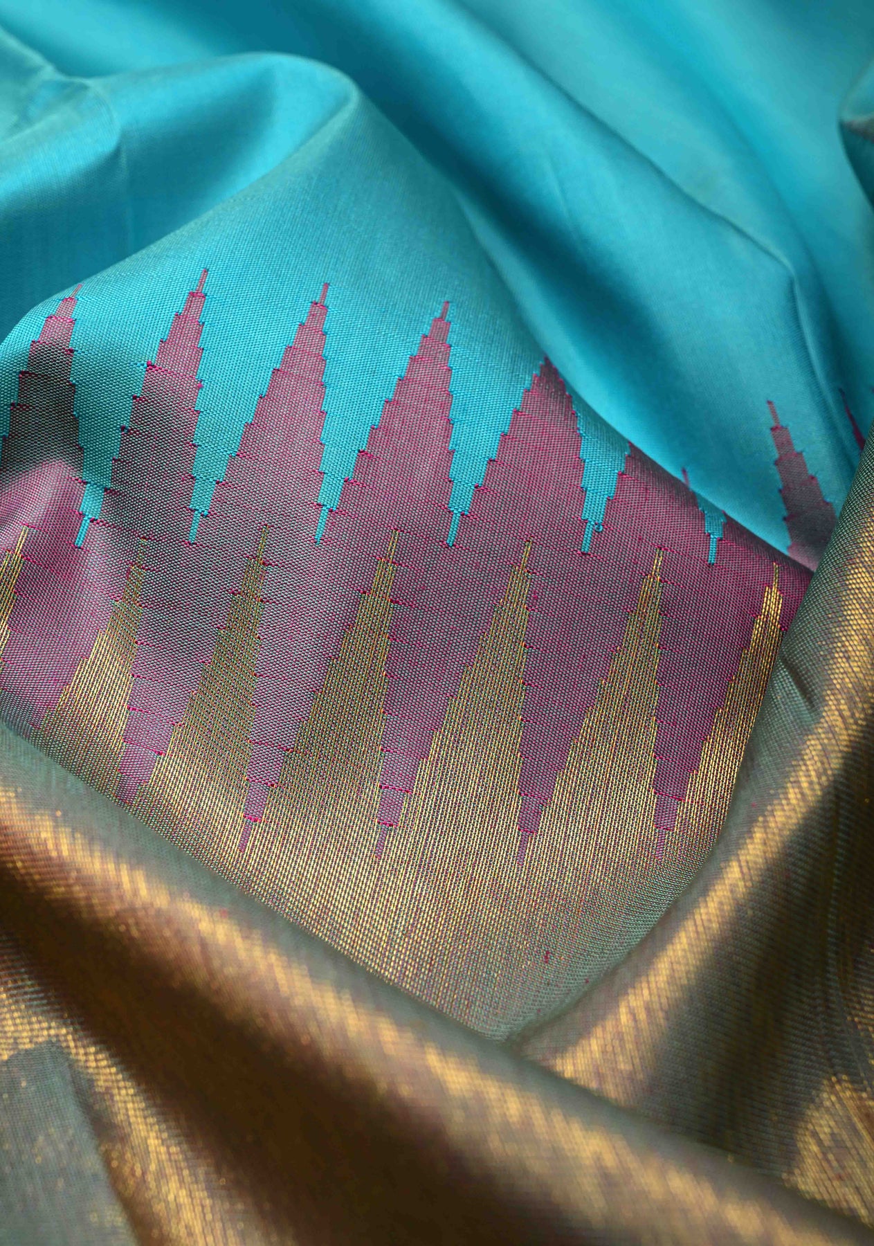 Embrace timeless elegance with this Lagoon Blue Pure Kanjivaram Silk Saree, featuring a majestic Dusty Mauve Rising Temple Border that adds a touch of divine grandeur to every drape. Handwoven in lustrous silk, the saree is beautifully contrasted with a rich Pallu in a complementary hue, enhancing its visual appeal. A perfect blend of tradition and sophistication, this saree is ideal for weddings, festive occasions, and cultural celebrations.
