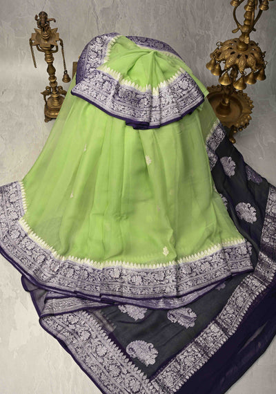 Sage Green Banarasi Chiffon Silk Saree with Silver Tone Zari Buttas and Contast Zari Border| SILK MARK CERTIFIED