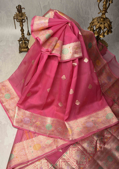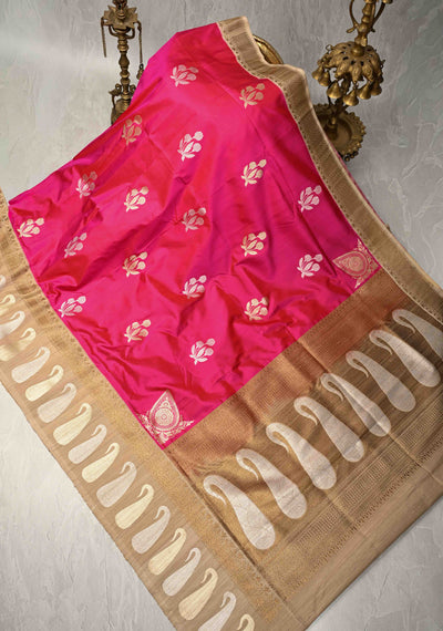 Hot Pink Banarasi Katan Silk Saree with Sona Rupa Floral Buttas and Distinct Motifs on border |SILK MARK CERTIFIED