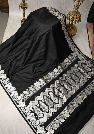 Black Mashru Silk Saree with Silver Zari Floral Border | SILK MARK CERTIFIED