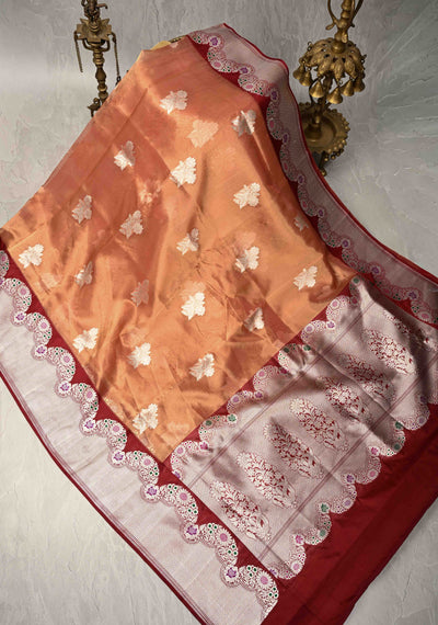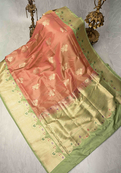 Peach Dual tone Bnarasi Katan Tissue Silk Saree with Floral Zari Buttas and Contrast Meenakari Zari Border | SILK MARK CERTIFIED