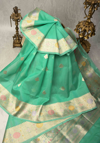 Pista Green Meenakari Deisign on Banarasi Kora Silk Saree with Floral Brocade and Zari Border | SILK MARK CERTIFIED