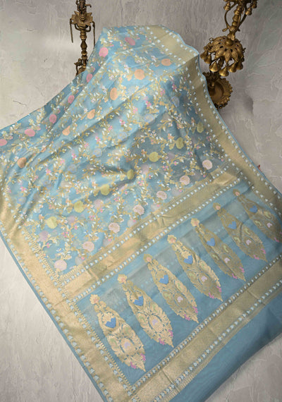 Powder Blue Banarasi Cotton Jamdani Style Cutwork Saree with Meenakari Jaal Weave