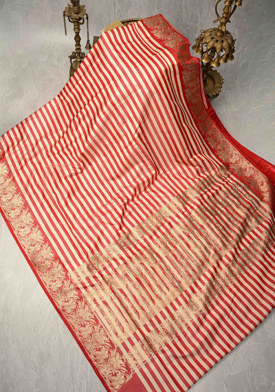 Red-Cream Banarasi Mashru Silk Saree with Horizontal Stripes and Floral Zari Border | SILK MARK CERTIFIED