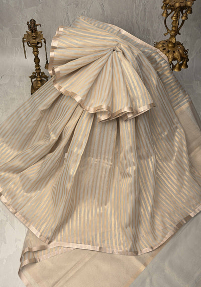 Cream Semi Kora Saree with Tissue Stripes and Minimal Zari Border